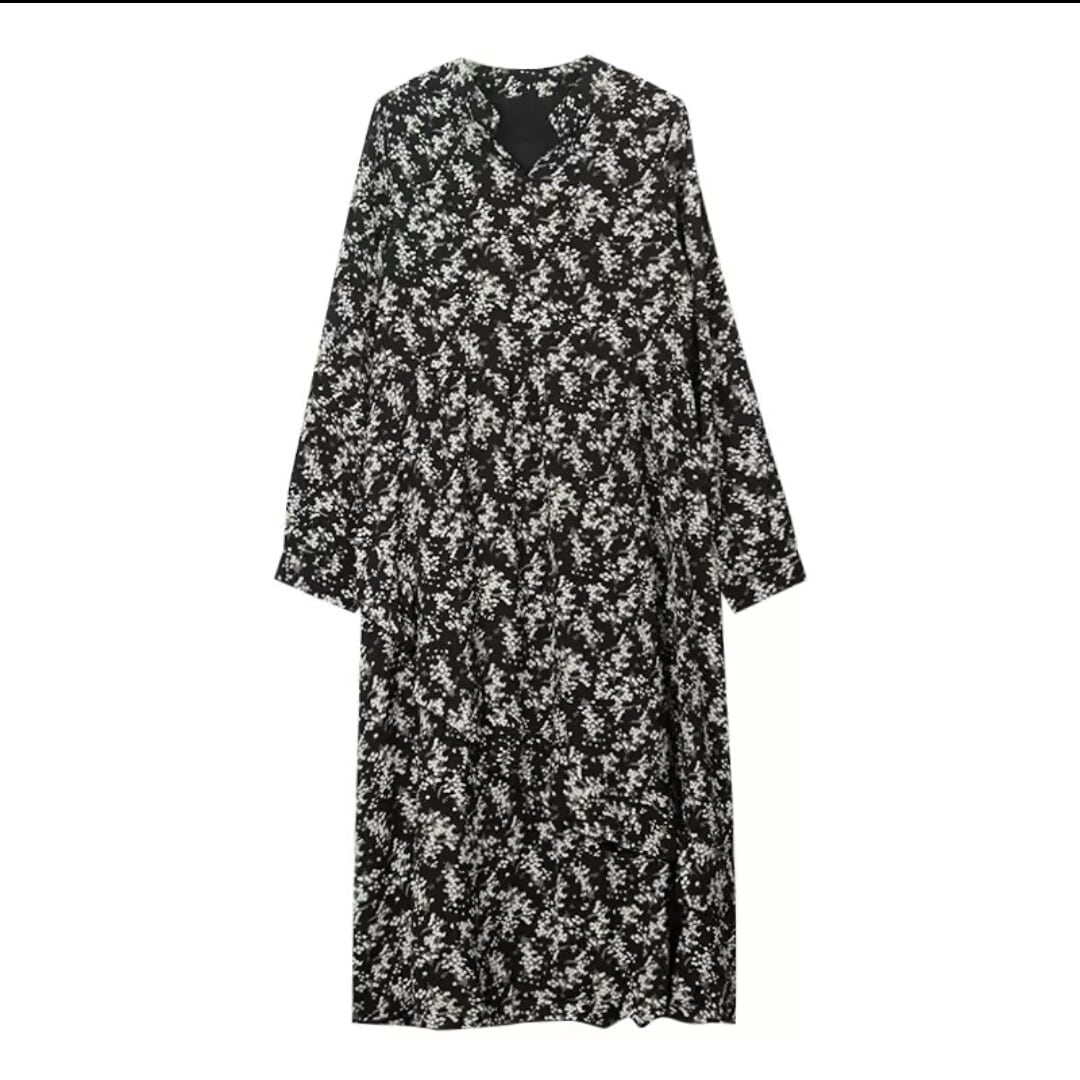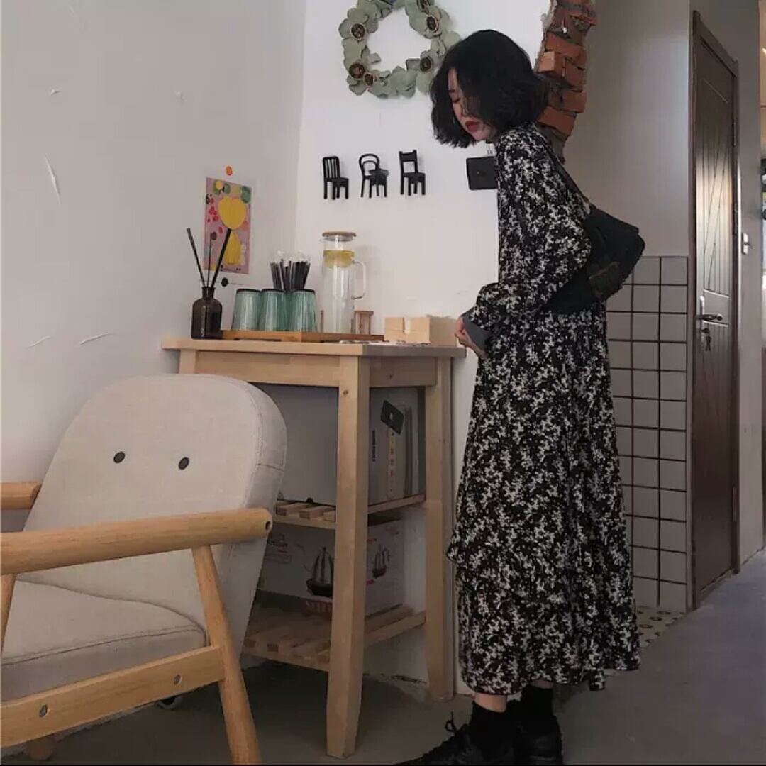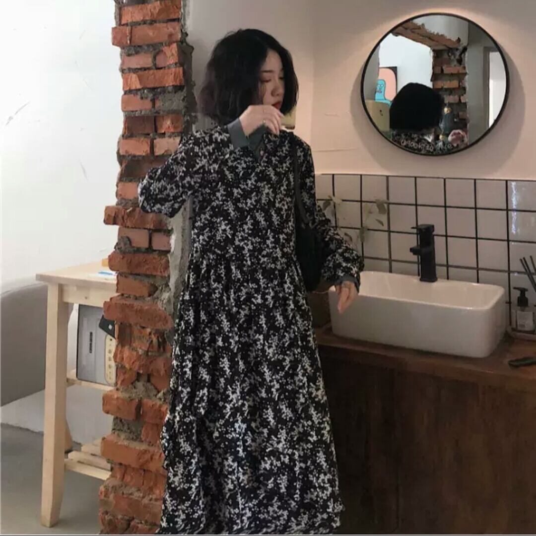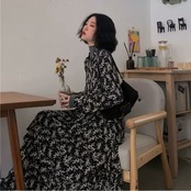 ロング丈 花柄 シフォン ワンピース ドレス 黒 Vネック ランタンスリーブ 大人 カジュアル 可愛い シンプル キレイめ 上品 お出かけ お買い物 デート 女子会 秋冬 春 通学 学生 通勤 韓国ファッション
