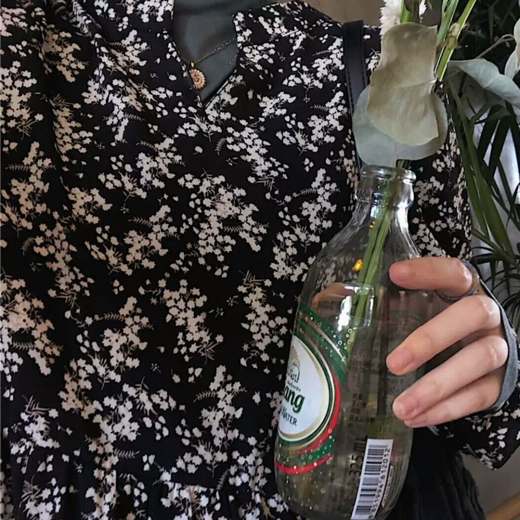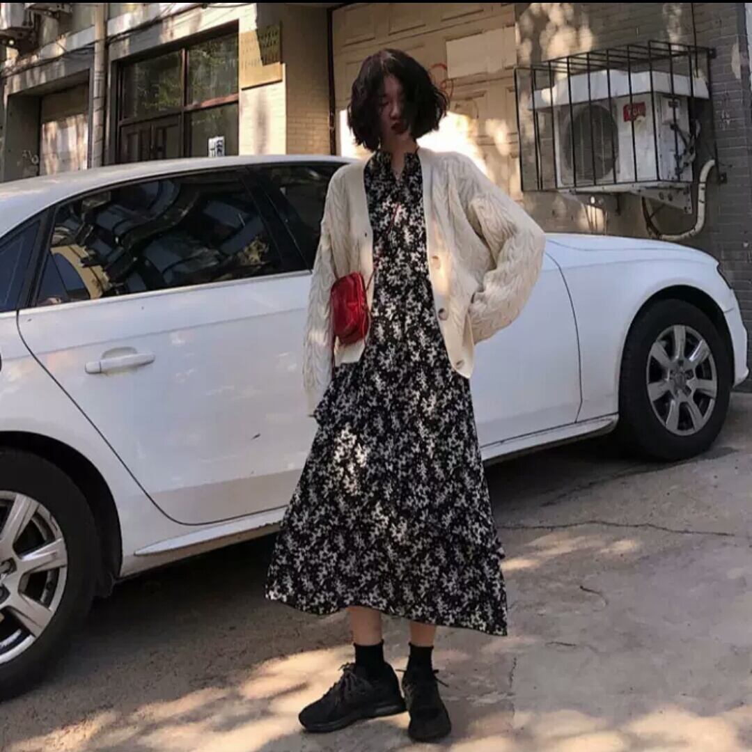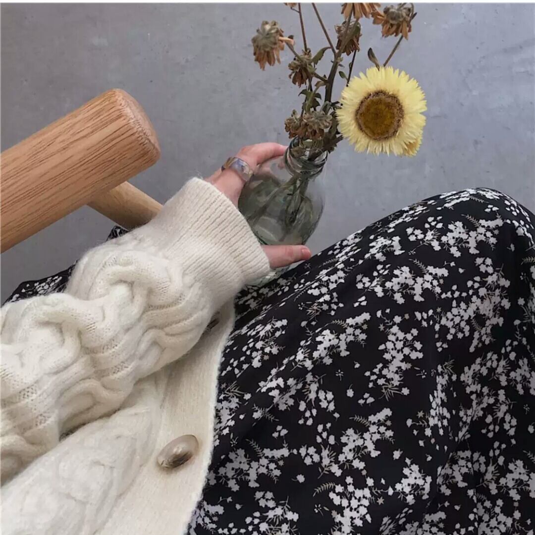 ロング丈 花柄 シフォン ワンピース ドレス 黒 Vネック ランタンスリーブ 大人 カジュアル 可愛い シンプル キレイめ 上品 お出かけ お買い物 デート 女子会 秋冬 春 通学 学生 通勤 韓国ファッション