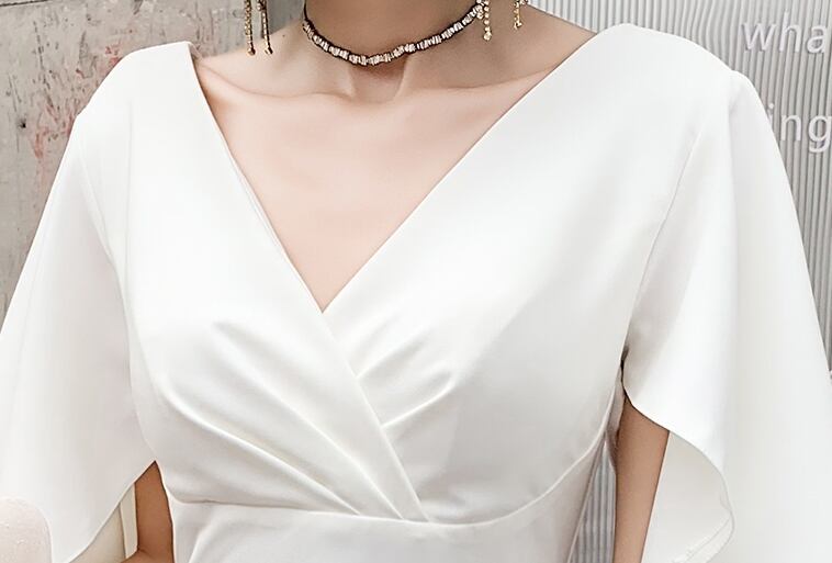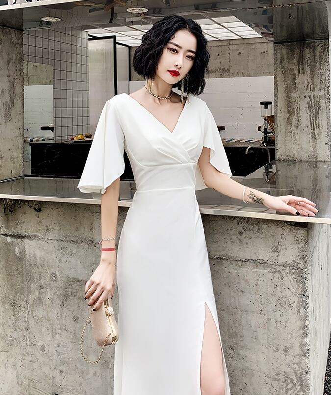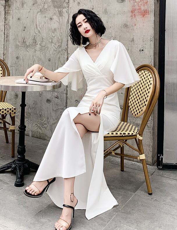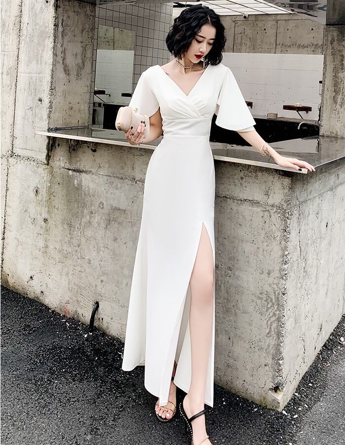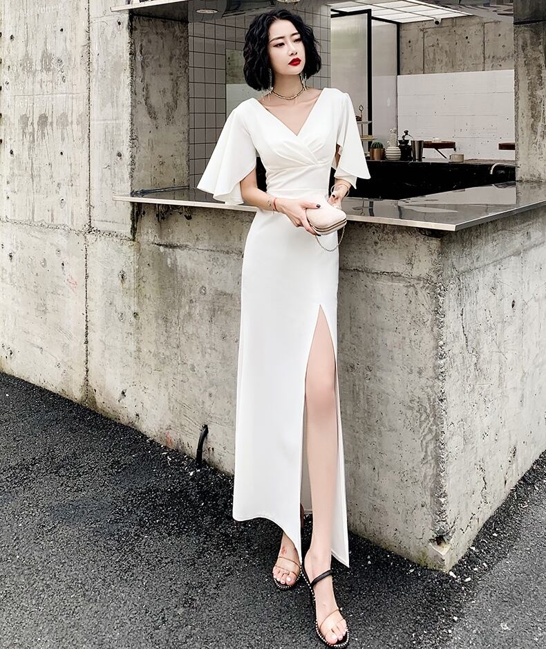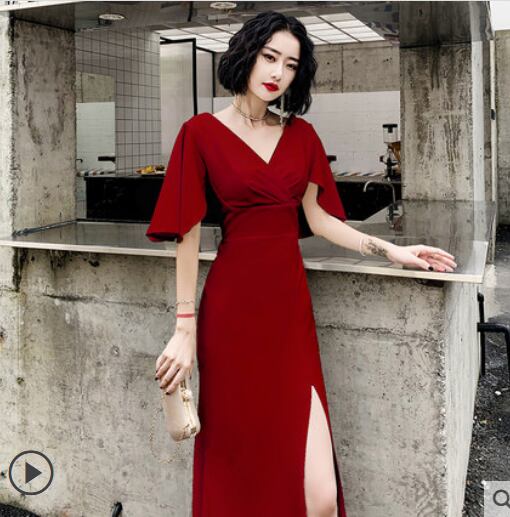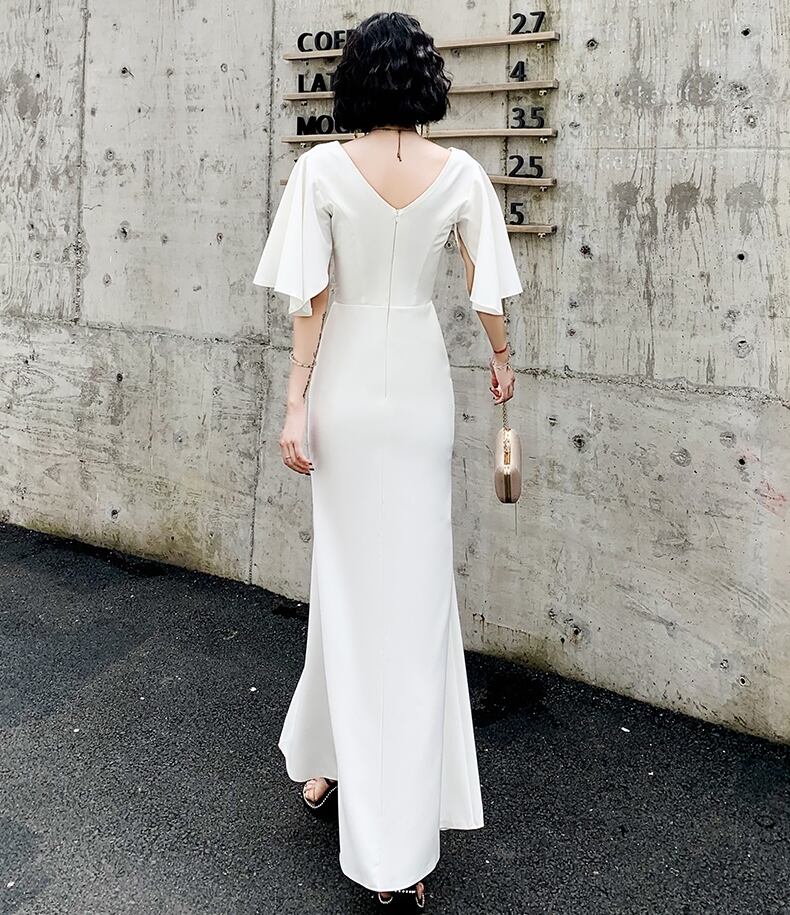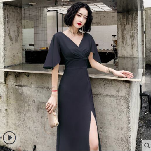 全3色 ドレス ワンピース ロング丈 マキシ丈 タイト Vネック フレアスリーブ 半袖 スリット パーティー イブニング 結婚式 お呼ばれ エレガント シック 無地