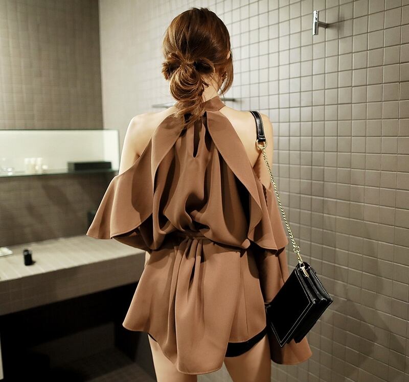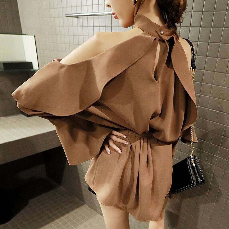 全3色 トップス ブラウス 肩見せ フリル ゆったり フレアスリーブ ホルターネック 長袖 上品 きれいめ セクシー ゆったり ハイネック 秋 夏 春