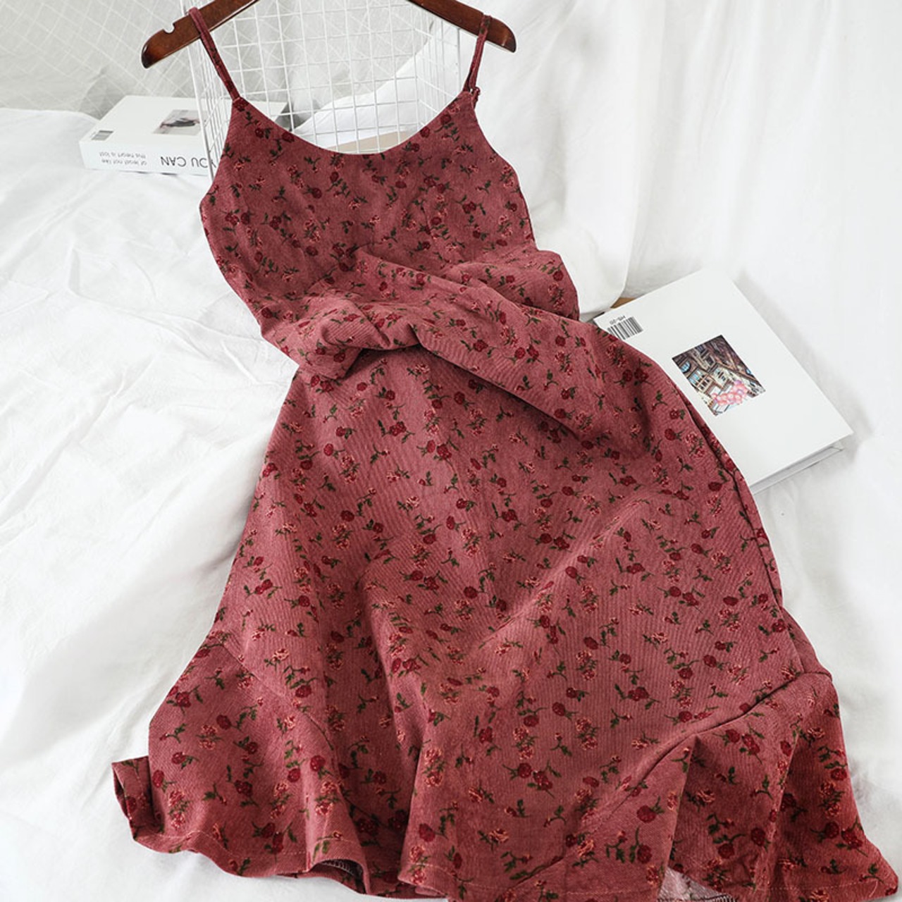全3色 ワンピース ミモレ丈 キャミワンピース フレア フリル カジュアル 大人可愛い デート リソース デコルテ ガーリー 花柄 夏 春