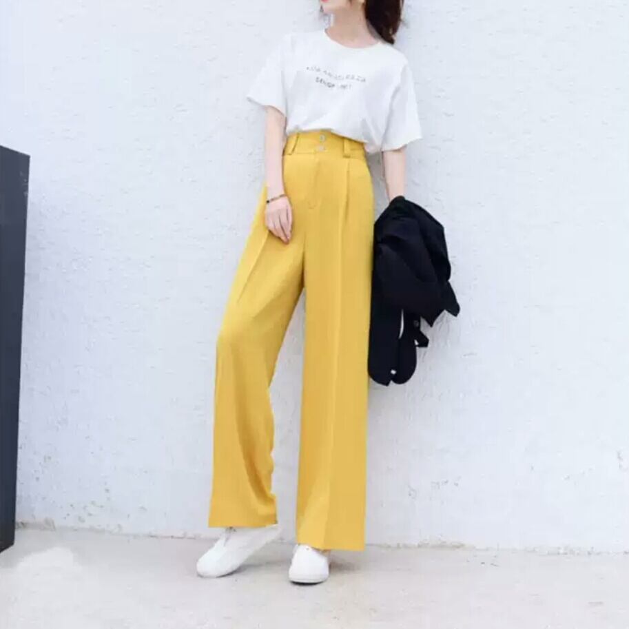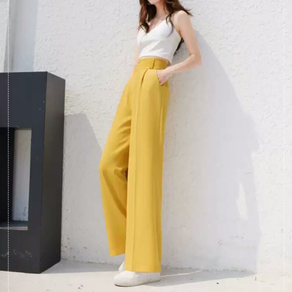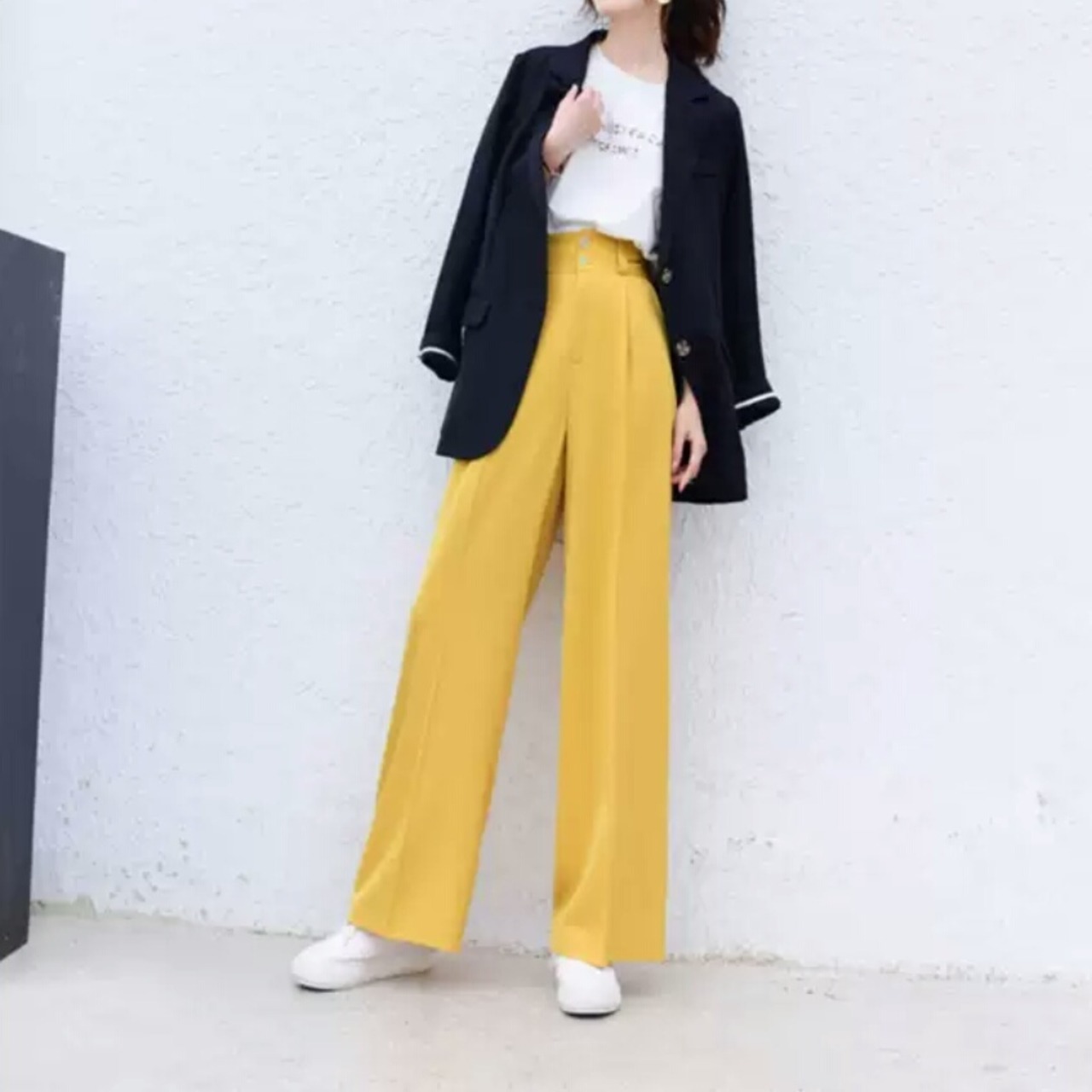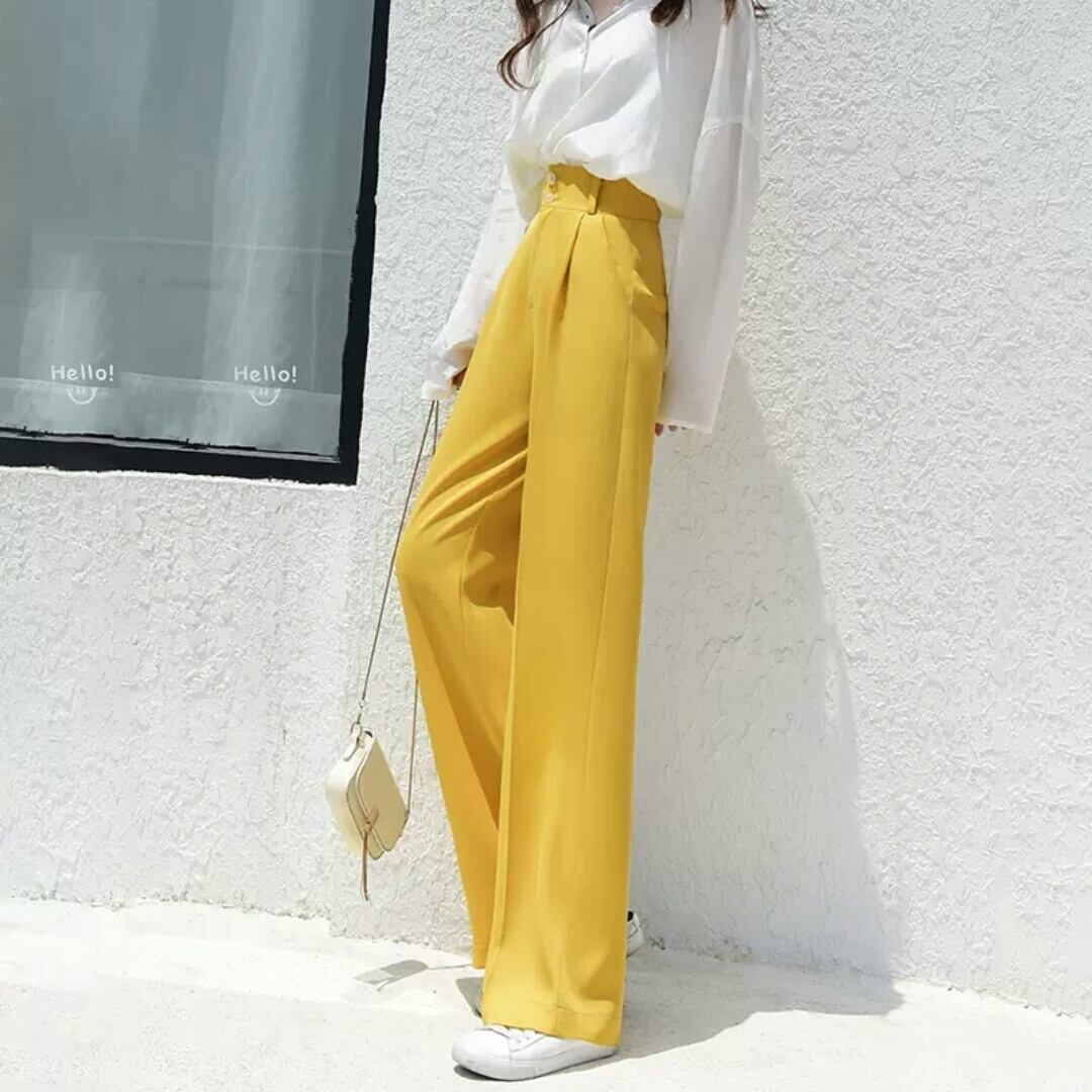 ハイウエスト ワイドレッグパンツ ボトムス パンツ 大人 キレイめ カジュアル 薄手 無地 シンプル イエロー 黄色 お出かけ お買い物 デート 女子会 秋冬 春 通学 学生 通勤 韓国ファッション
