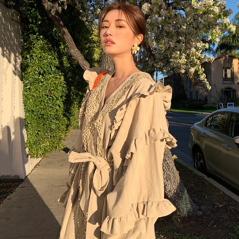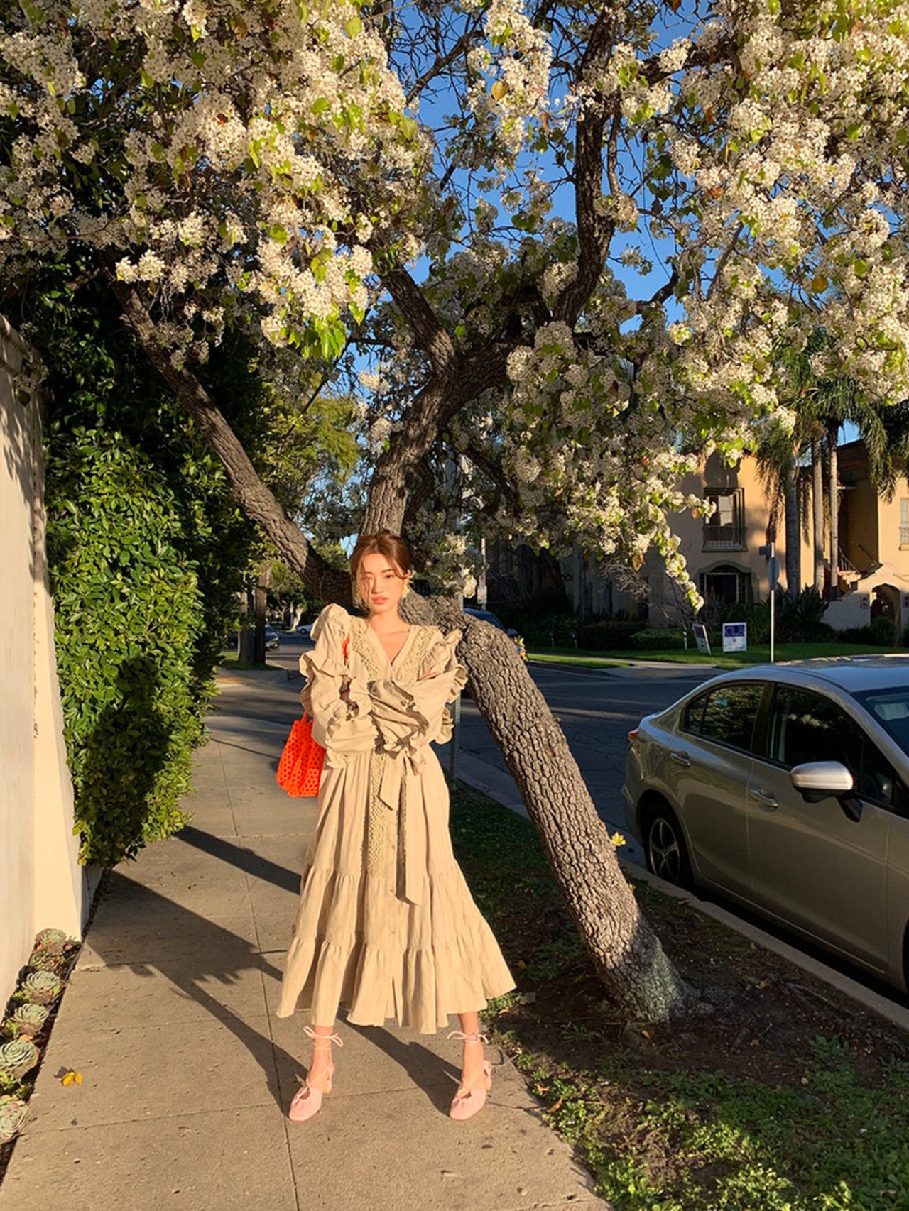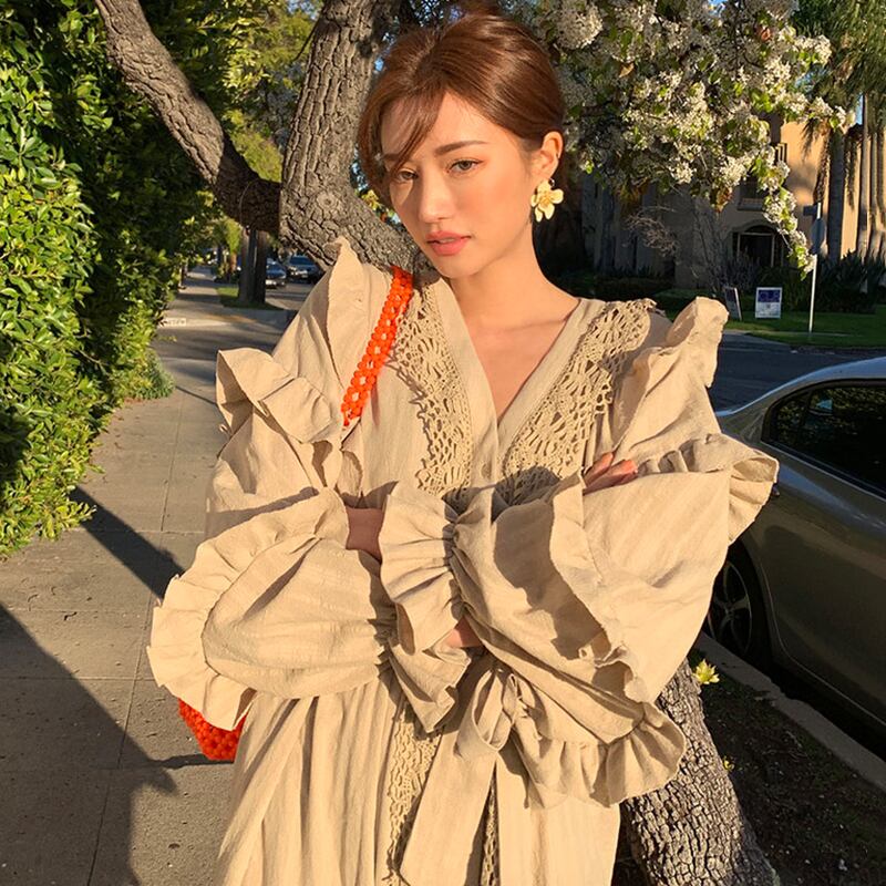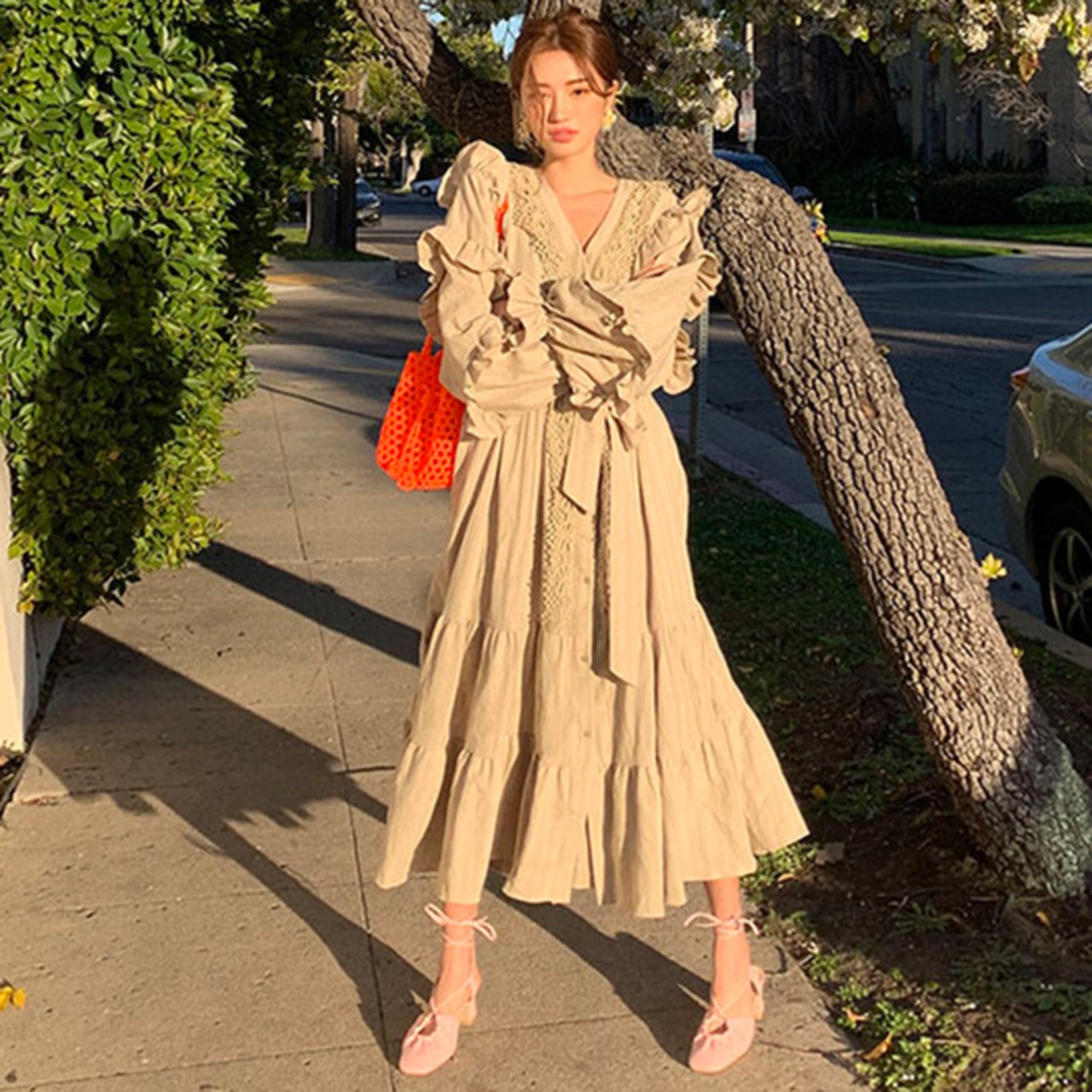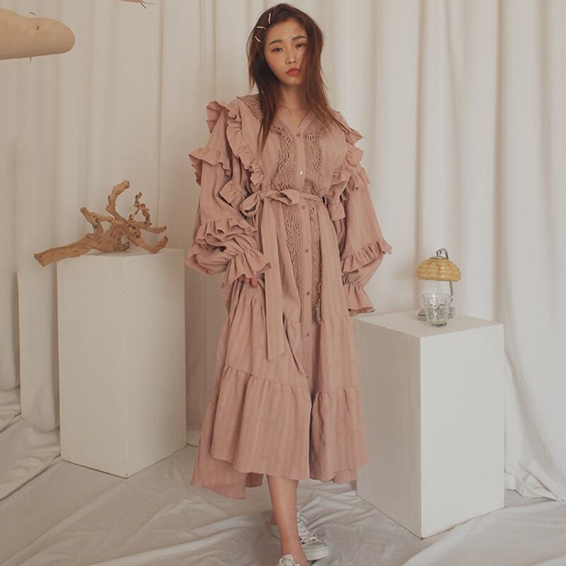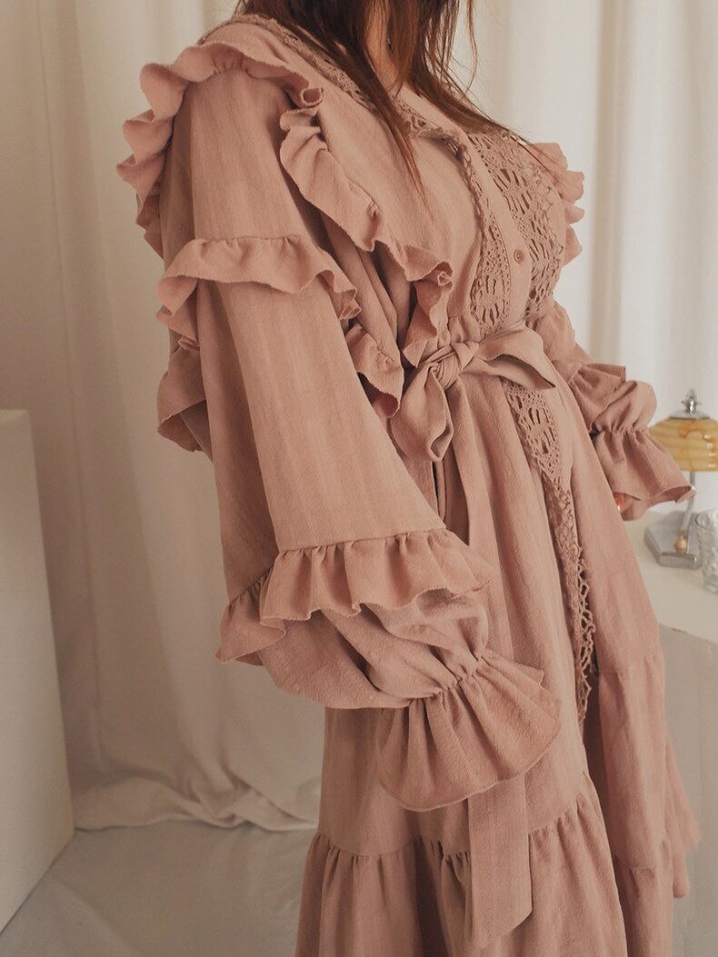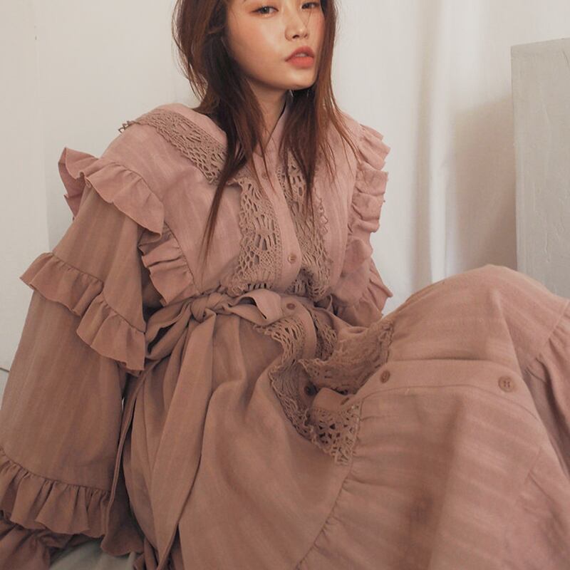 全2色 ワンピース ロング丈 ティアード フリル ゆったり ウエストリボン フレアスリーブ Vネック フロントボタン ガーリー 長袖 可愛い カジュアル レトロ 秋 春 冬