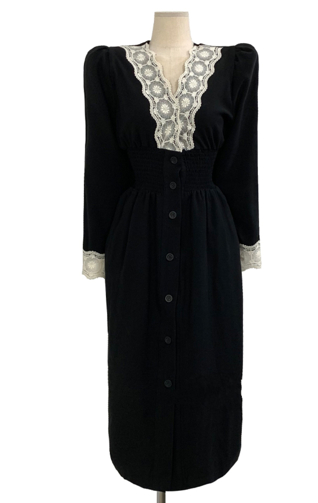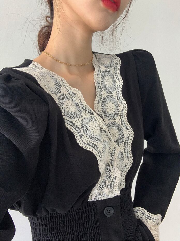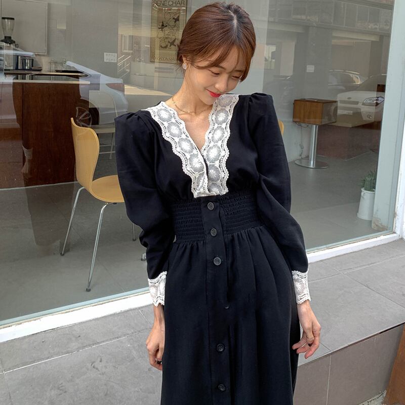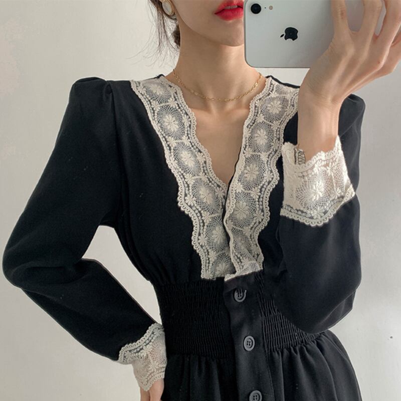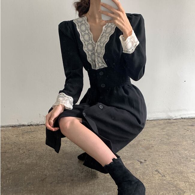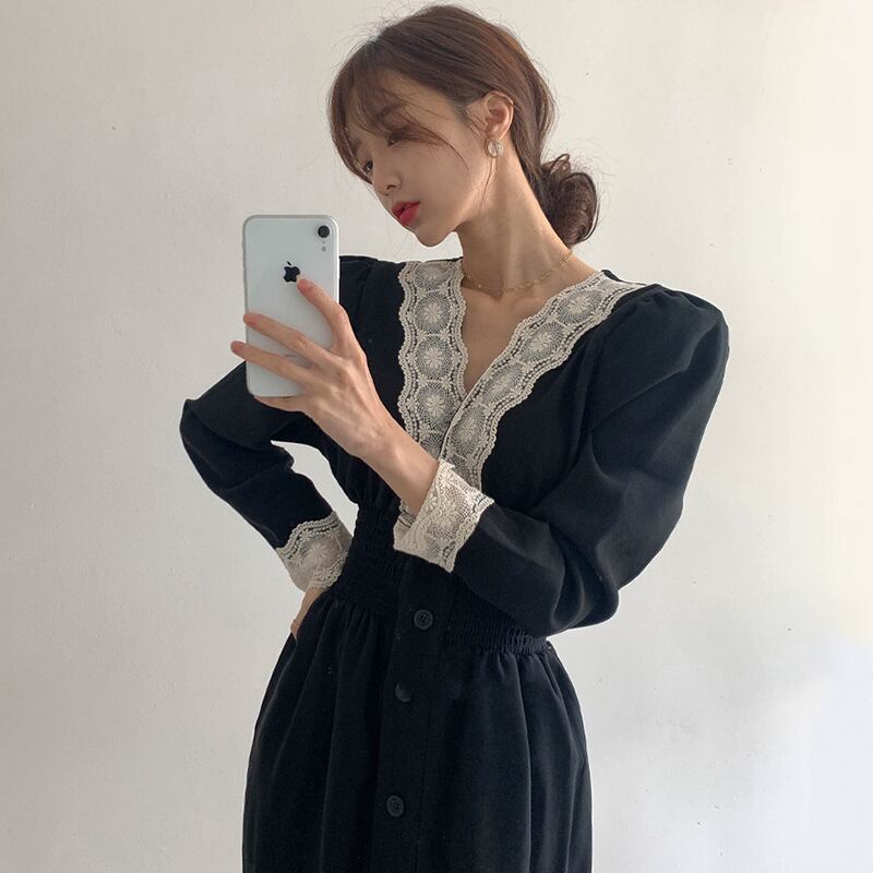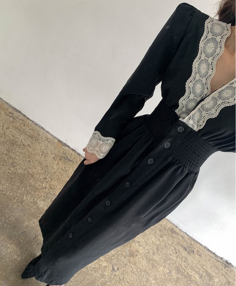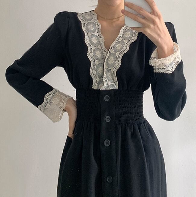 ワンピース レース ボタン ミモレ丈 ロング丈 ウエストマーク Vネック 長袖 大人可愛い デート カジュアル 韓国ファッション 上品 きれいめ スリム 秋 春 冬