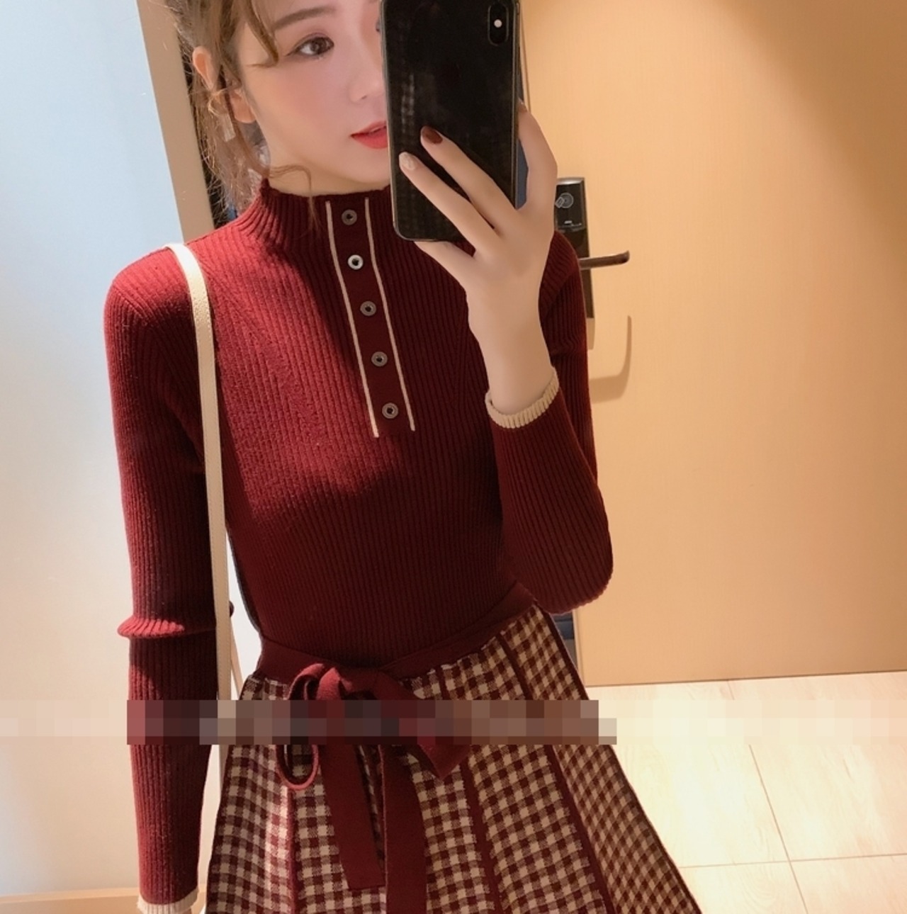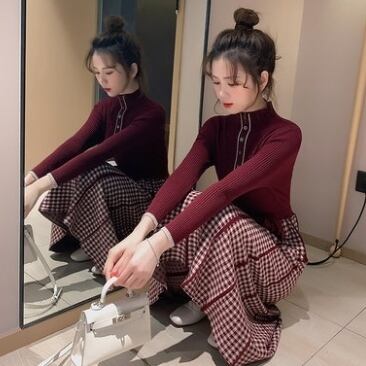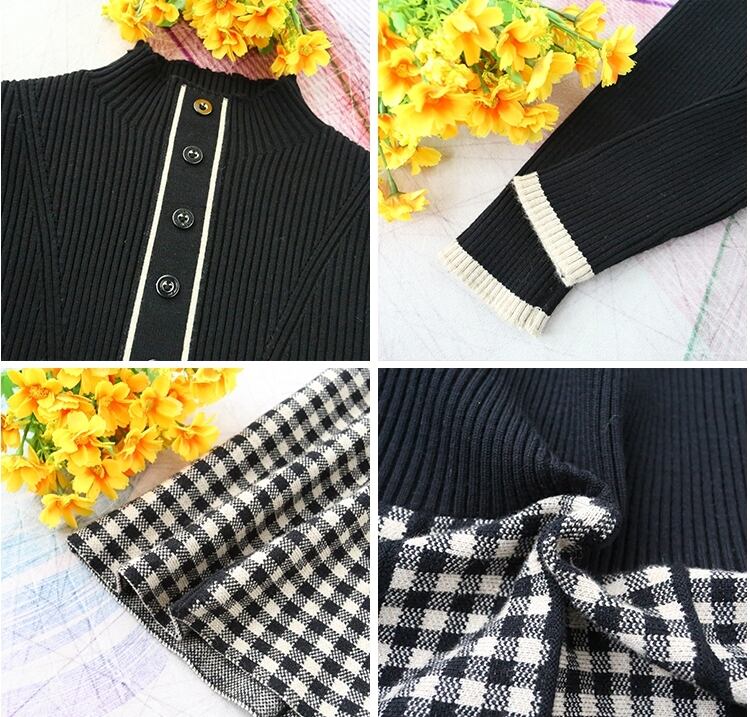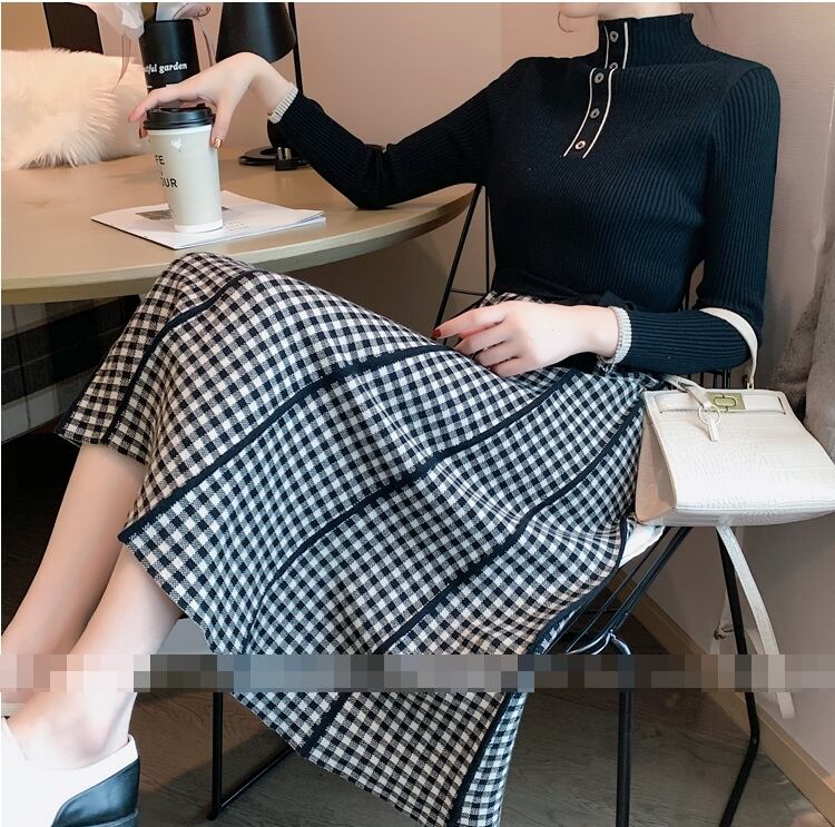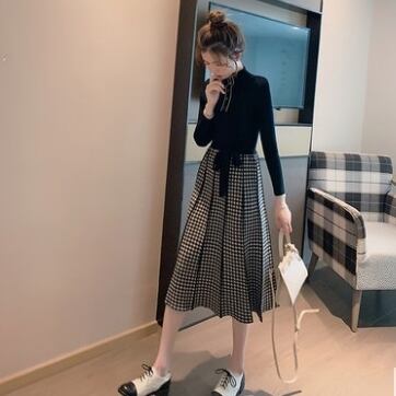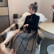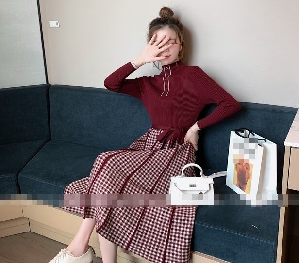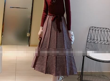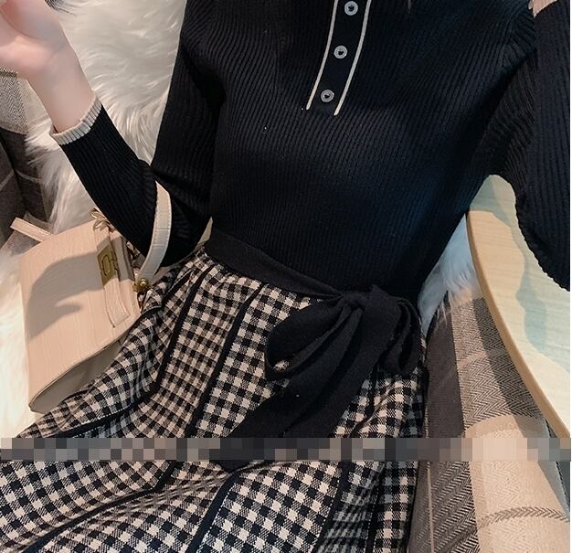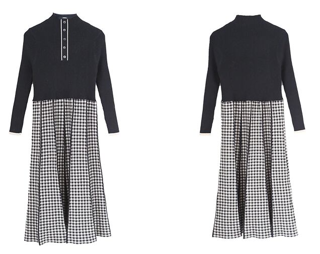 全2色 ワンピース ミモレ丈 プリーツ チェック柄 ウエストリボン ニット スリム ボタン ハイネック Aライン 長袖 きれいめ カジュアル 上品 大人可愛い デート 秋 夏 春