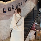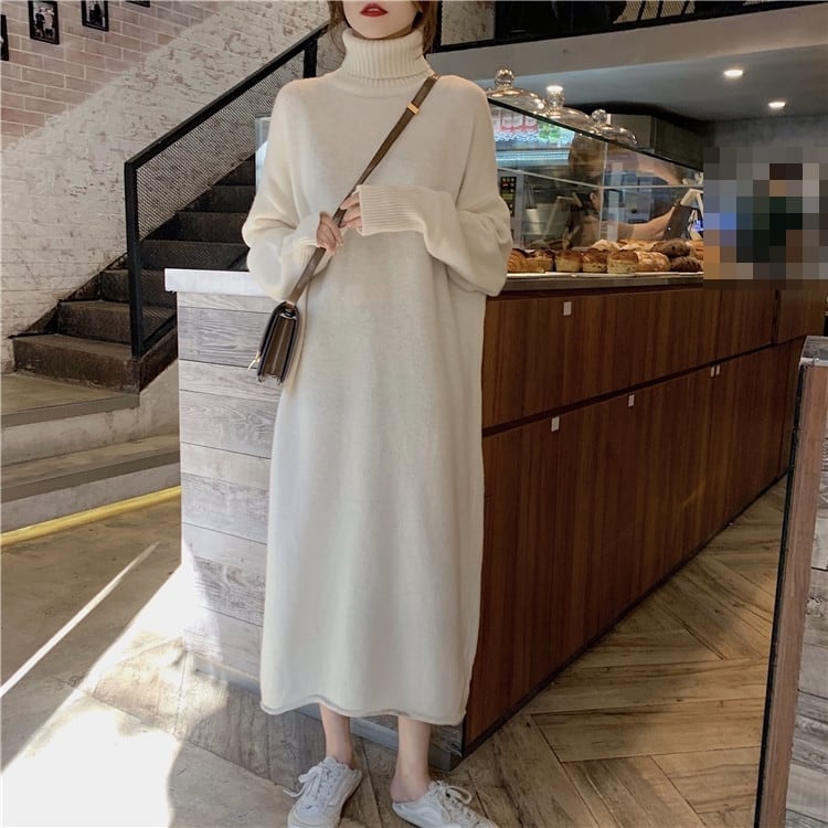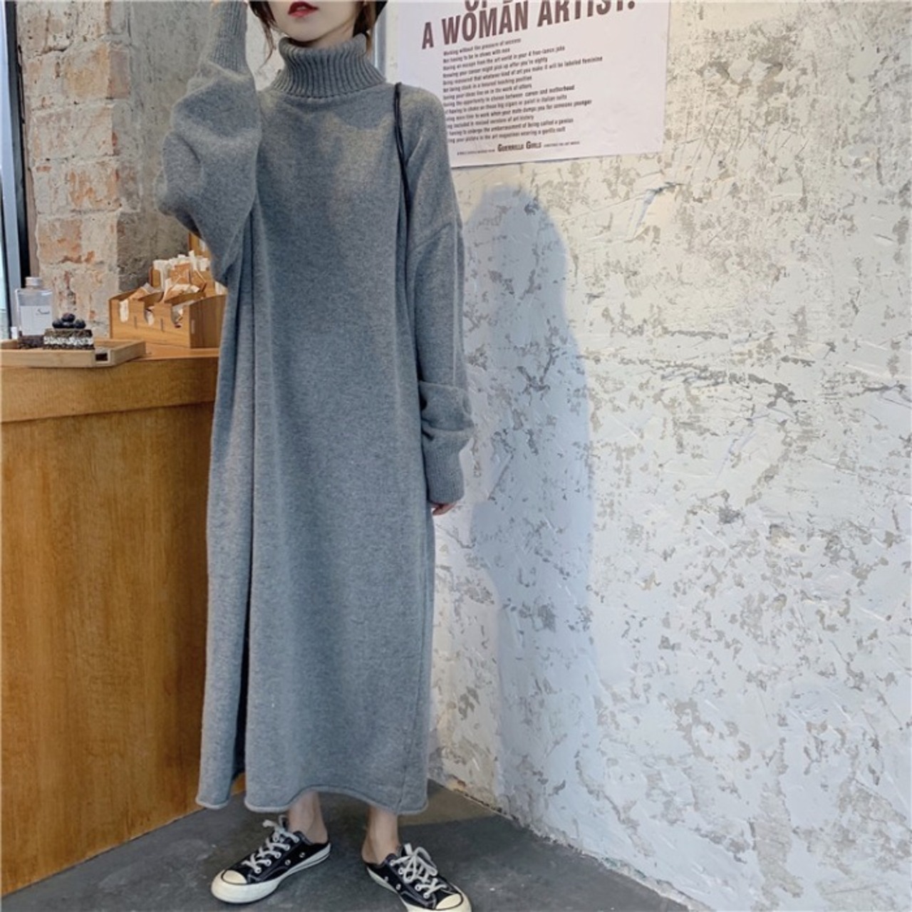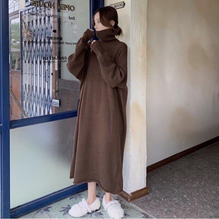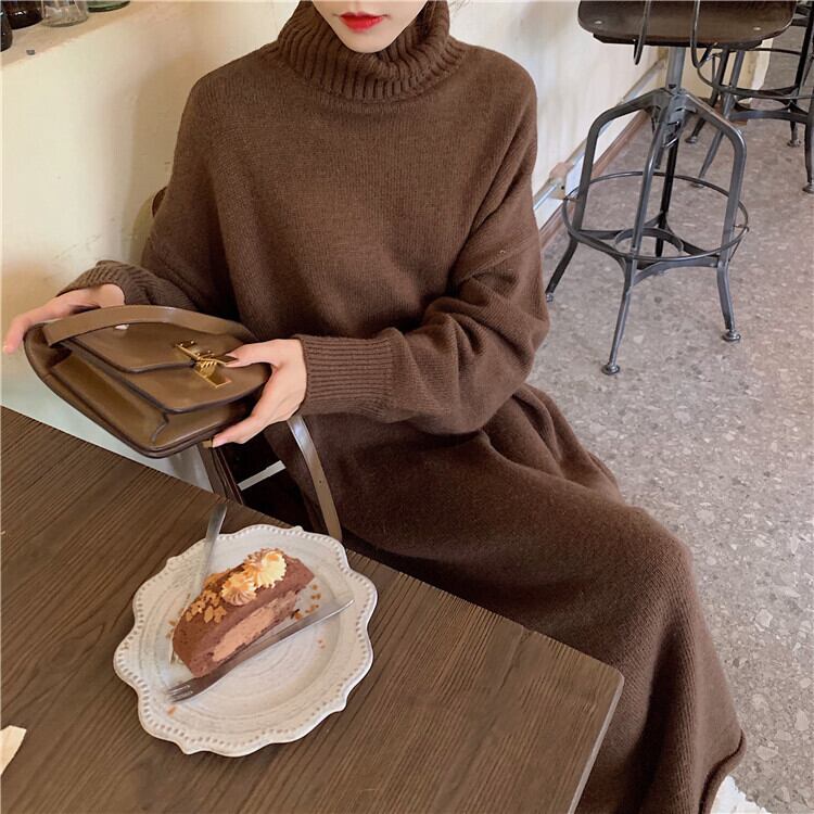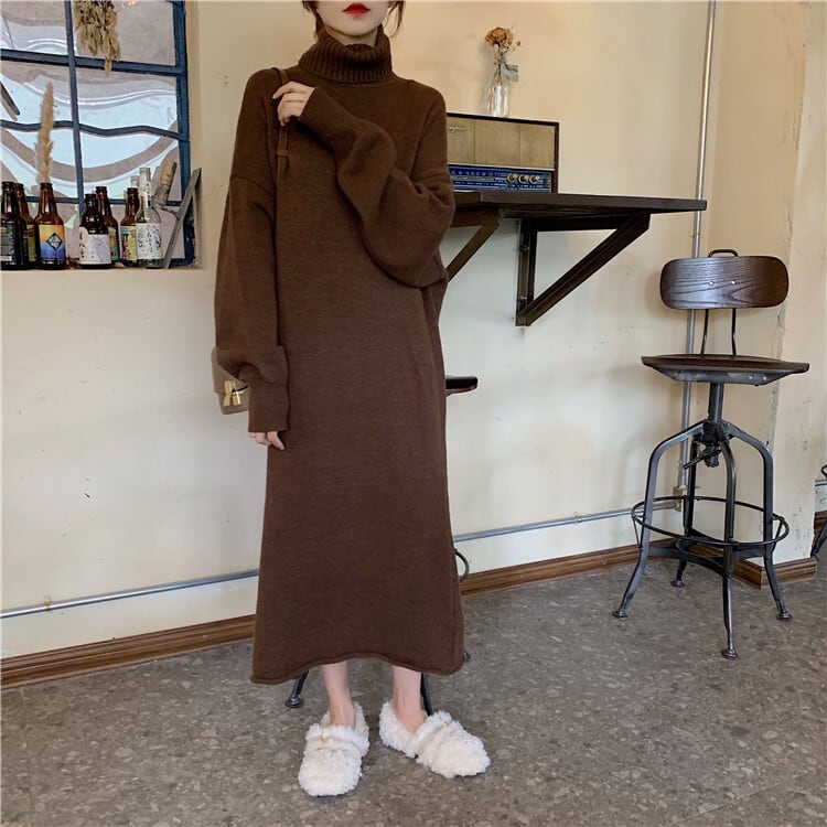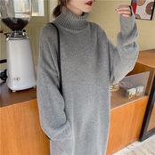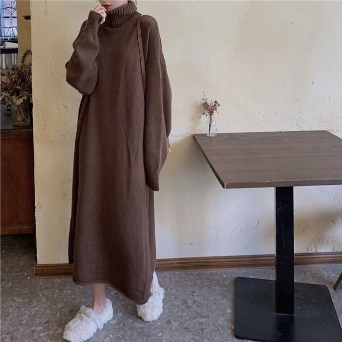 全3色 ワンピース ロング丈 ニットワンピース 長袖 ゆったり オーバーサイズ ハイネック カジュアル ラフ デイリー 韓国ファッション 大人 レトロ タートルネック 秋 冬 春