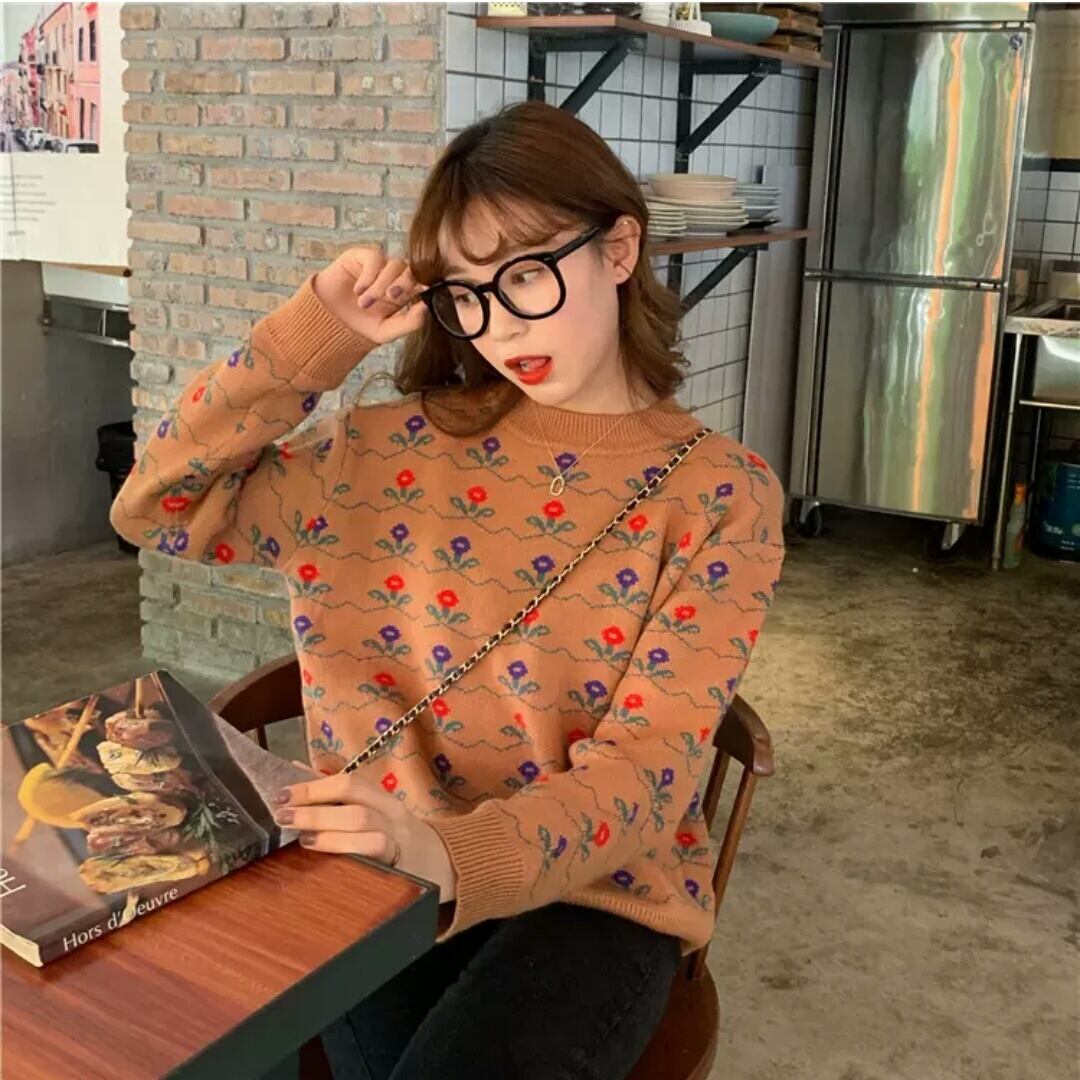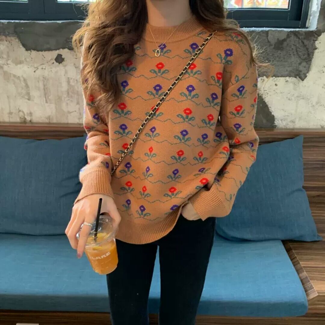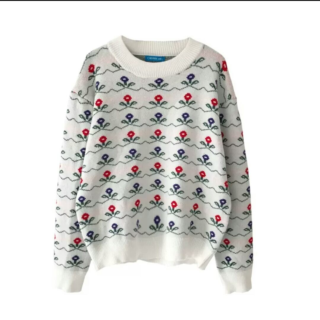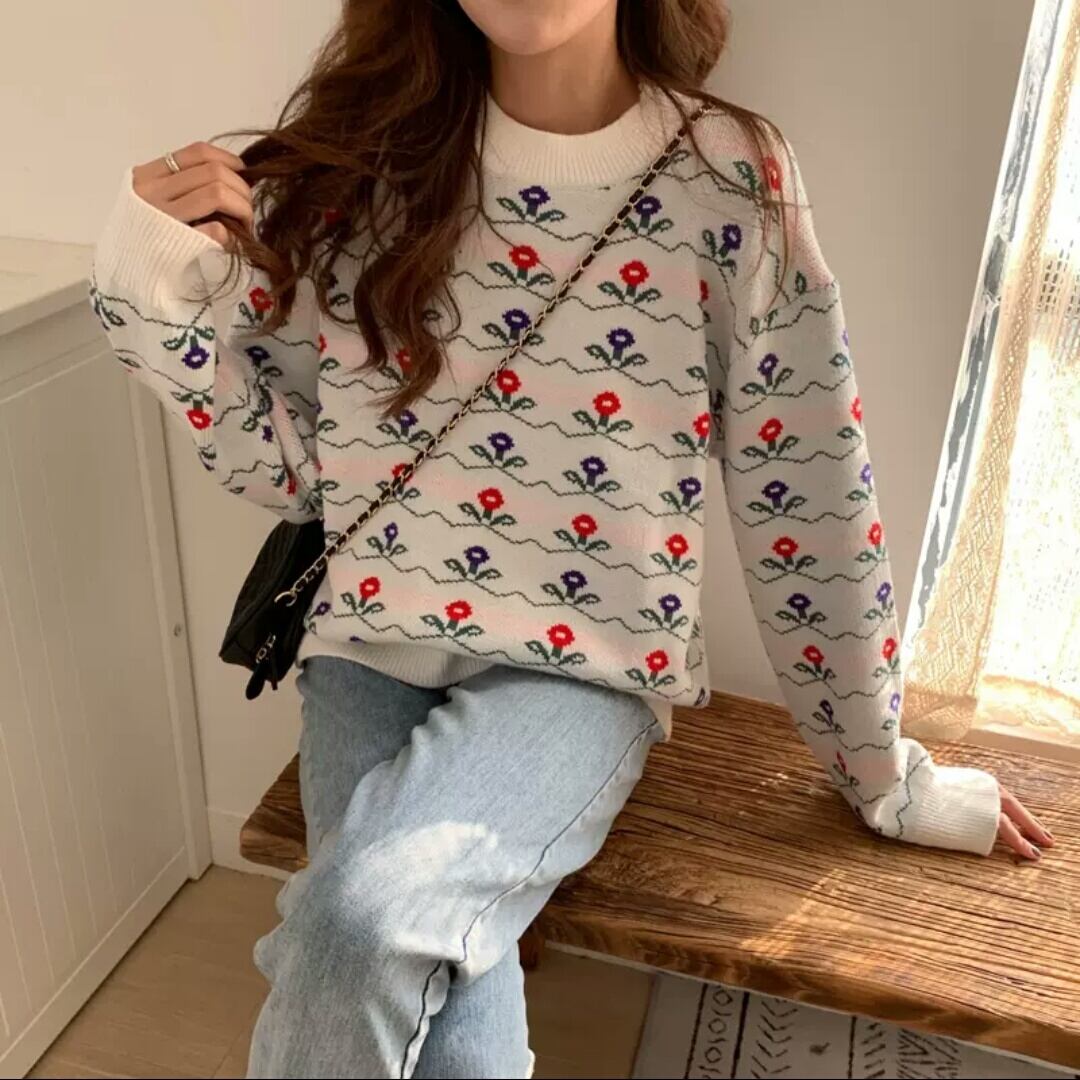全2色 小花柄 ラウンドネック セーター ニット トップス 大人 可愛い カジュアル お出かけ お買い物 デート 女子会 秋冬 春 通学 学生 通勤 韓国ファッション