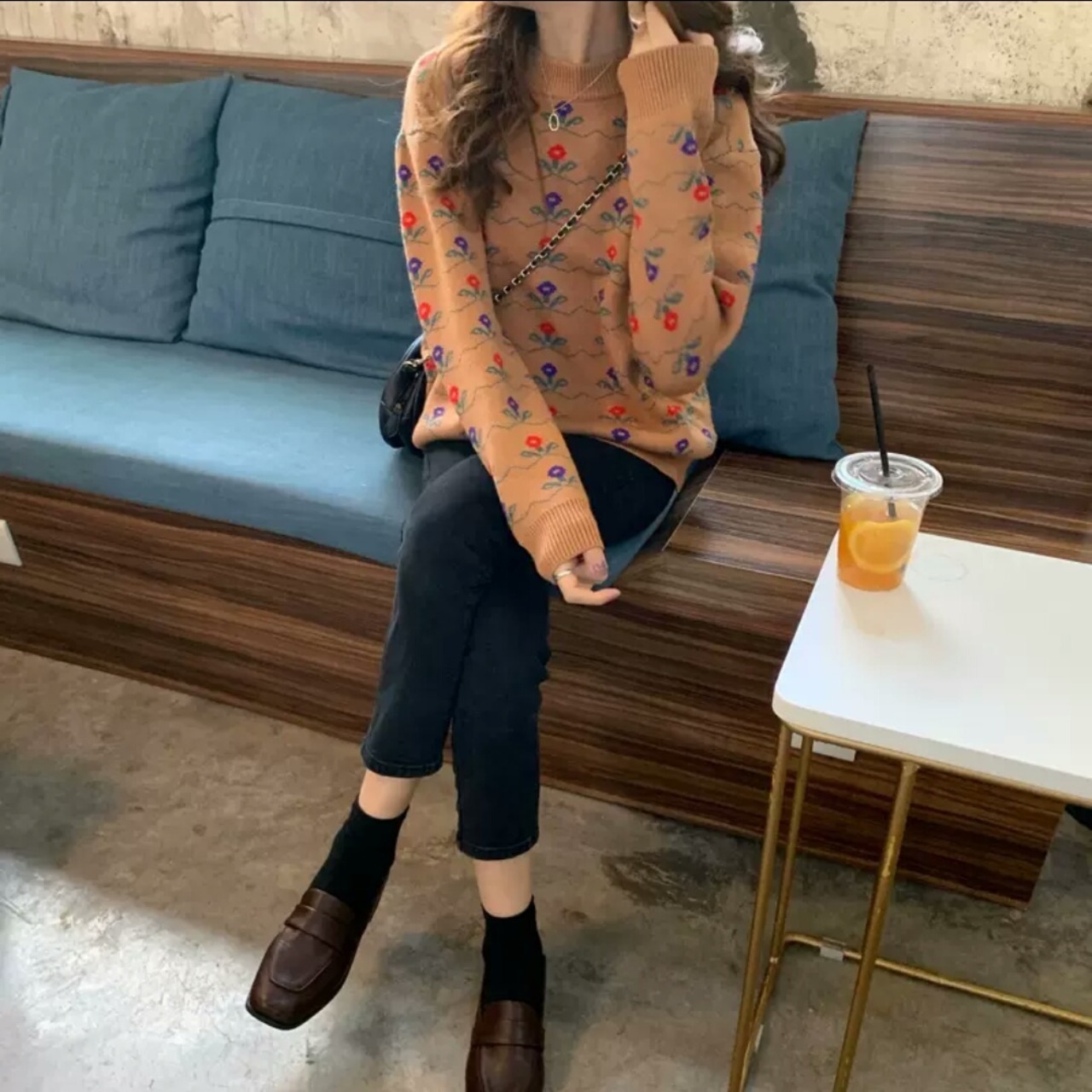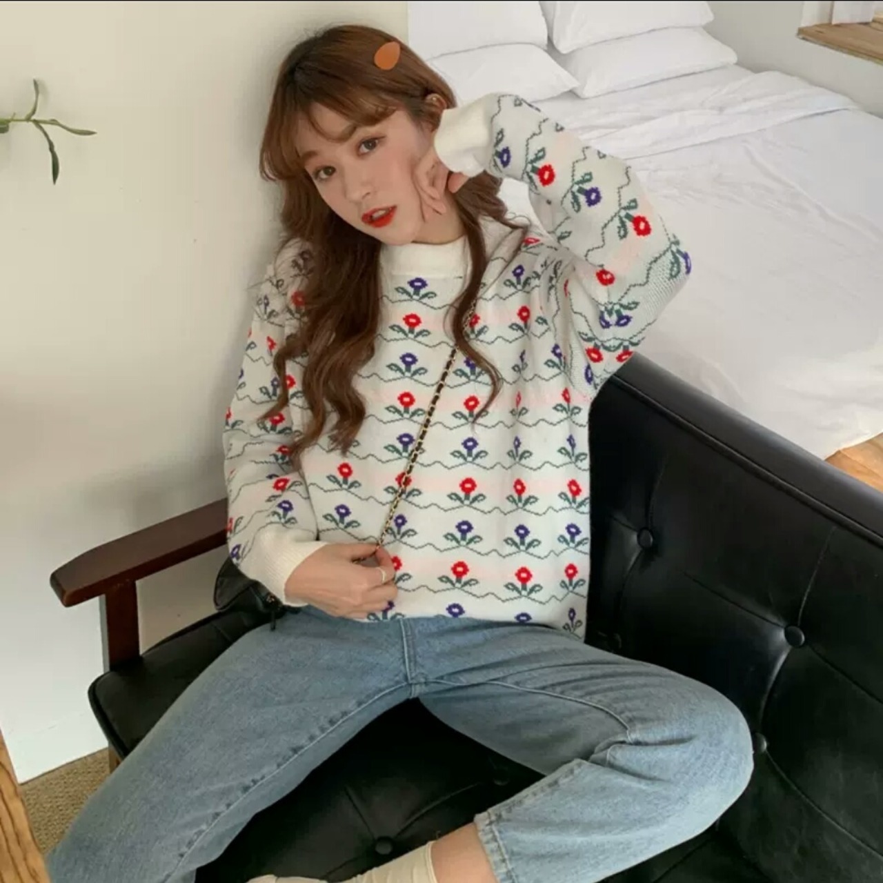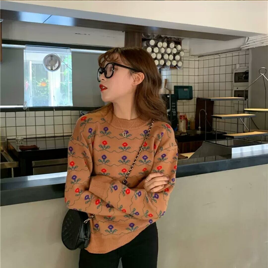 全2色 小花柄 ラウンドネック セーター ニット トップス 大人 可愛い カジュアル お出かけ お買い物 デート 女子会 秋冬 春 通学 学生 通勤 韓国ファッション