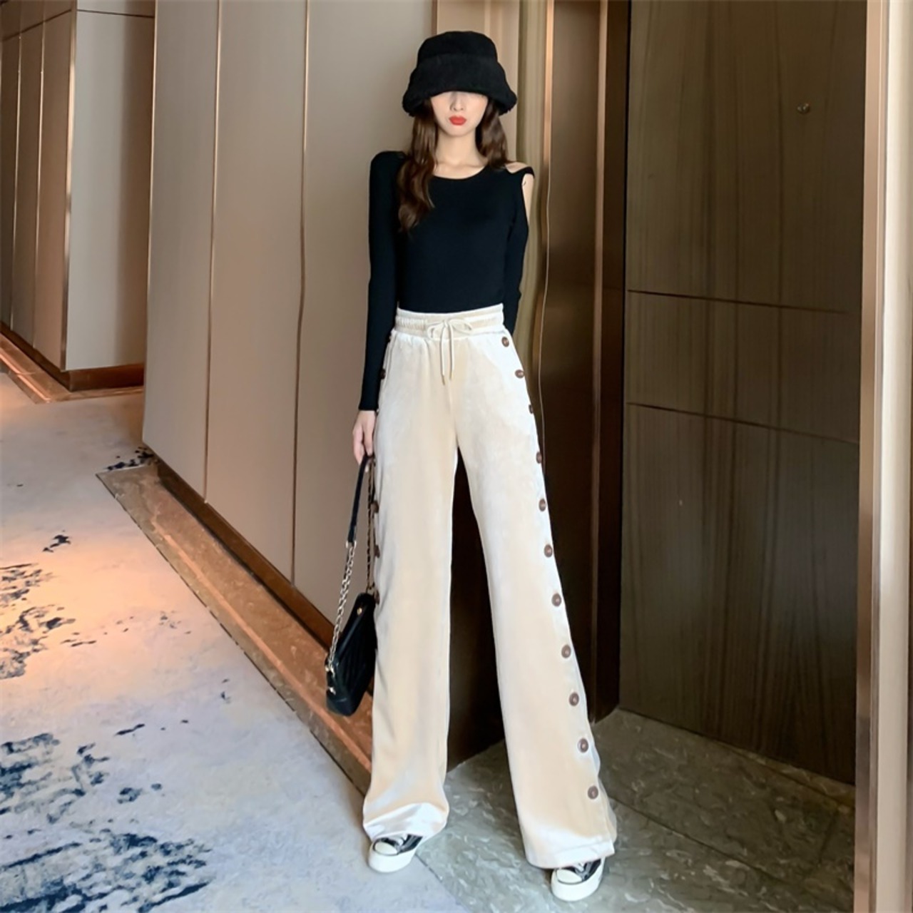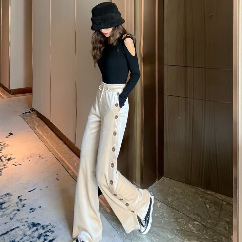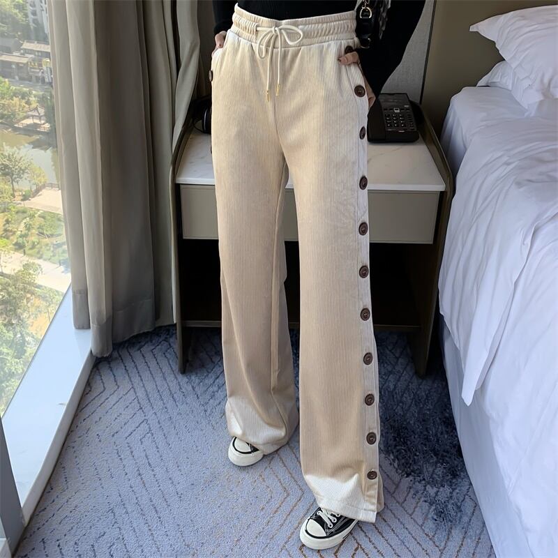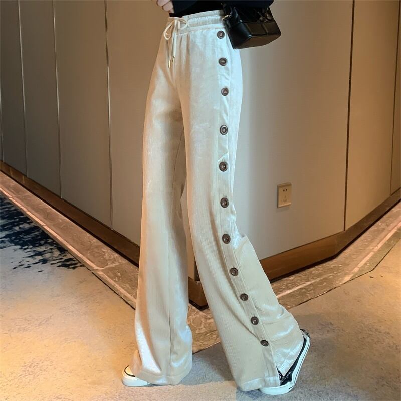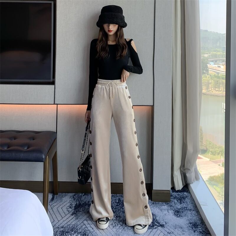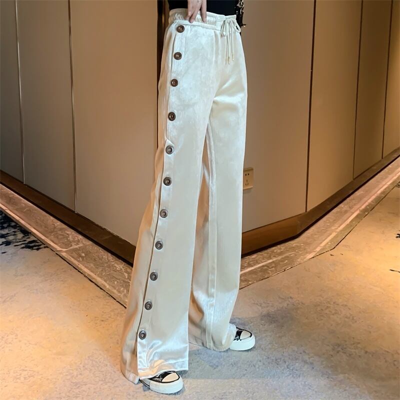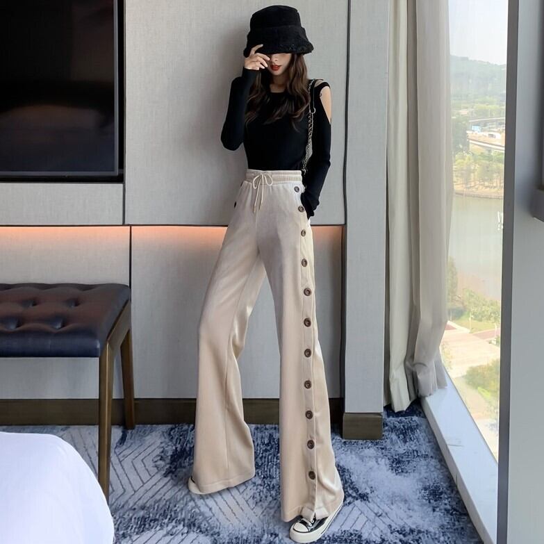 ボトムス パンツ ワイドパンツ サイドボタン ハイウエスト ブーツカット ゆったり 個性的 ユニーク ウエストゴム 上品 カジュアル デイリー 秋 春 冬