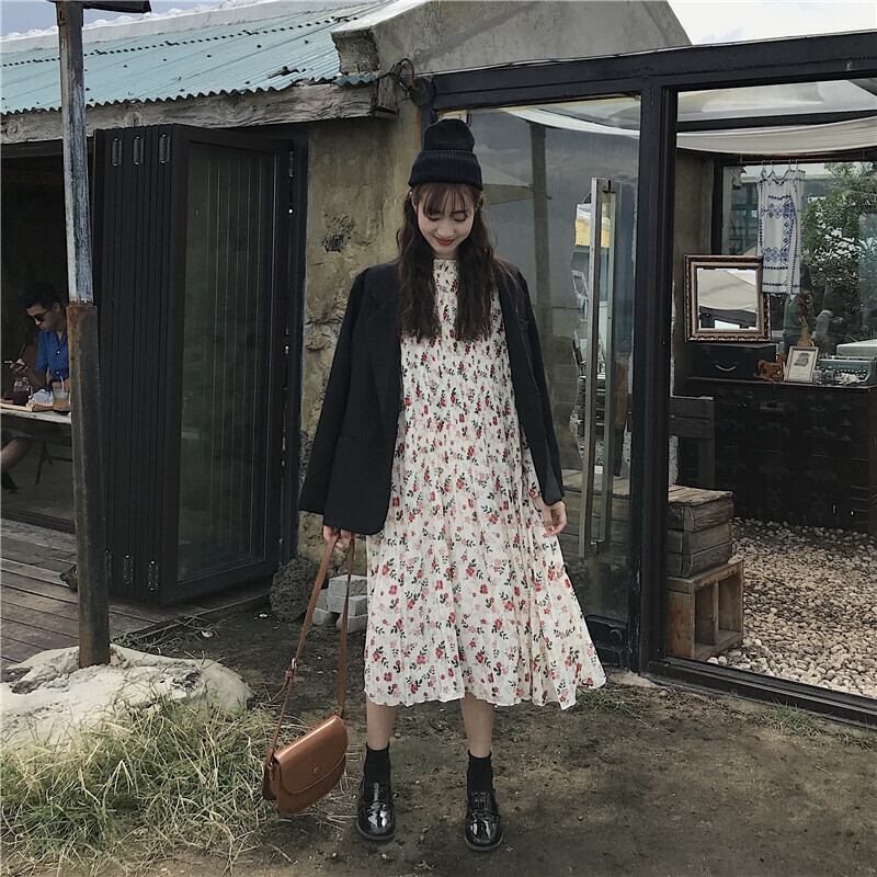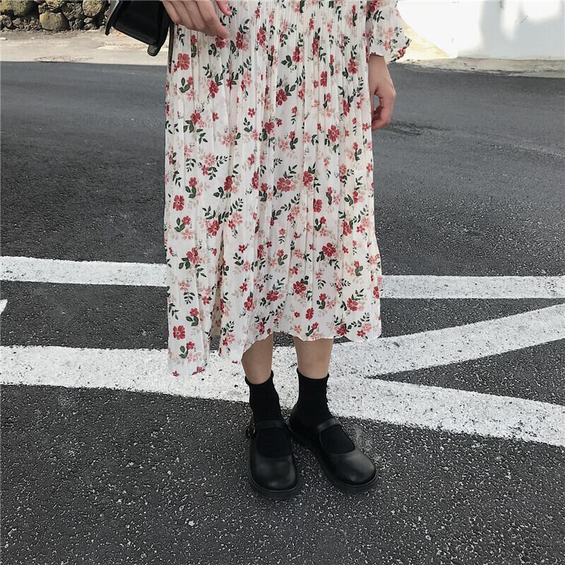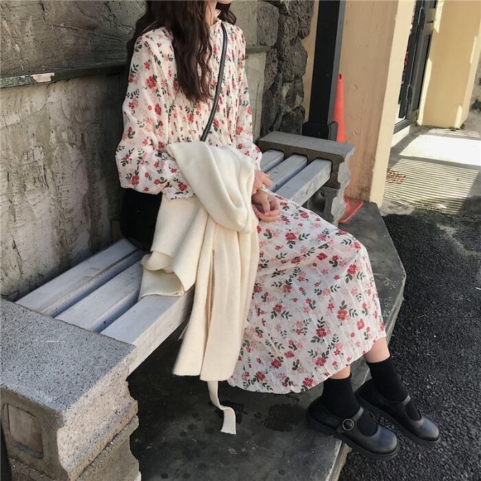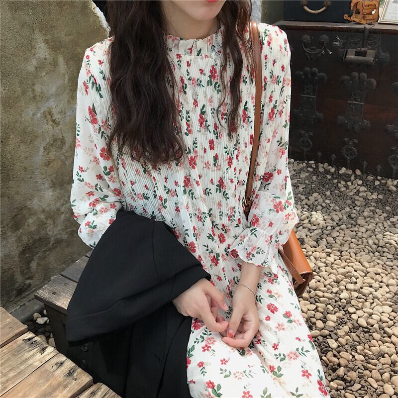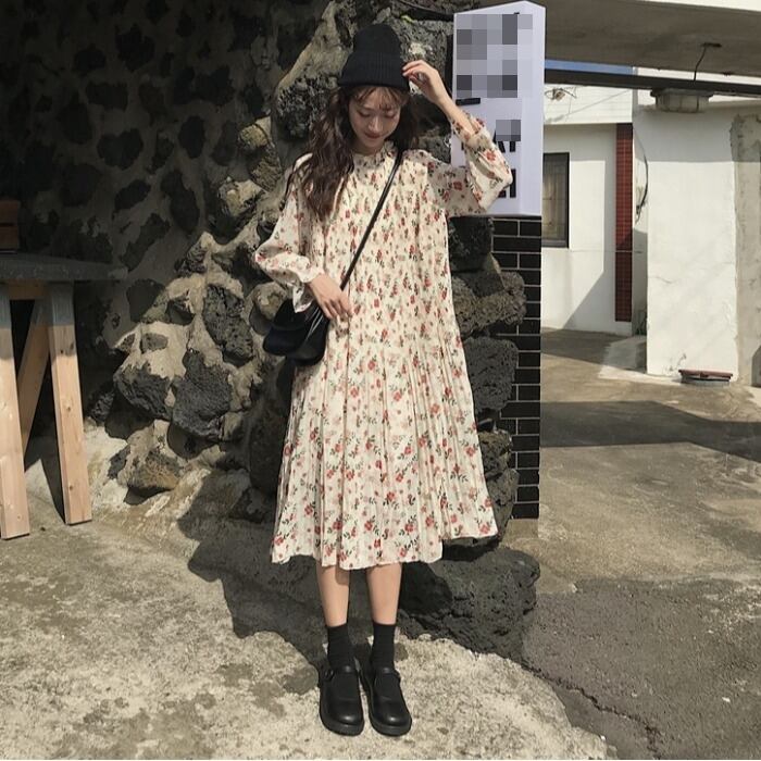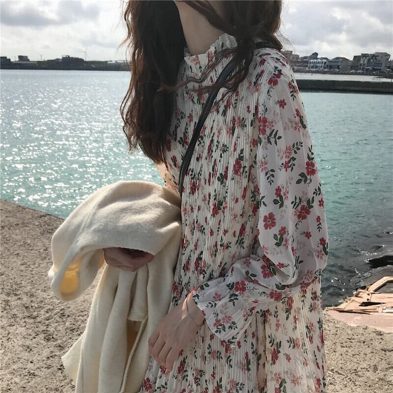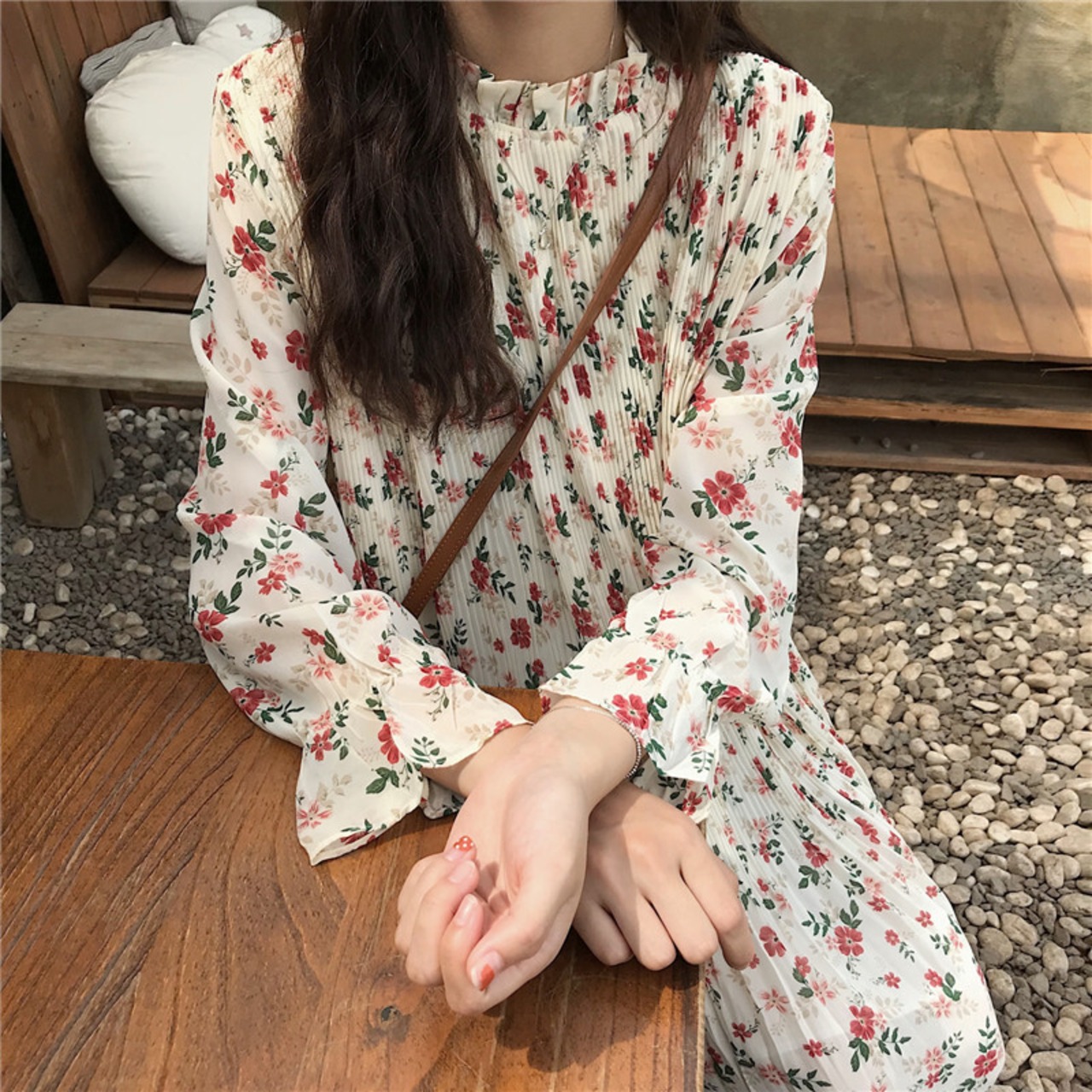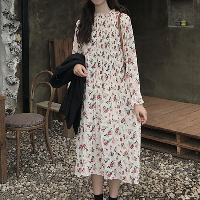 ワンピース ミモレ丈 花柄 シフォン プリーツ フレア ゆったり フリル 長袖 ハイネック ガーリー 韓国ファッション 大人可愛い デート 上品 春 夏