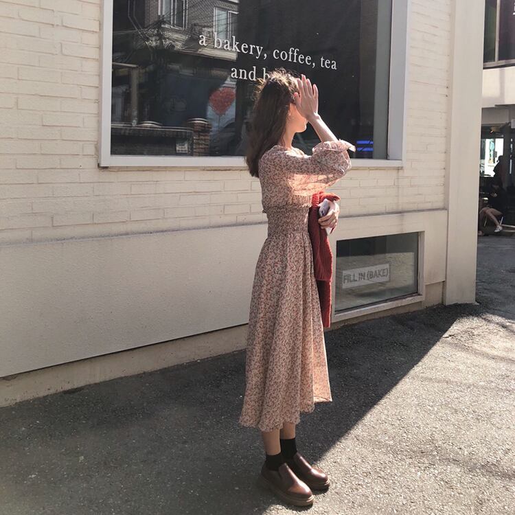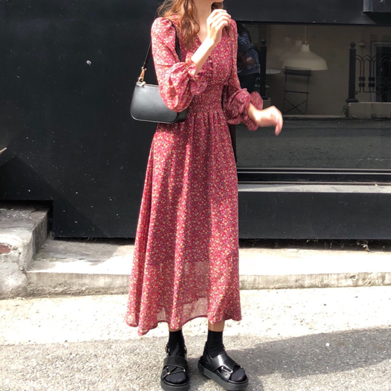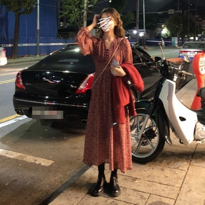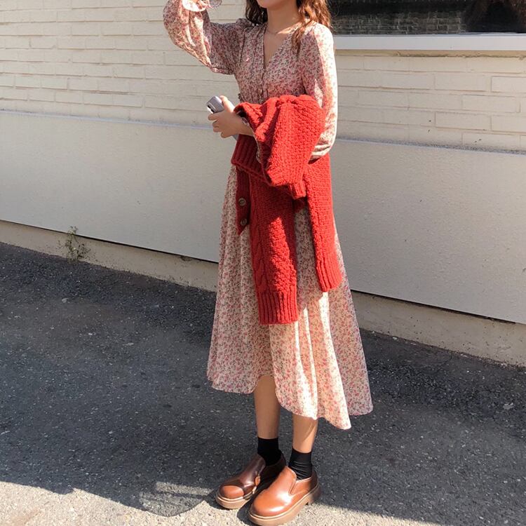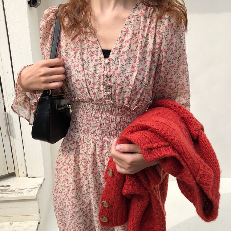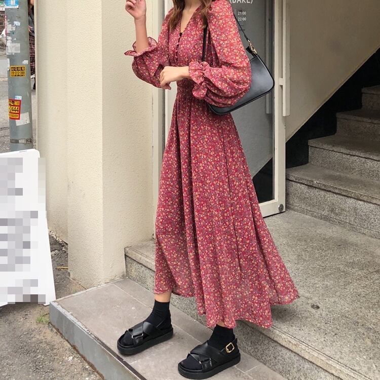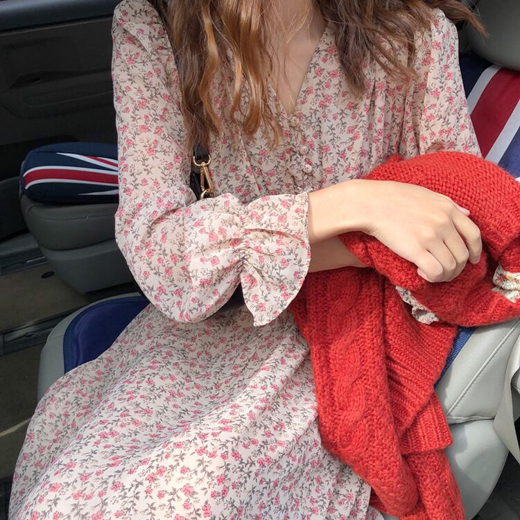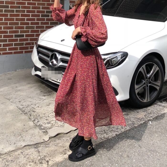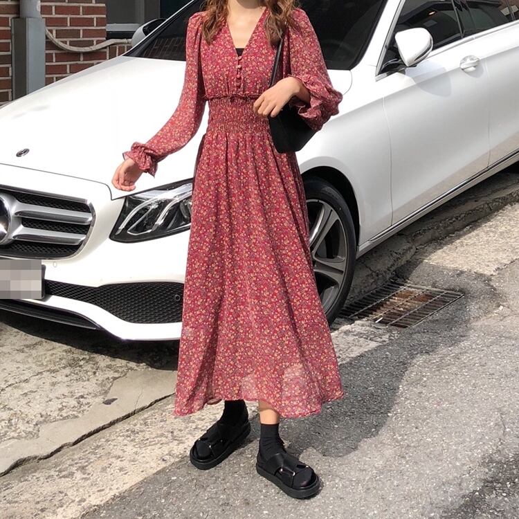 全2色 ワンピース ロング丈 ゆったり フレア ボタン Vネック 花柄 レトロ カジュアル デート ガーリー 大人可愛い 長袖 ウエストマーク きれいめ 夏 春