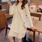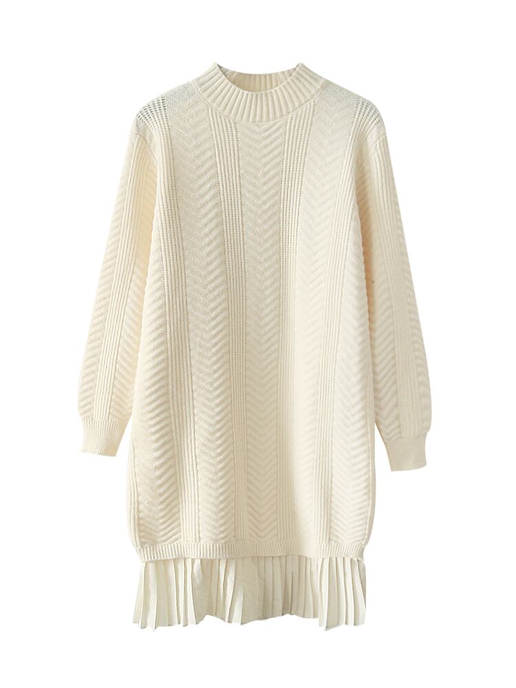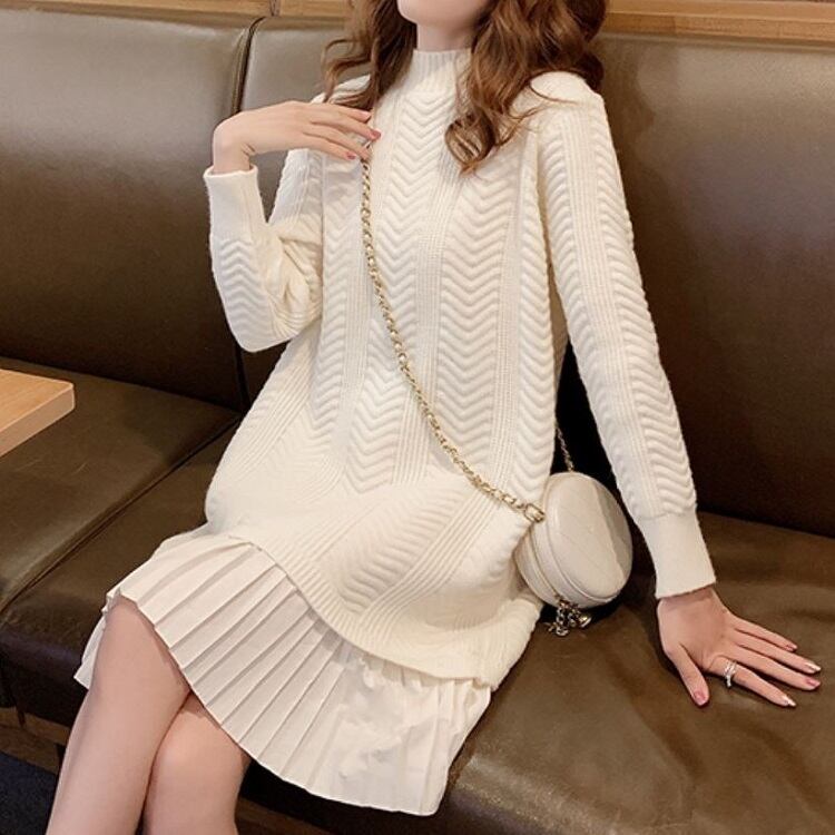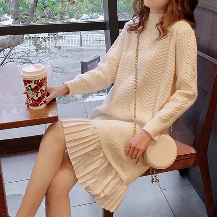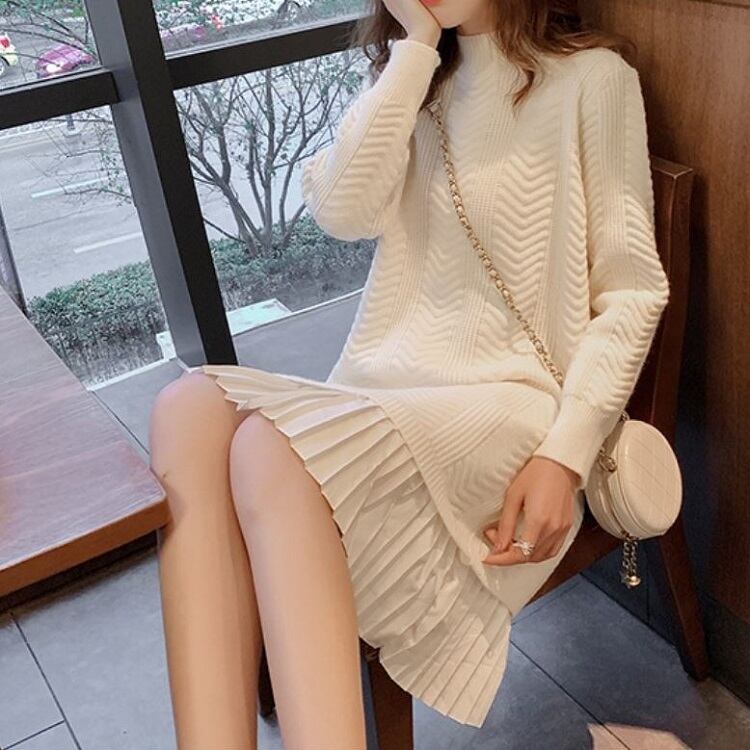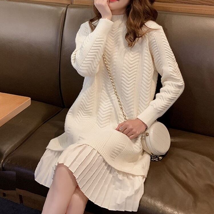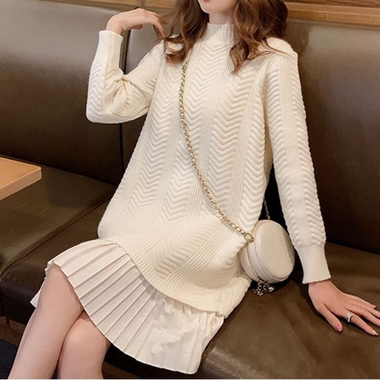 ドッキングワンピース ロングニット ラウンドネック プルオーバー プリーツスカート かわいい ガーリー きれいめ カジュアル お出かけ デート オフホワイト 秋冬 春