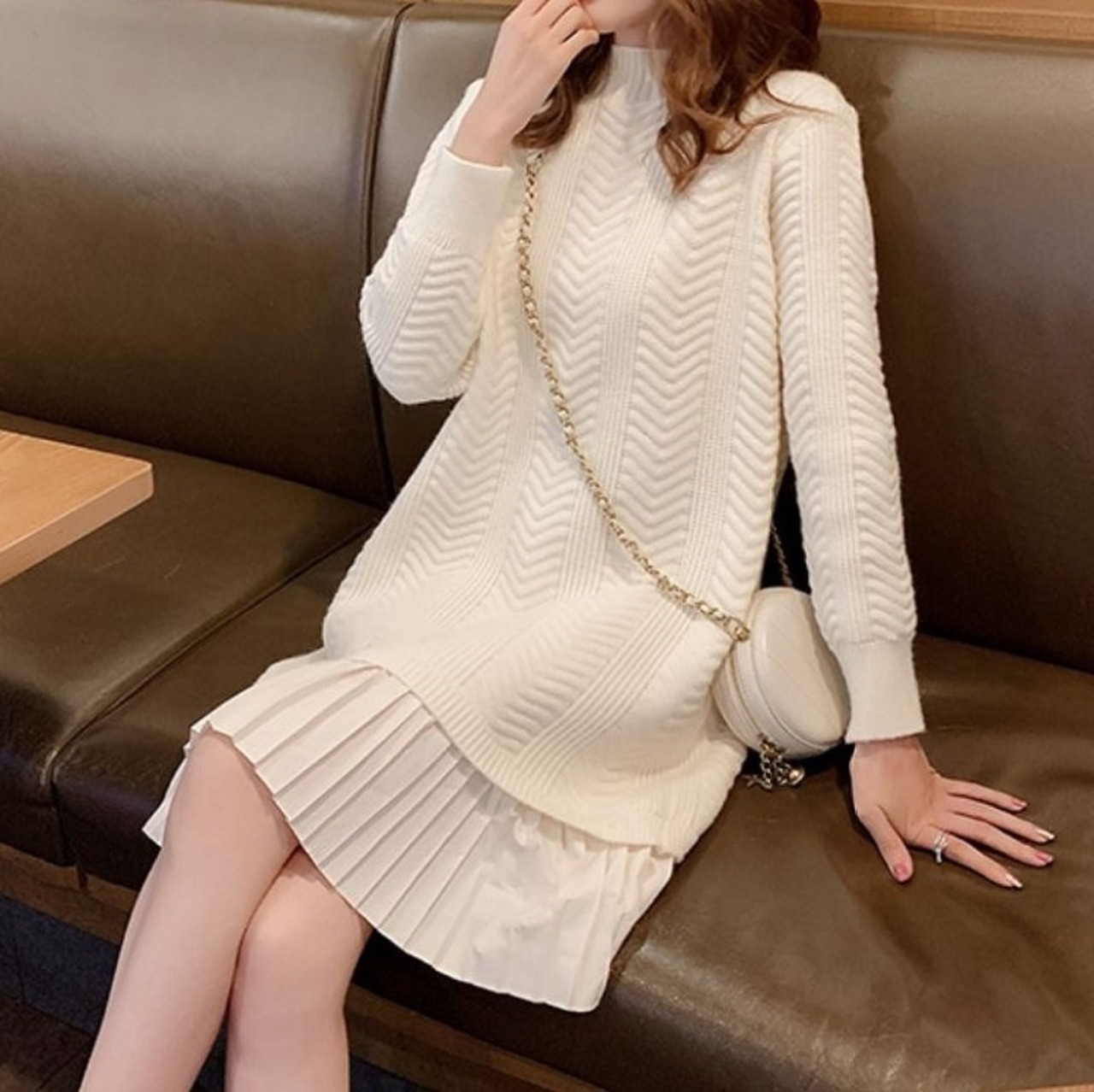 ロングニットにプリーツスカートをコーデしているようなドッキングワンピース。