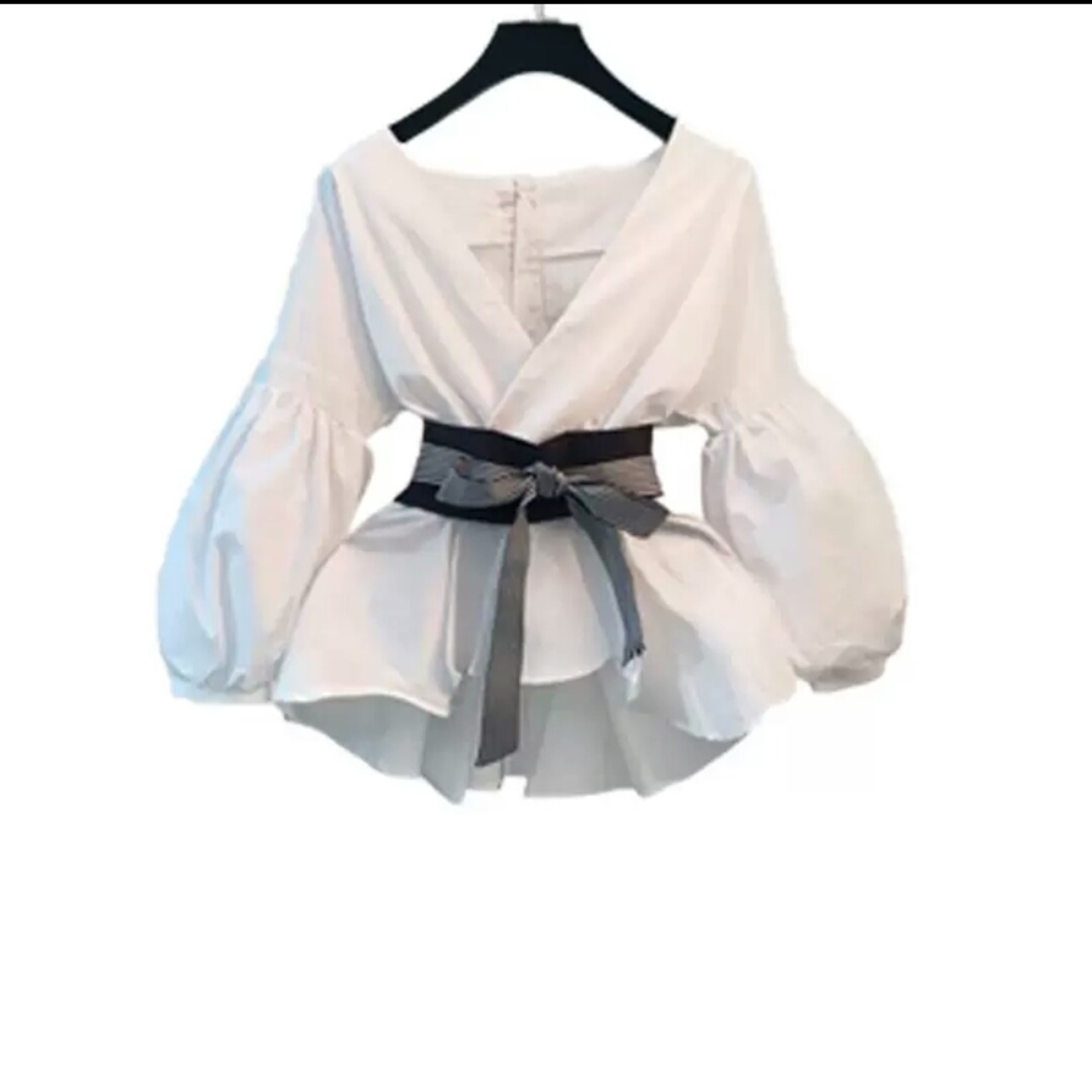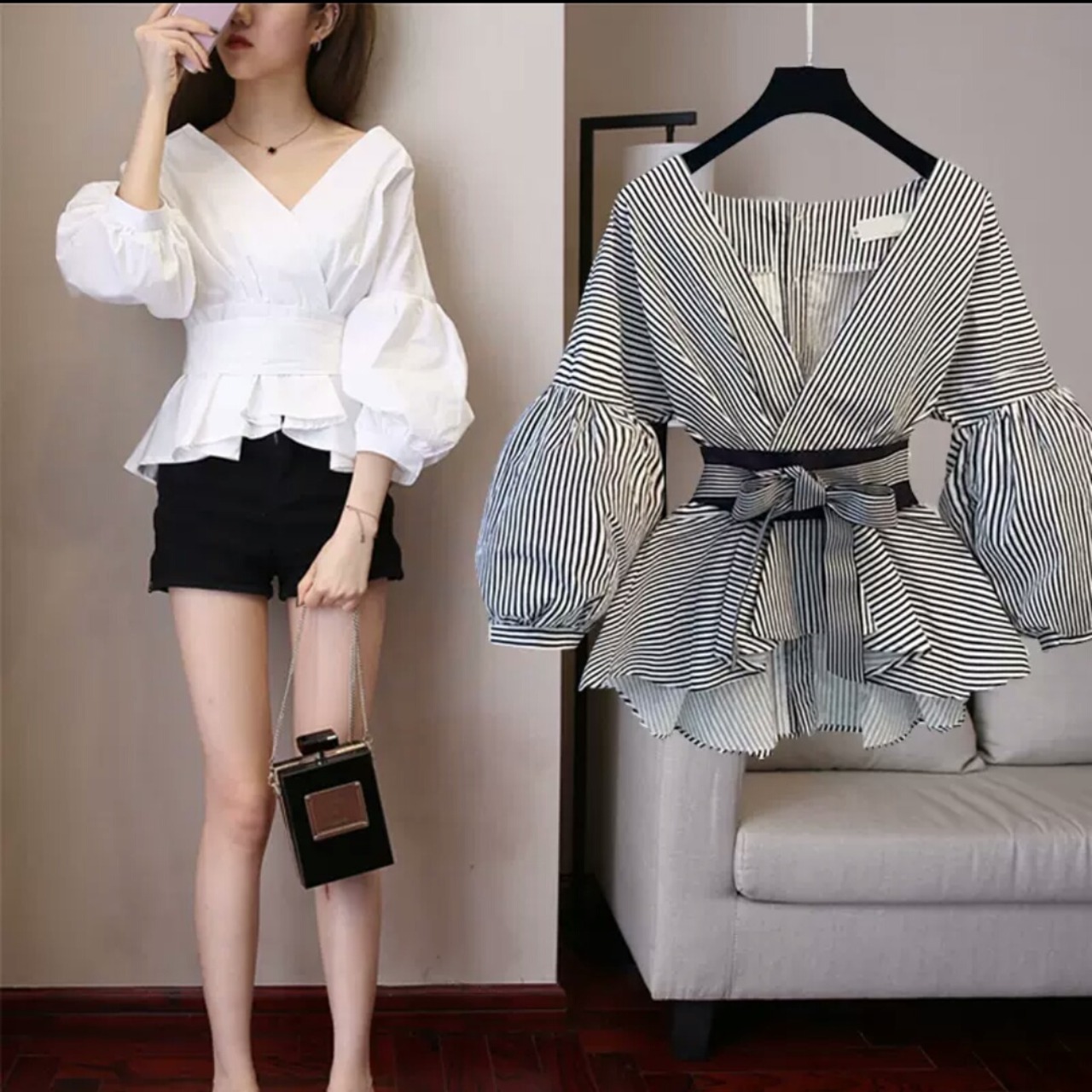 全3色 ランタンスリーブ ベルトつき シャツ ストライプ柄 無地 シンプル 大人 カジュアル キレイめ エレガント 可愛い お出かけ お買い物 デート 女子会 秋冬 春 通学 学生 通勤 韓国ファッション