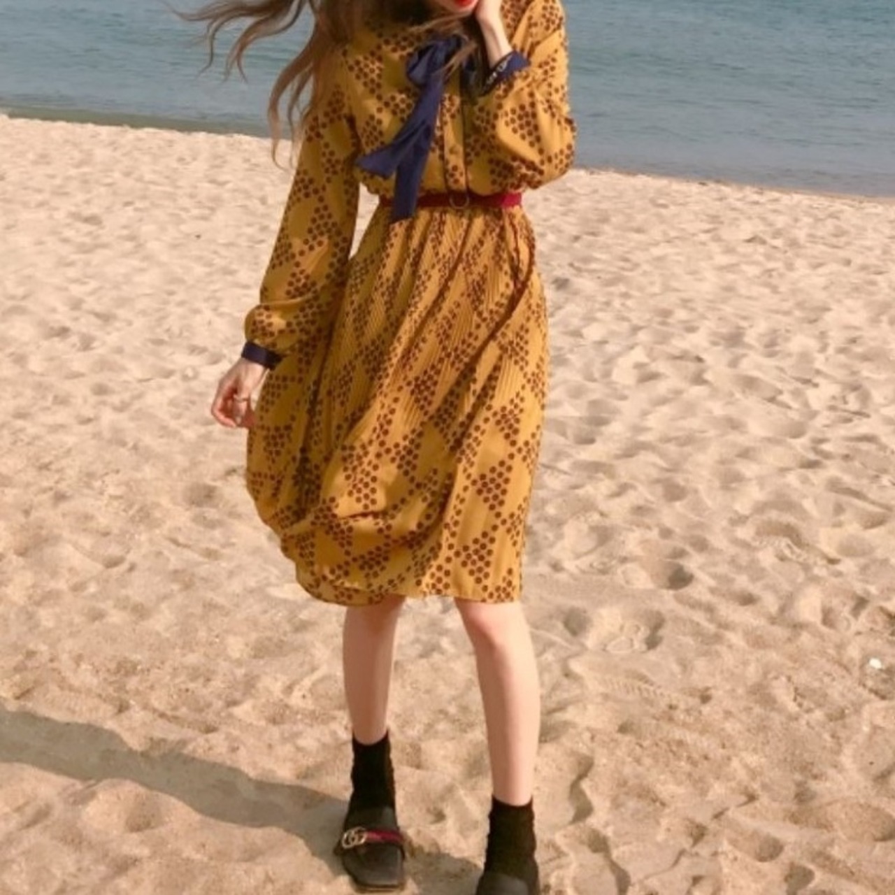 シフォンワンピース ワンピース ひざ丈 プリーツスカート 長袖 ボウタイリボン レトロ きれいめ ゆったり かわいい カジュアル お出かけ デート 春