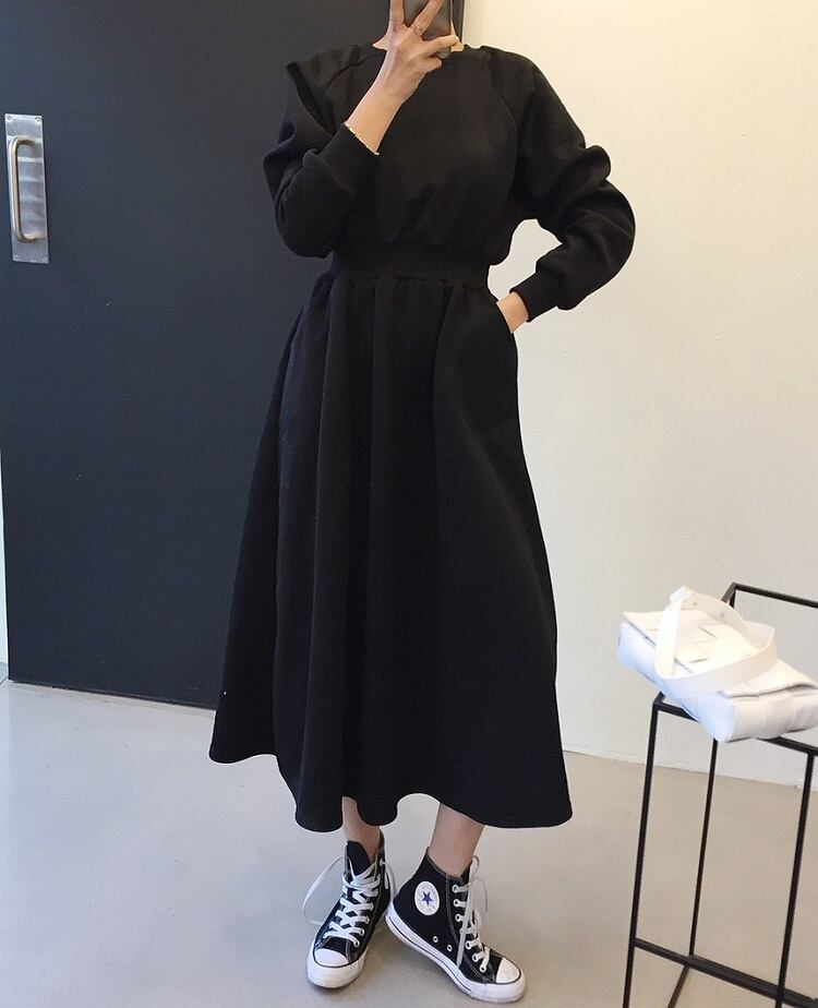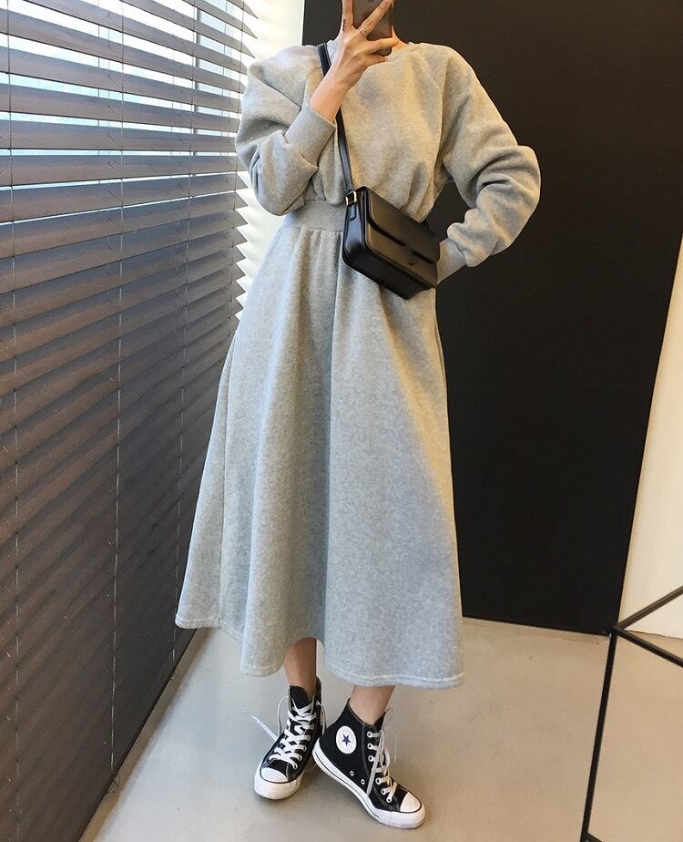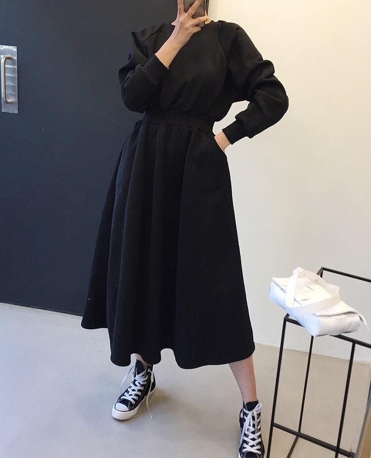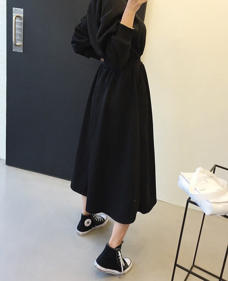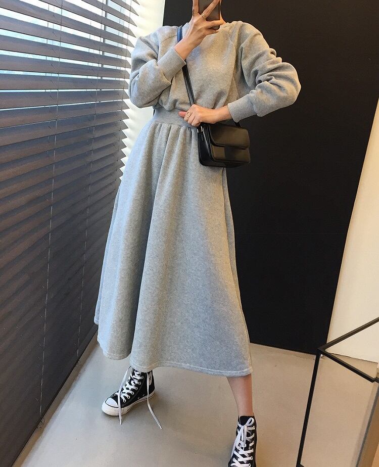 全2色 スウェットワンピース フレアスカート ロング丈 ラウンドネック ウエストゴム 長袖 無地 ゆったり かわいい カジュアル デイリー 春秋冬