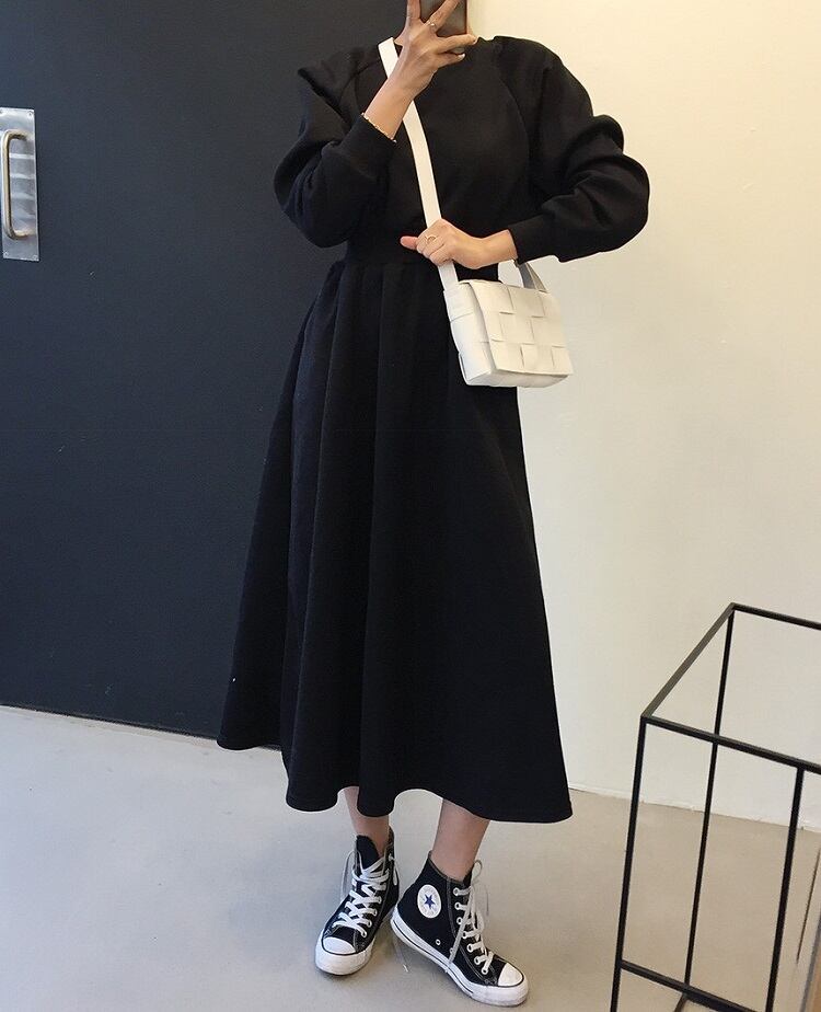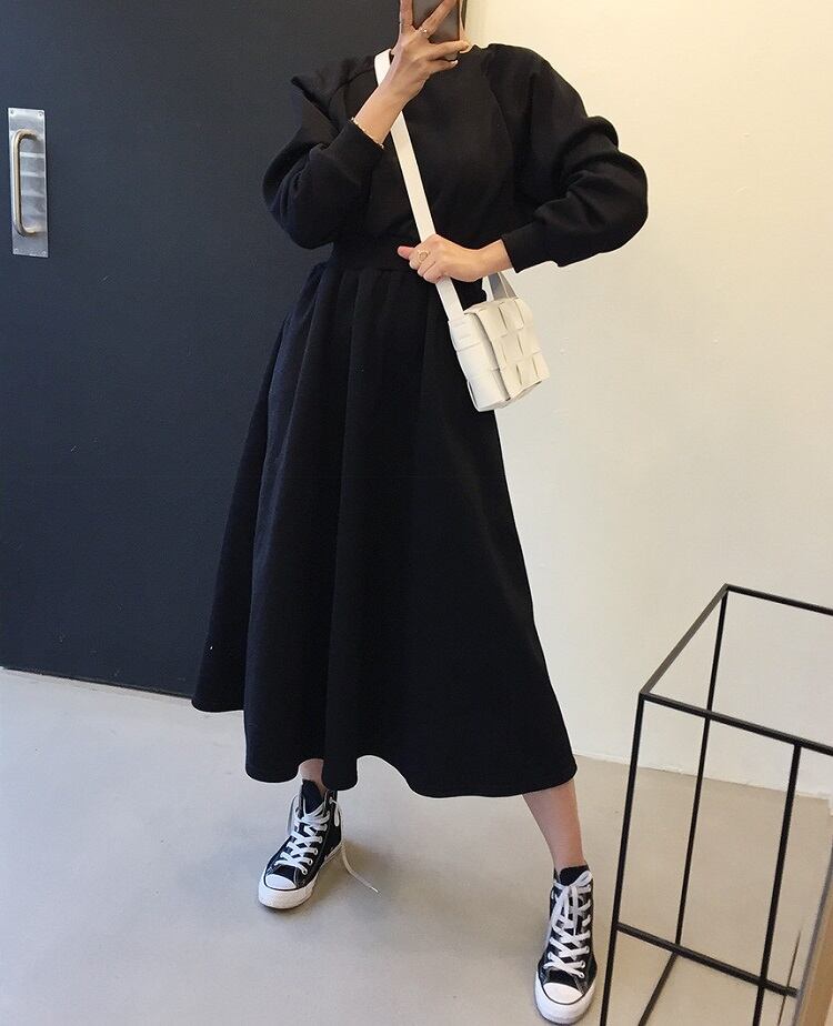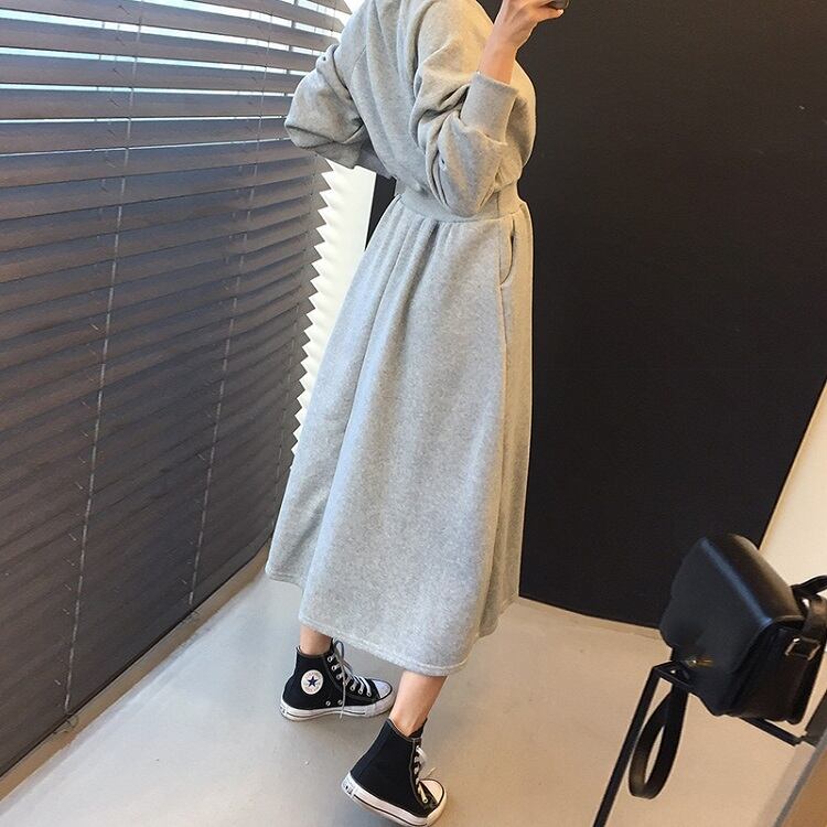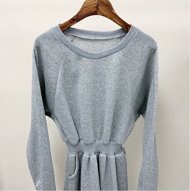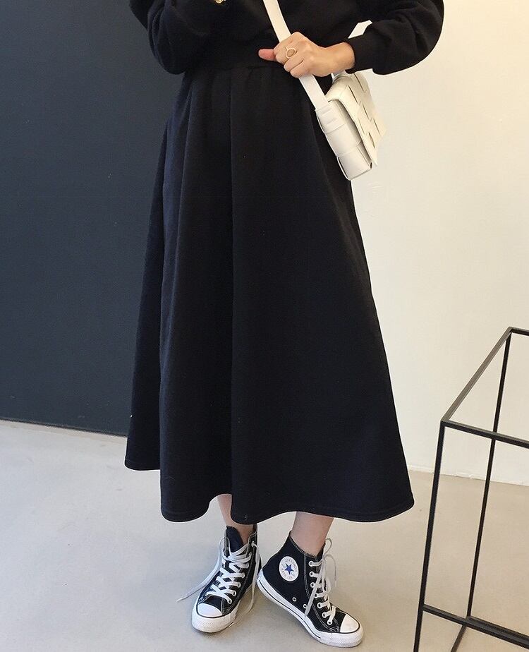 全2色 スウェットワンピース フレアスカート ロング丈 ラウンドネック ウエストゴム 長袖 無地 ゆったり かわいい カジュアル デイリー 春秋冬
