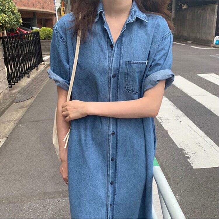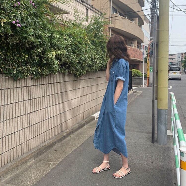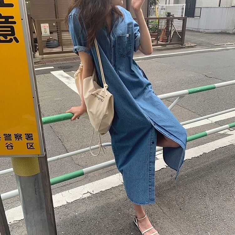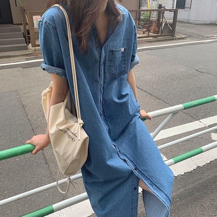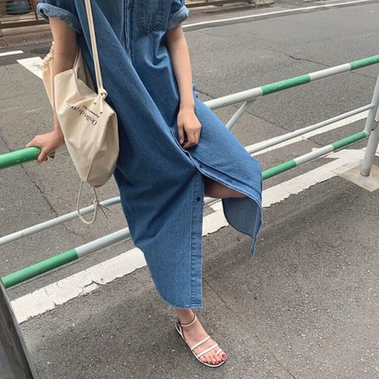 デニムワンピース シャツワンピース ロング丈 半袖 フロントボタン レトロ ゆったり かわいい カジュアル お出かけ デート デイリー 春 夏