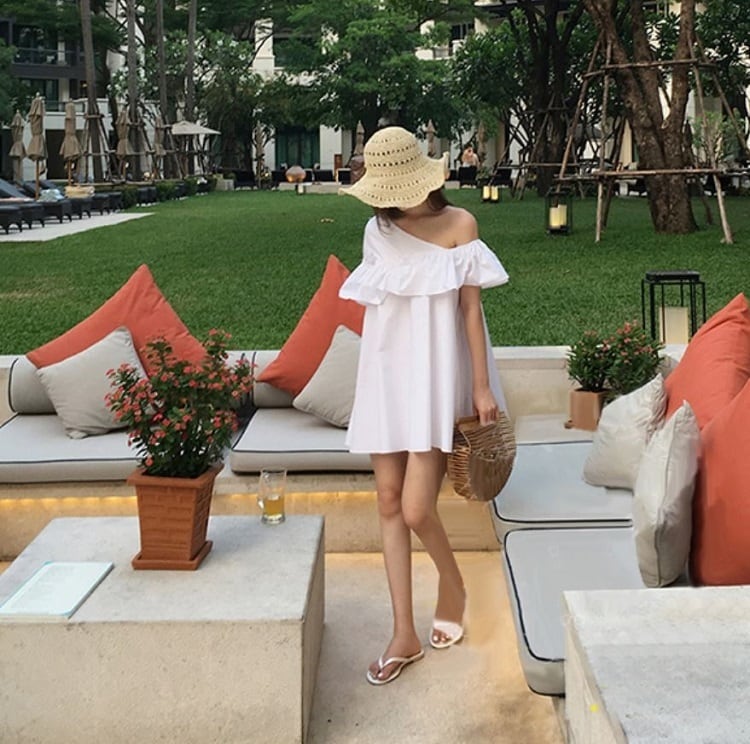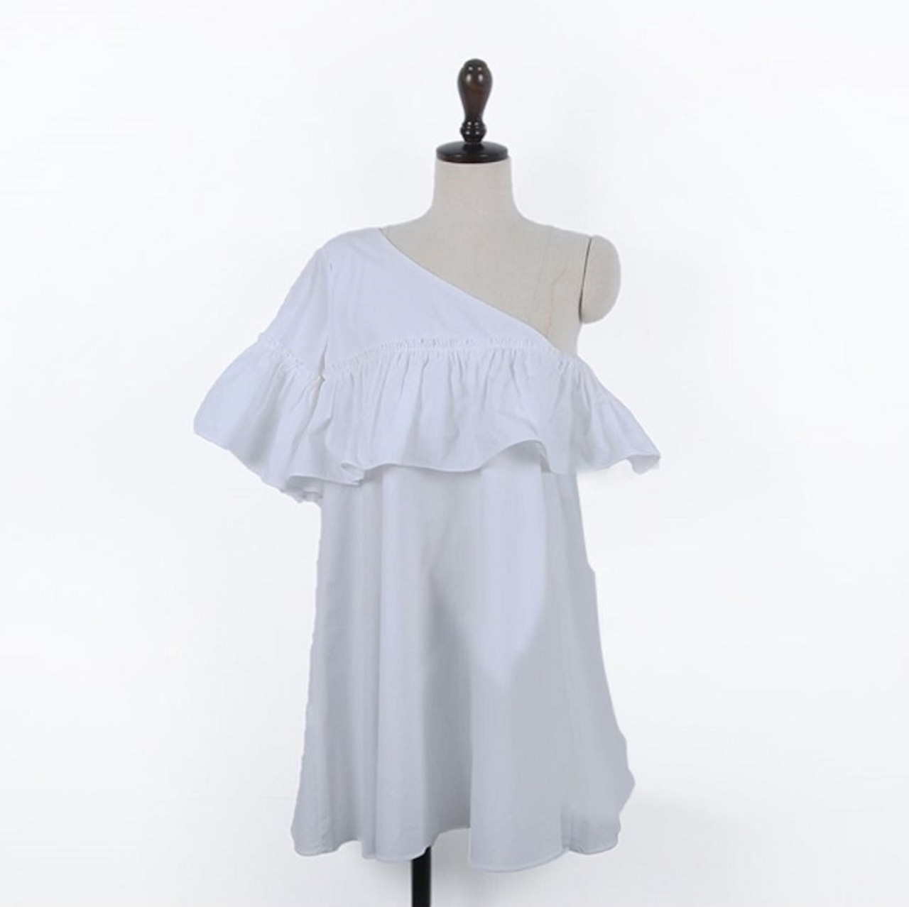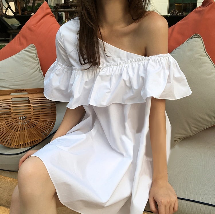 ワンショルダーとフリルが可愛いミニワンピース。