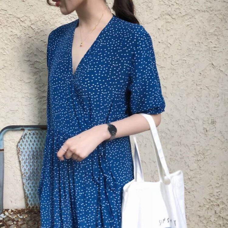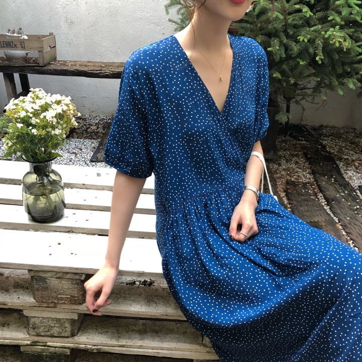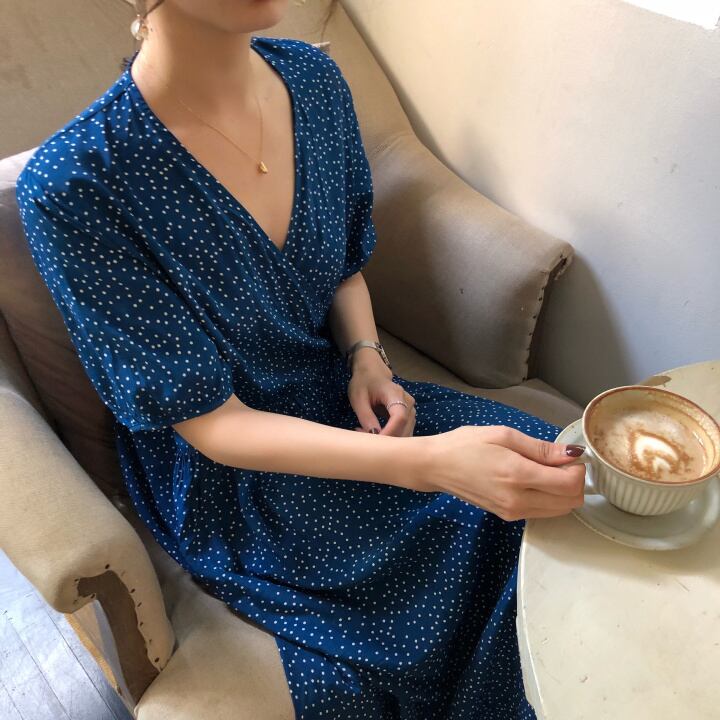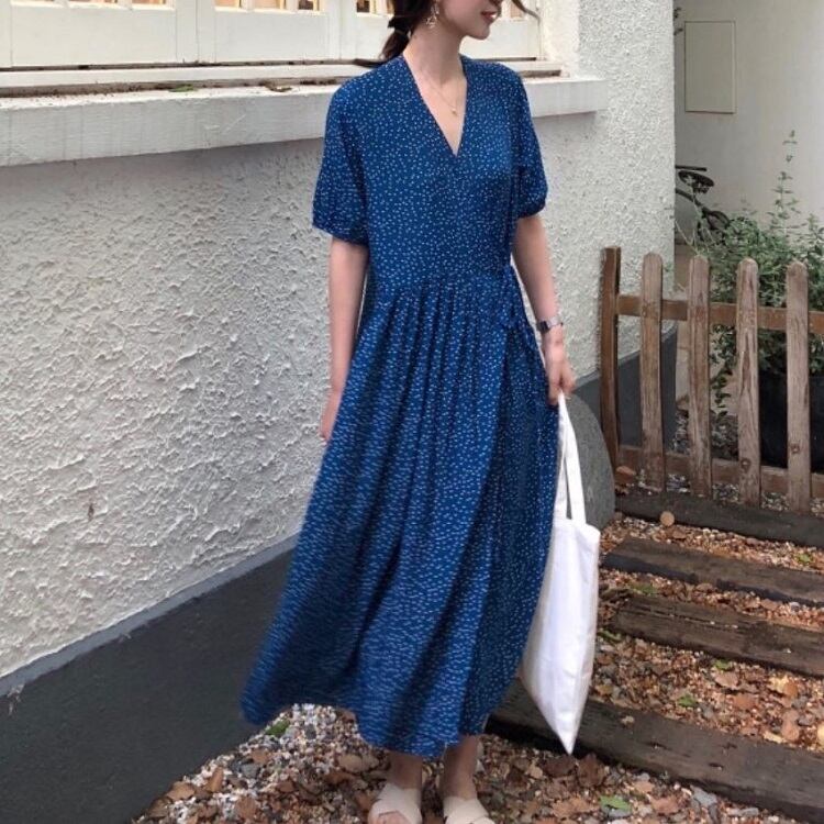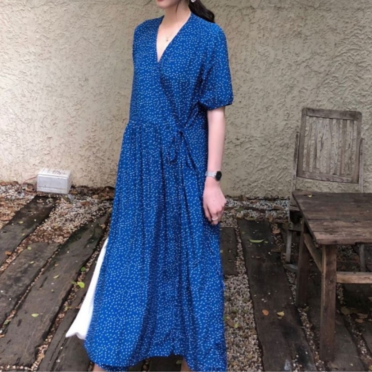 鮮やかなブルーが綺麗なドット柄のロングワンピース。