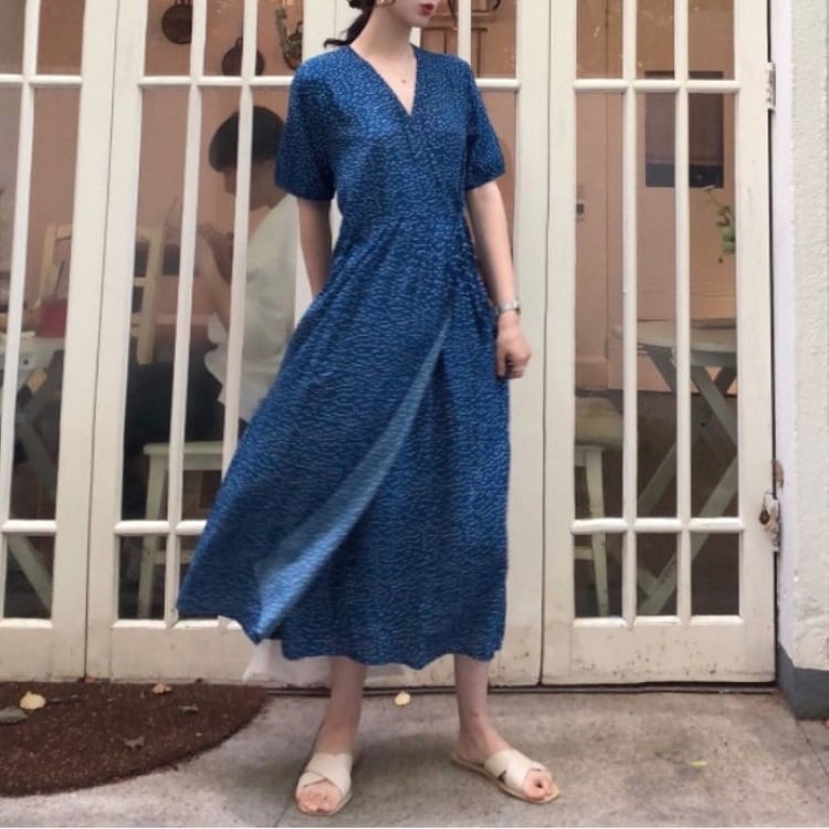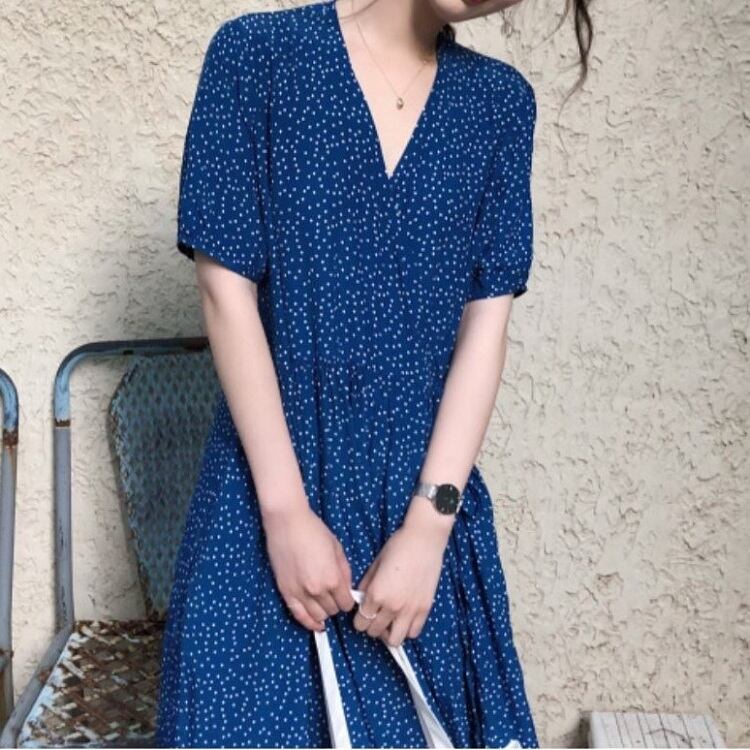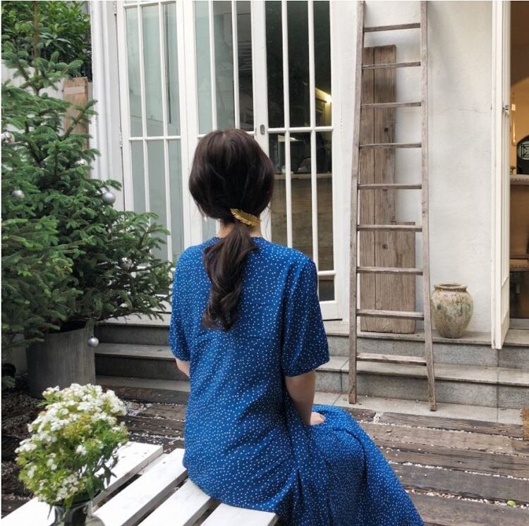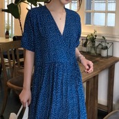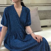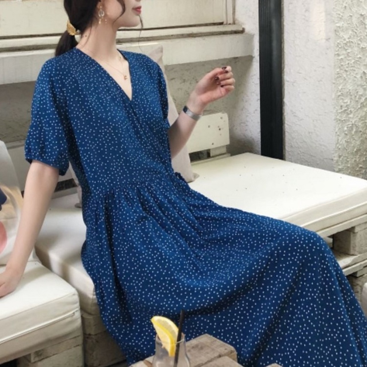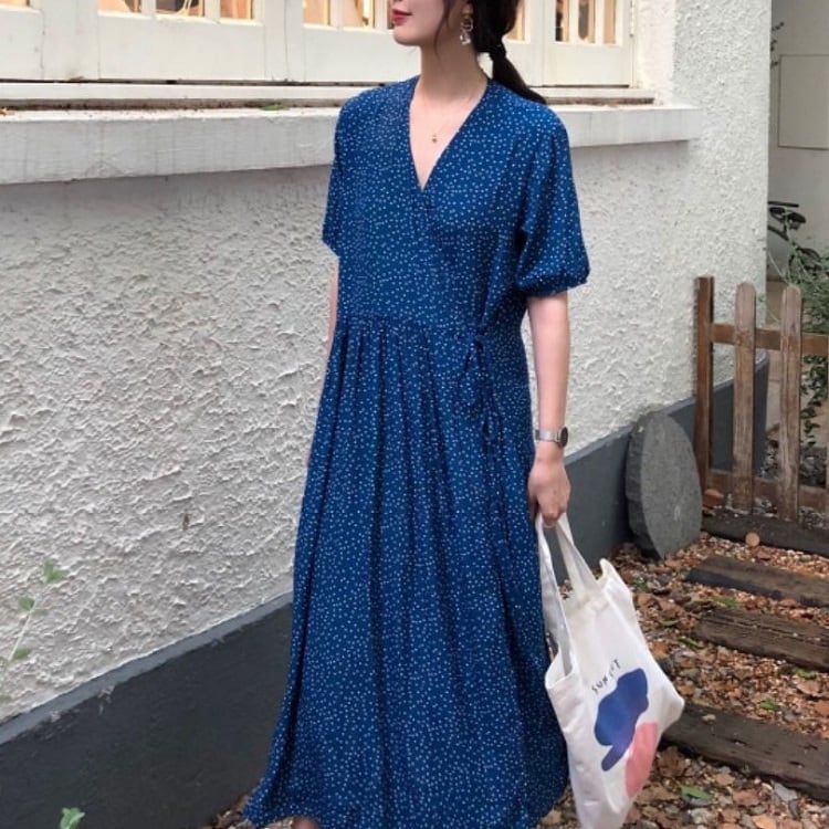 鮮やかなブルーが綺麗なドット柄のロングワンピース。