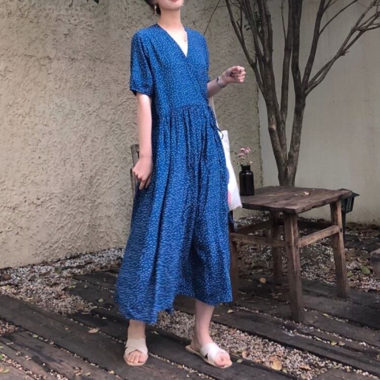 ロングワンピース フレアスカート Vネック 半袖 ドット柄 ゆったり かわいい ガーリー お出かけ カジュアル リゾート 春夏秋