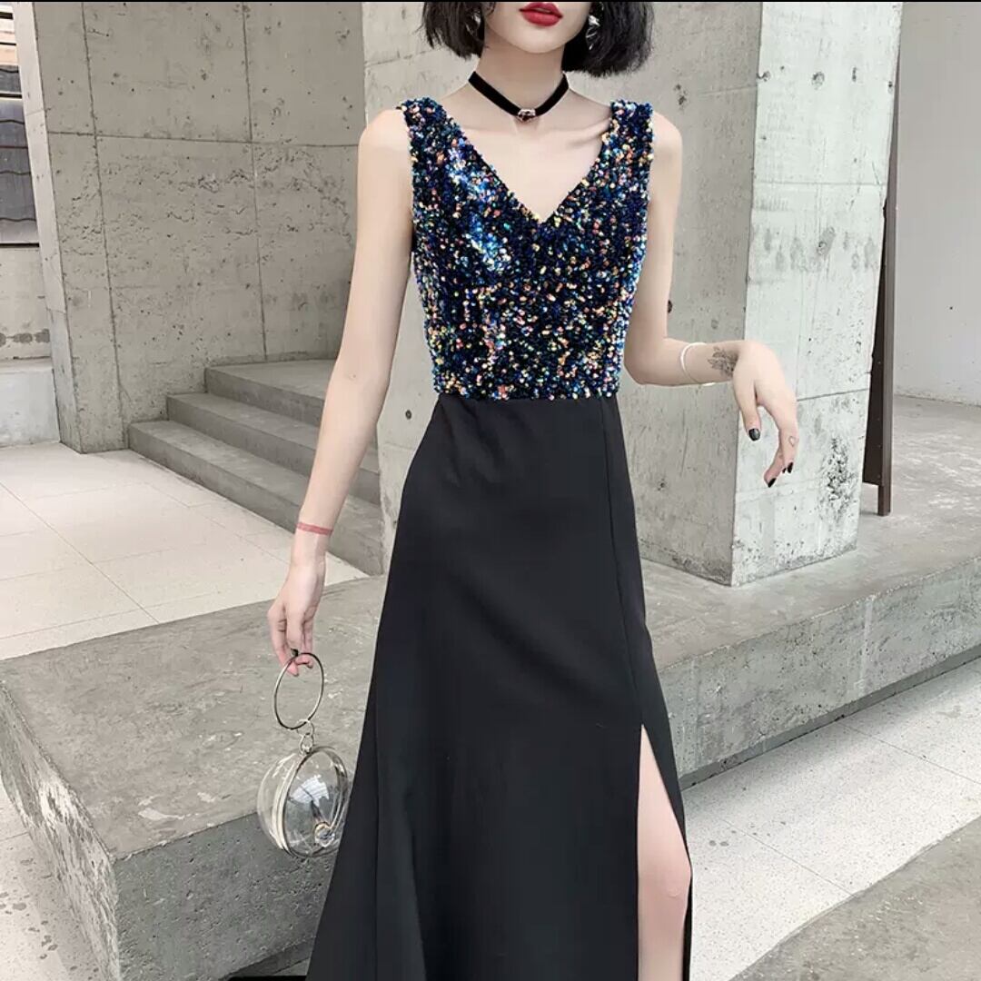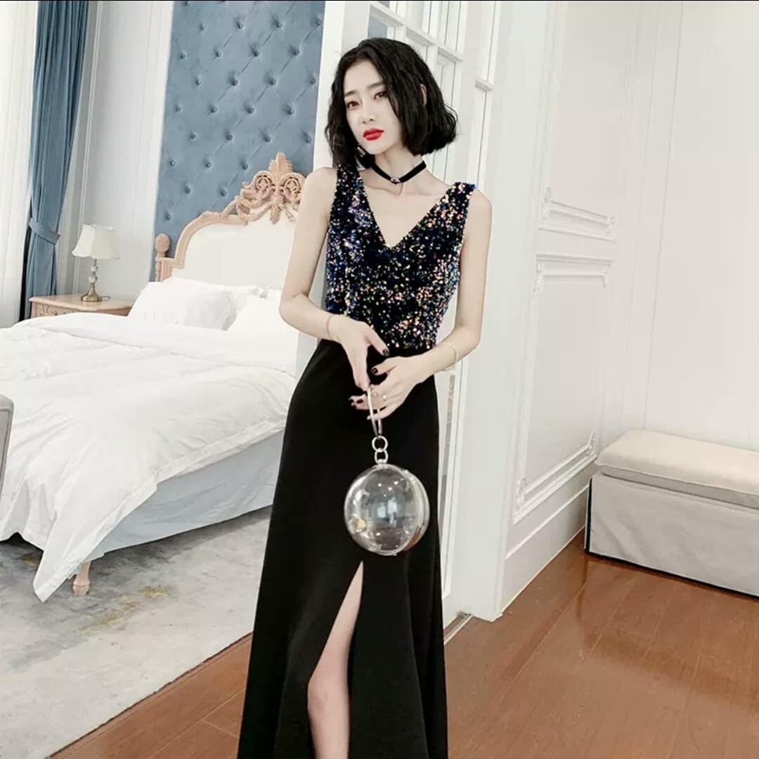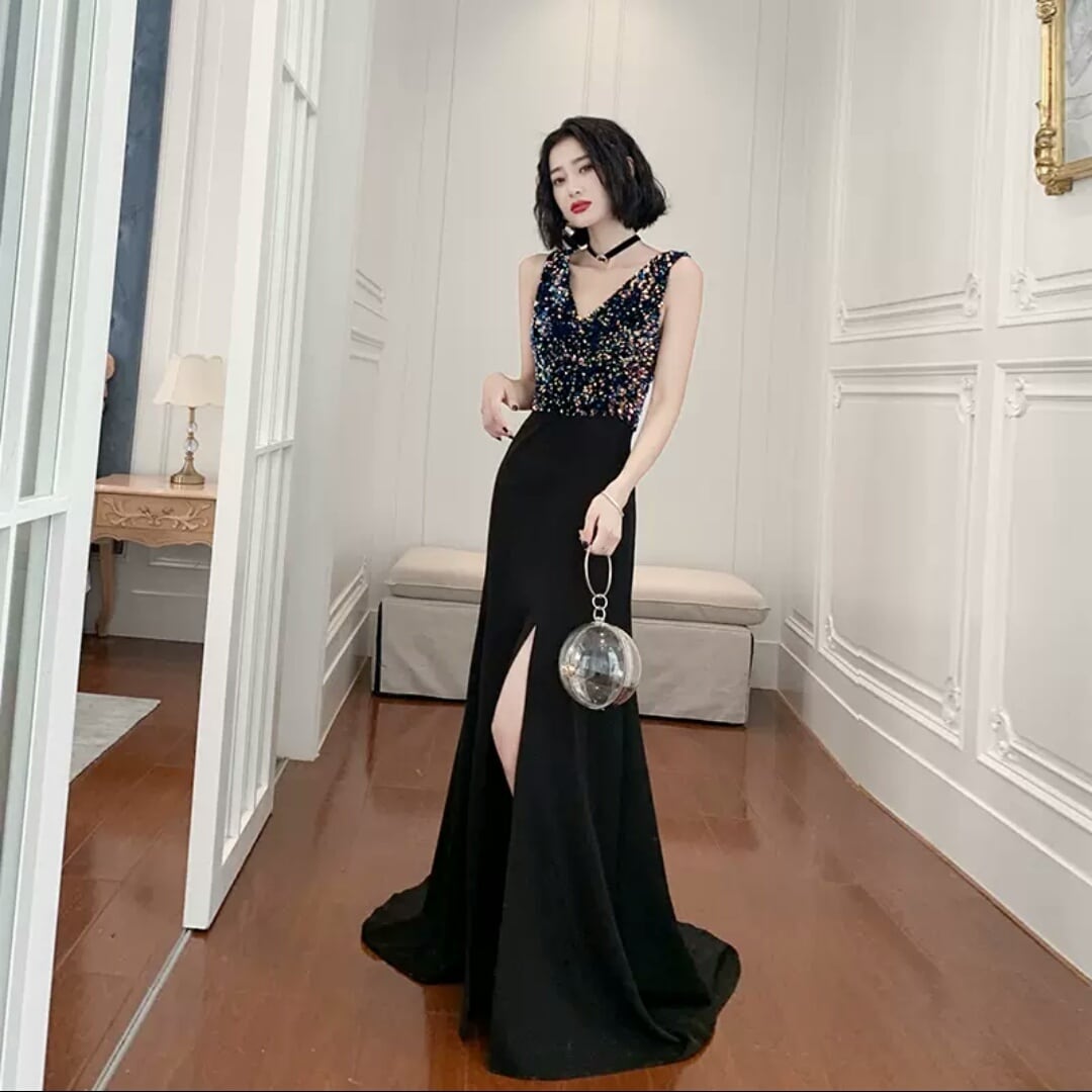 ハイエンド イブニング ドレス ラメ Vネック スリット ロング丈 シック パーティー イベント エレガント キレイめ セクシー 春 夏 小さいサイズ