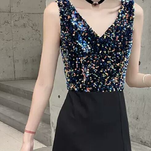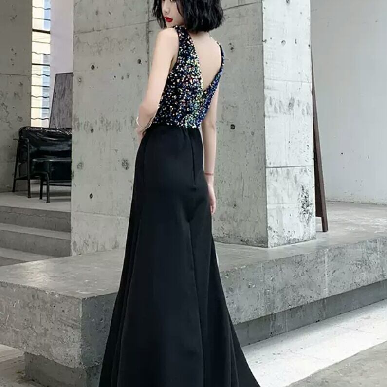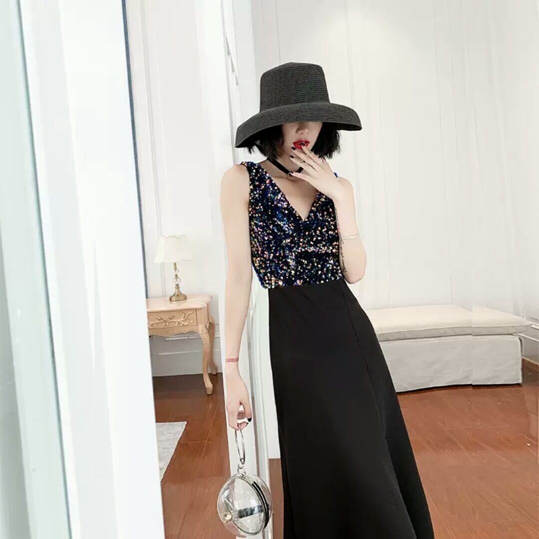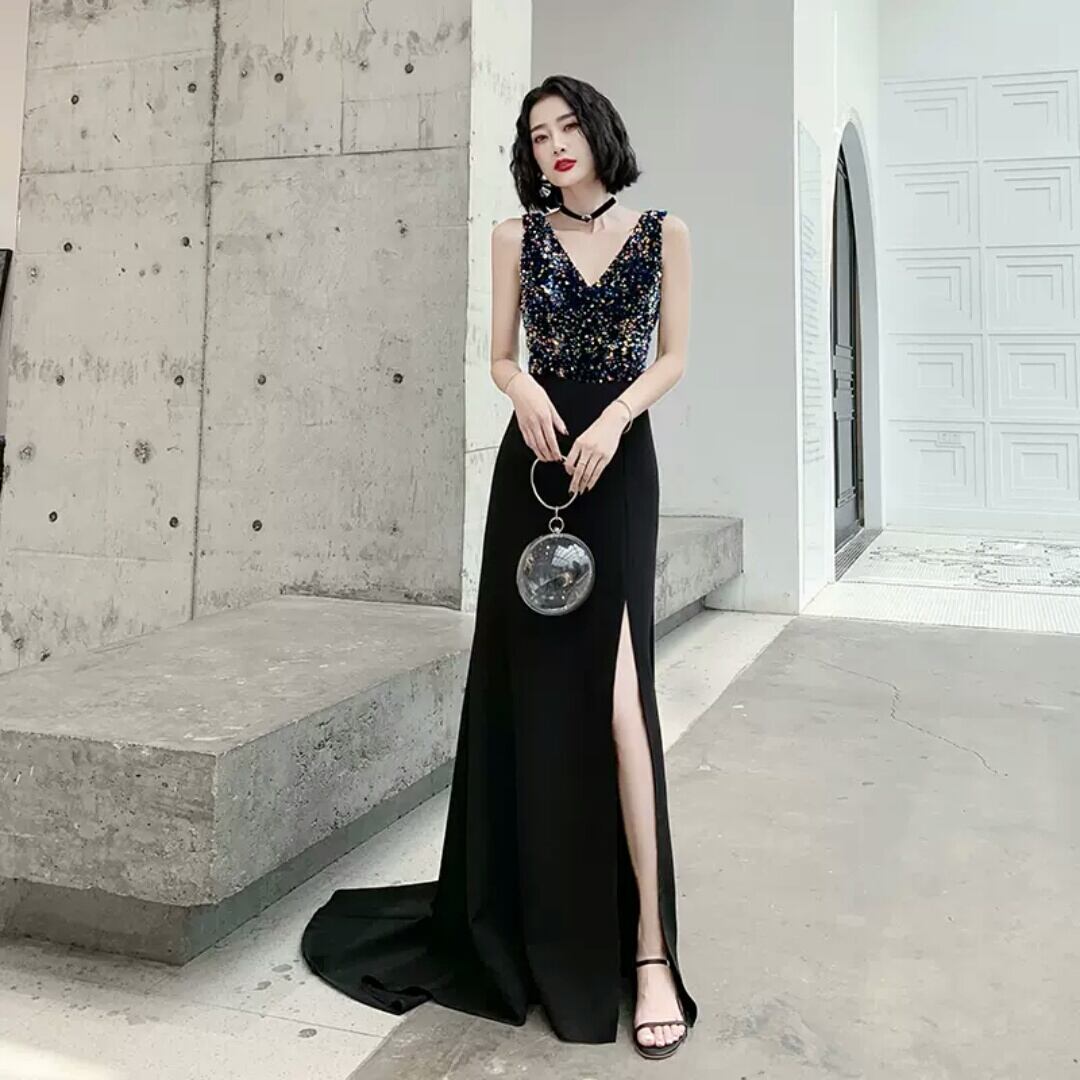 ハイエンド イブニング ドレス ラメ Vネック スリット ロング丈 シック パーティー イベント エレガント キレイめ セクシー 春 夏 小さいサイズ