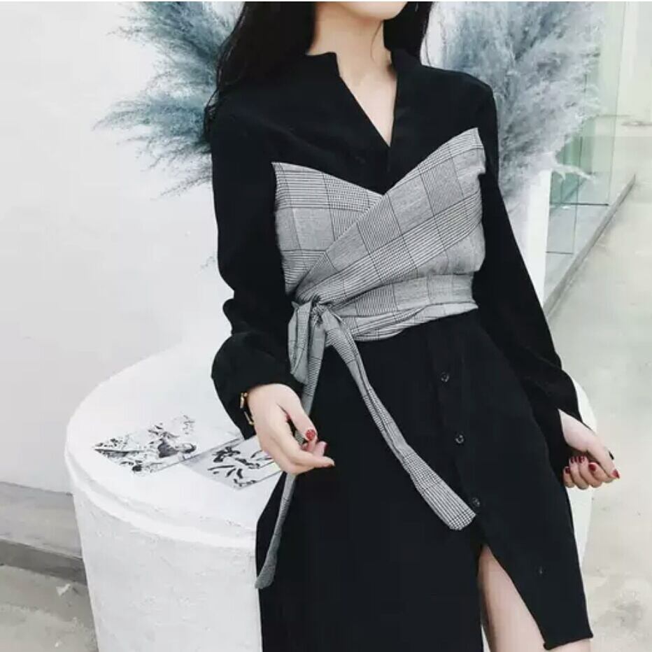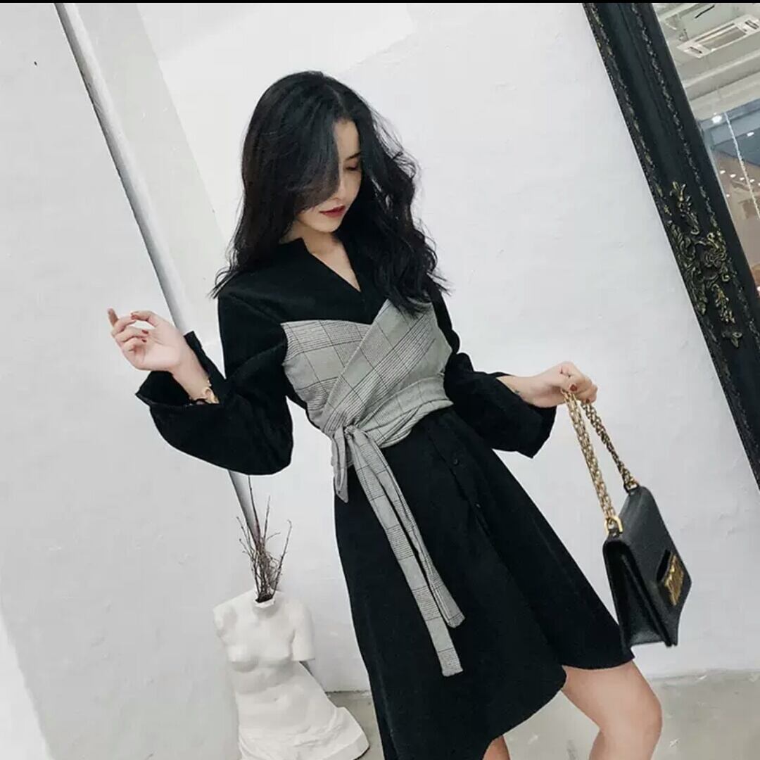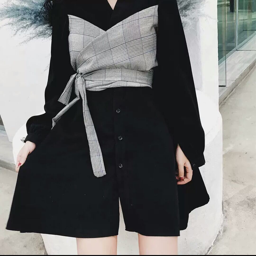 ショート丈 チェック柄 ウエストマーク シフォン ワンピース 大人 シック 可愛い キレイめ カジュアル お出かけ お買い物 デート 女子会 秋冬 春 通学 学生 通勤 韓国ファッション