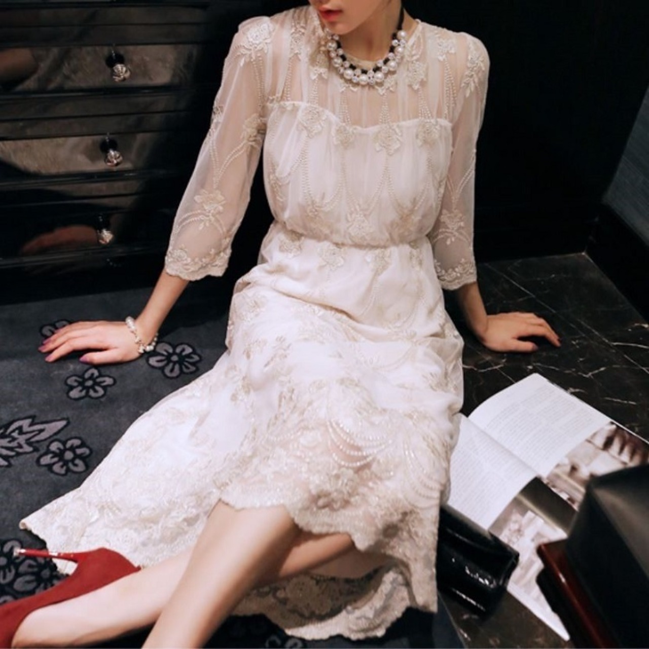 シフォンドレス パーティドレス フォーマル ワンピース ミモレ丈 7分袖 刺繍 レース レトロ 結婚式 二次会 お呼ばれ 春夏
