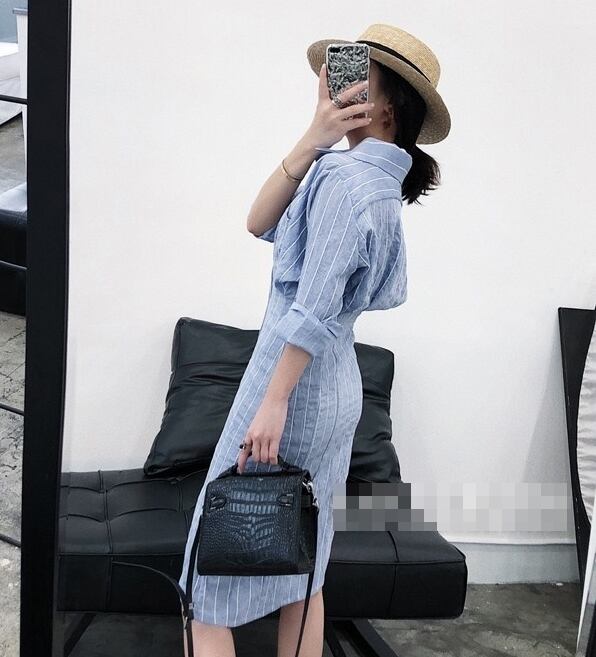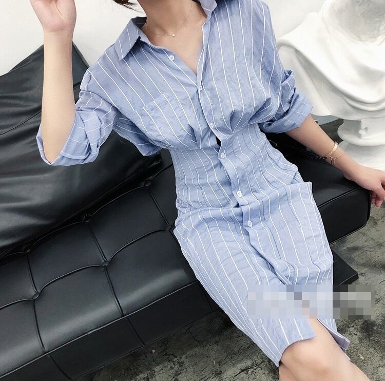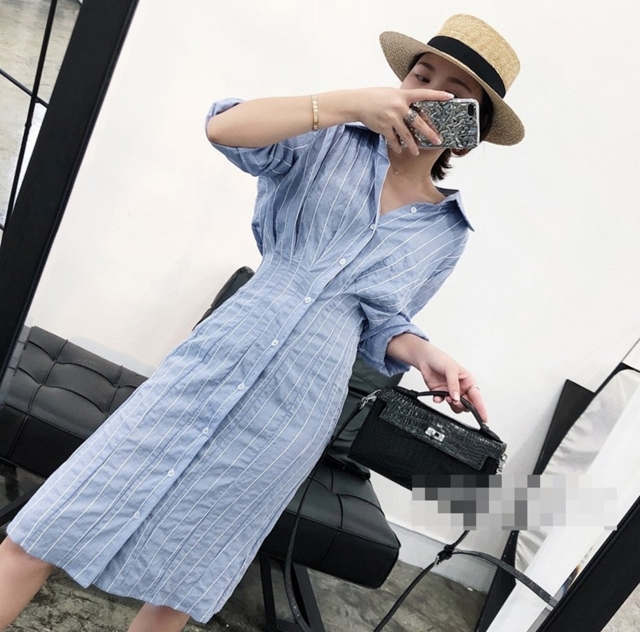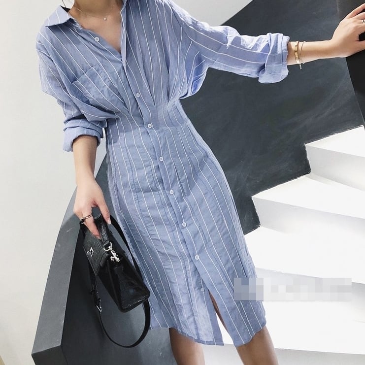 ワンピース シャツワンピース フロントボタン ウエストマーク スリム 長袖 ストライプ ミモレ丈 カジュアル デイリー 大人 レトロ 秋 夏 春