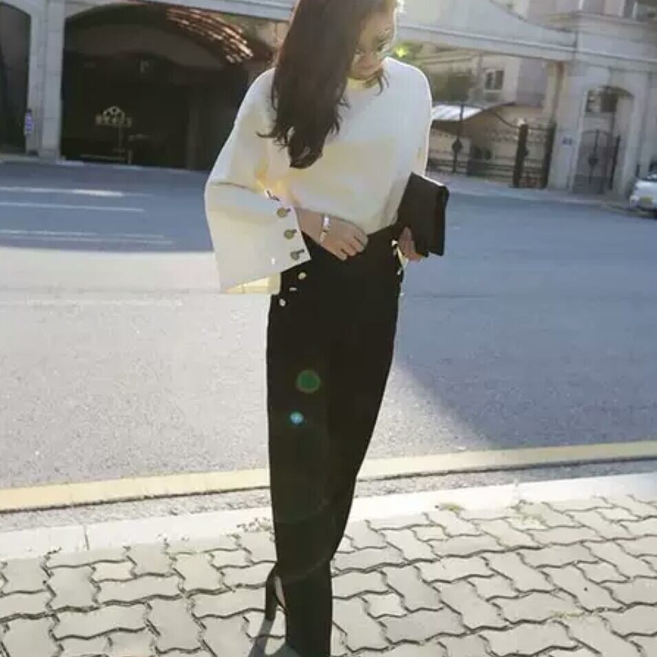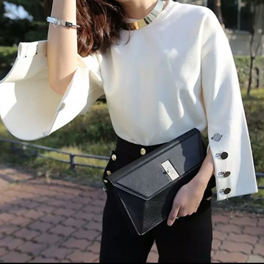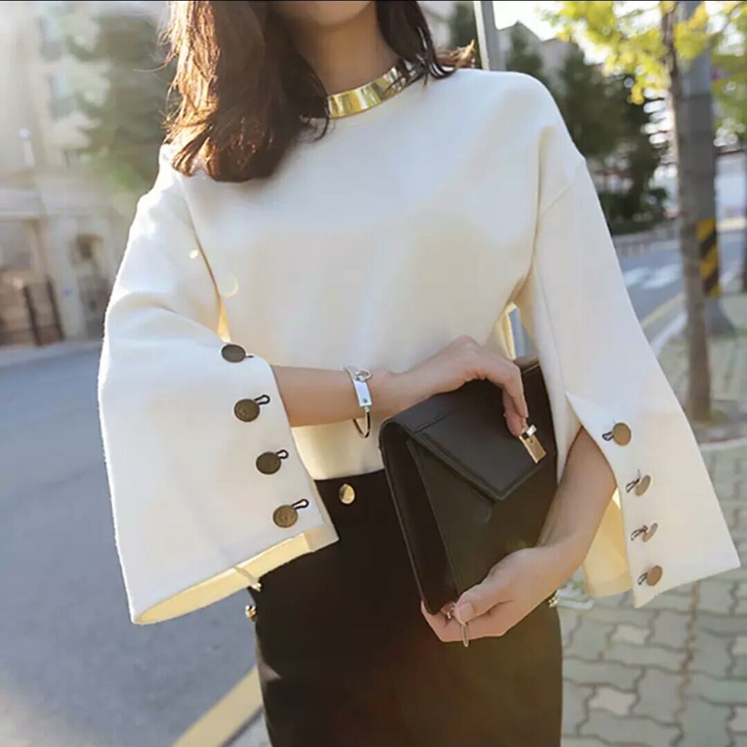 トランペットスリーブ ラウンドネック シャツ 無地 長袖 キレイめ カジュアル 可愛い お出かけ お買い物 デート 女子会 秋冬 春 夏 通学 学生 通勤 韓国ファッション