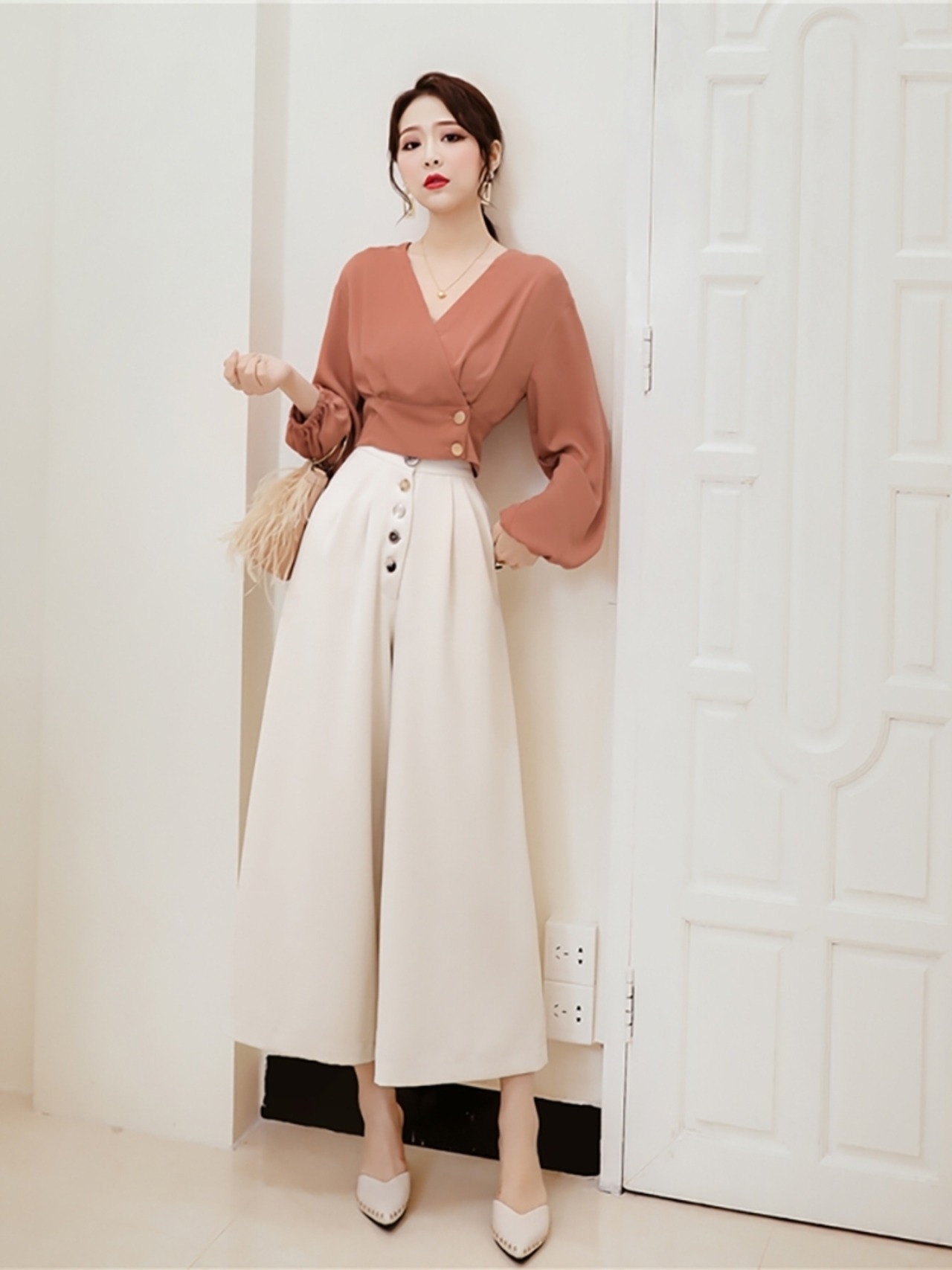 全2色トップス ブラウス カシュクール 長袖 スリム サイドボタン Vネック きれいめ カジュアル 上品 パフスリーブ 大人 デート 女子会 ショート 秋 春 夏