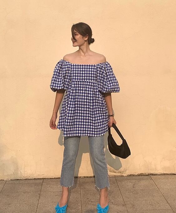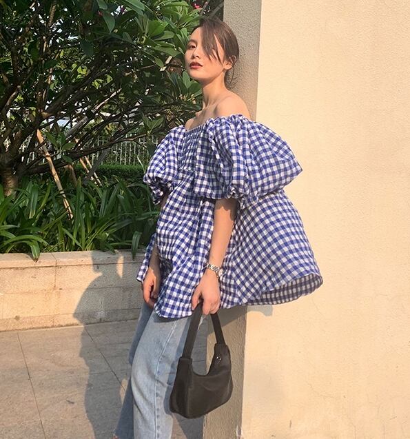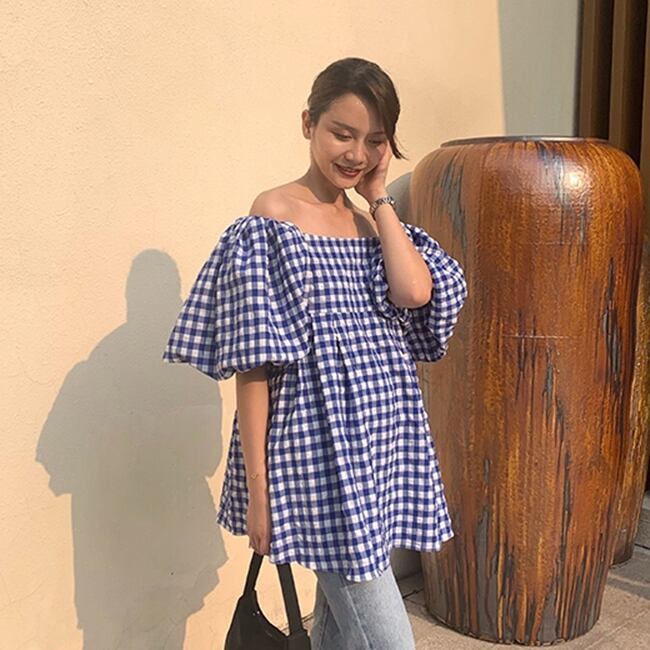 トップス ブラウス チュニック オフショルダー フレアスリーブ バルーンスリーブ 5分袖 フリル ゆったり オーバーサイズ 夏 カジュアル デイリー レトロ