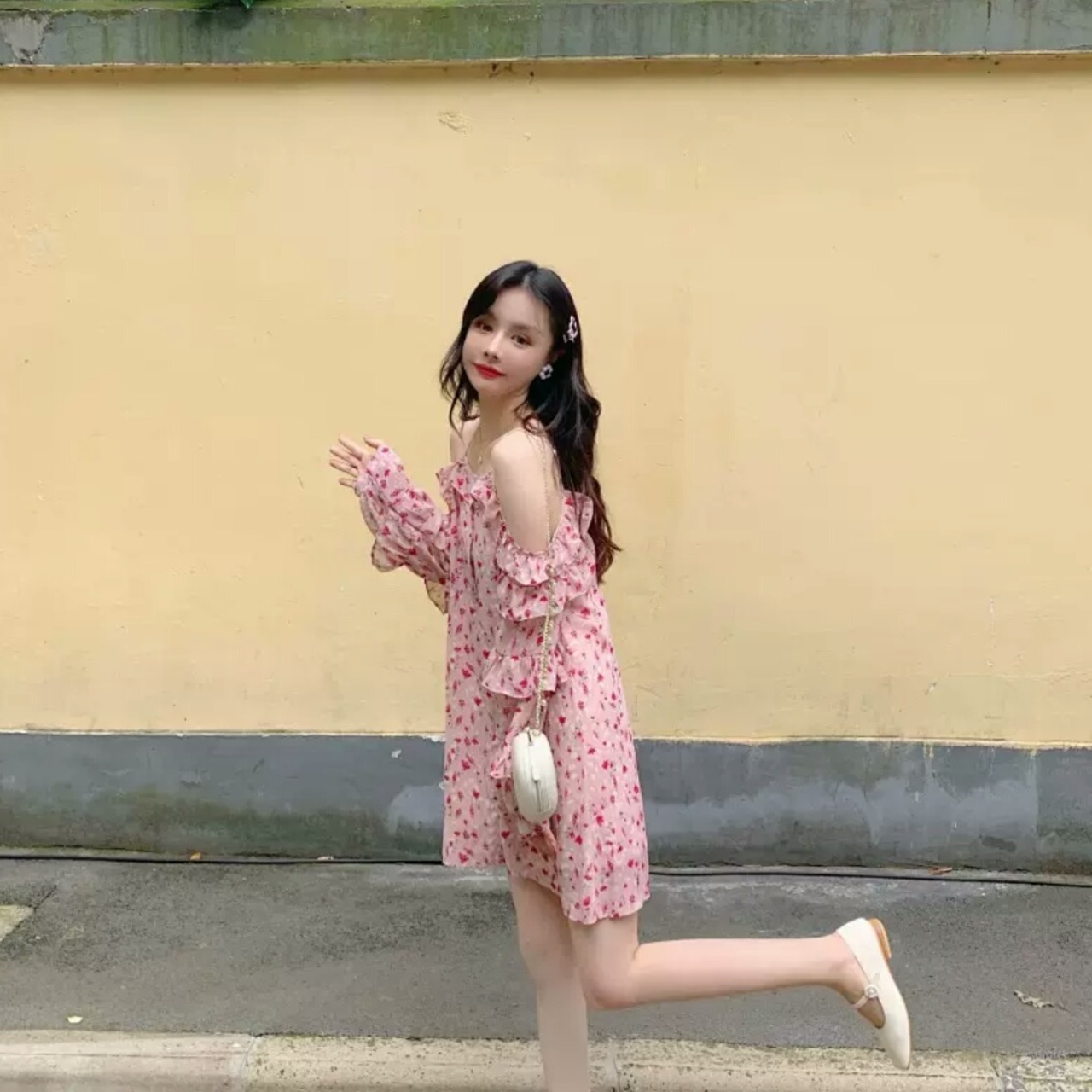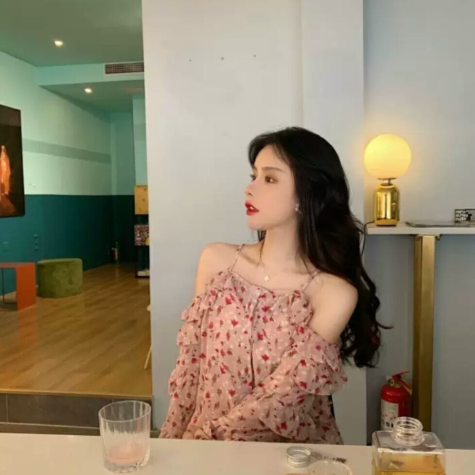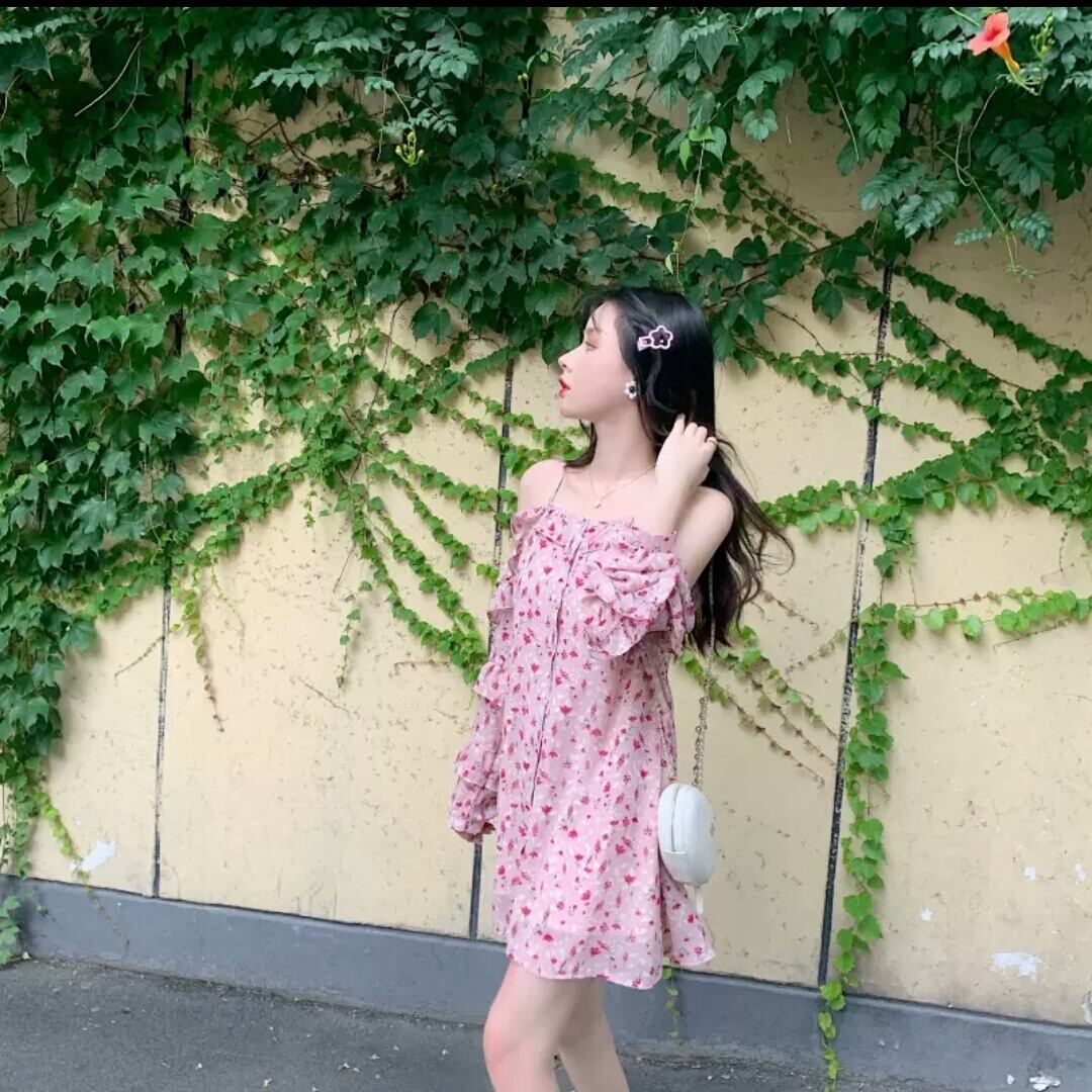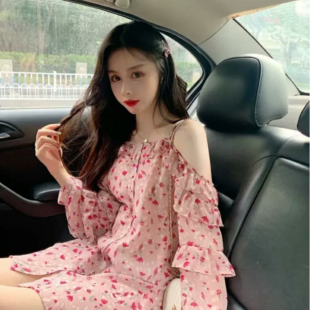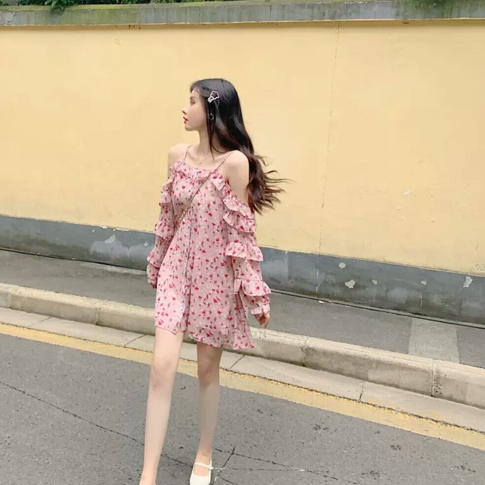 オフショルダー シフォン ストラップ ワンピース ドレス 花柄 ピンク フリル 大人 可愛い セクシー キレイめ カジュアル お出かけ お買い物 デート 女子会 春夏 通学 学生 通勤 韓国ファッション