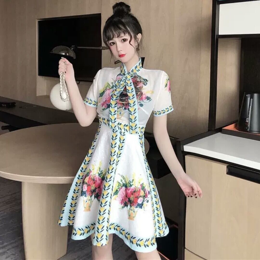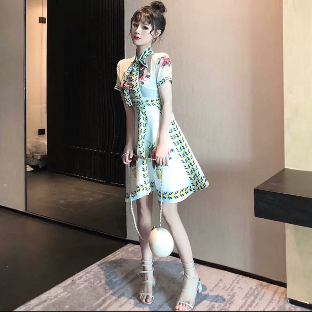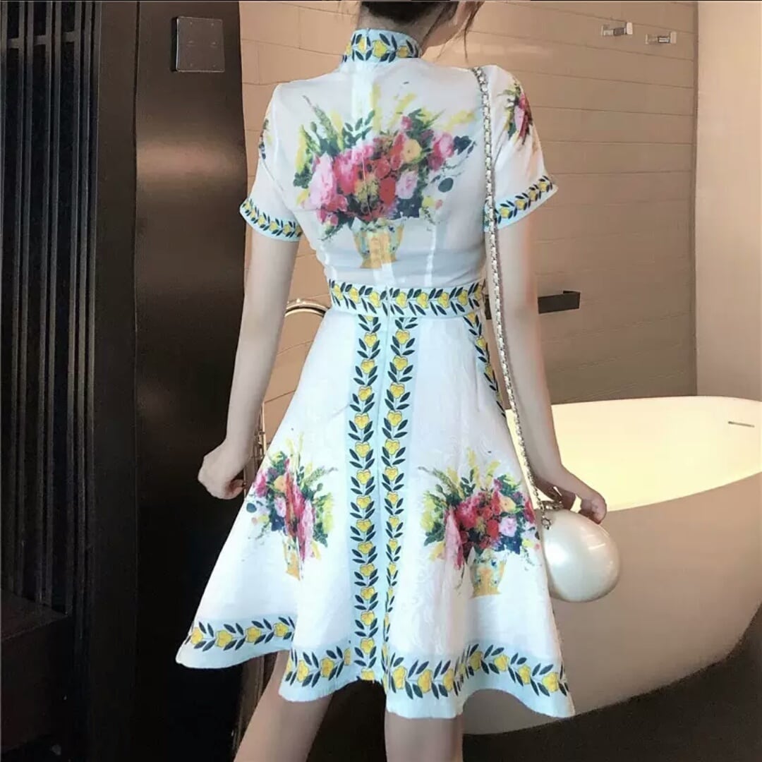 ショート丈 レトロ ハイウエスト 花柄 ドレス ワンピース 大人 可愛い エレガント キレイめ 上品 お出かけ お買い物 デート 女子会 春 夏 通勤 通学 学生 韓国ファッション