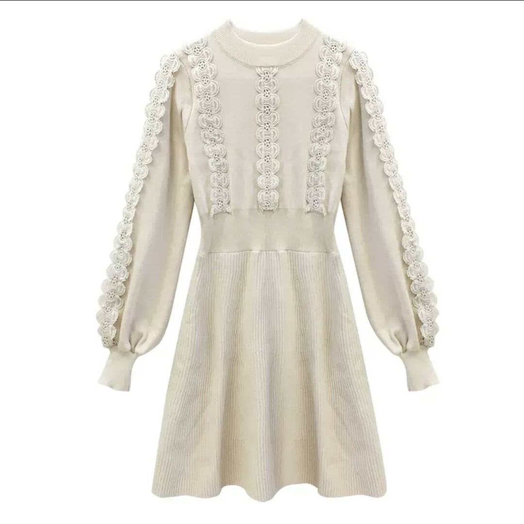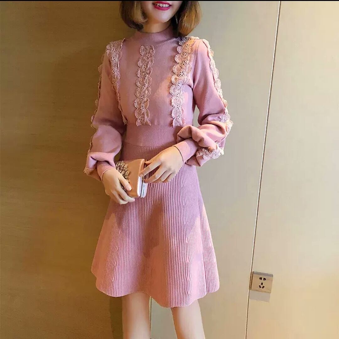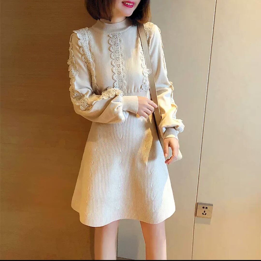 全3色 ショート丈 レース ステッチ 長袖 ニット ワンピース 大人 可愛い エレガント キレイめ 上品 お出かけ お買い物 デート 女子会 秋冬 春 通学 学生 通勤 韓国ファッション