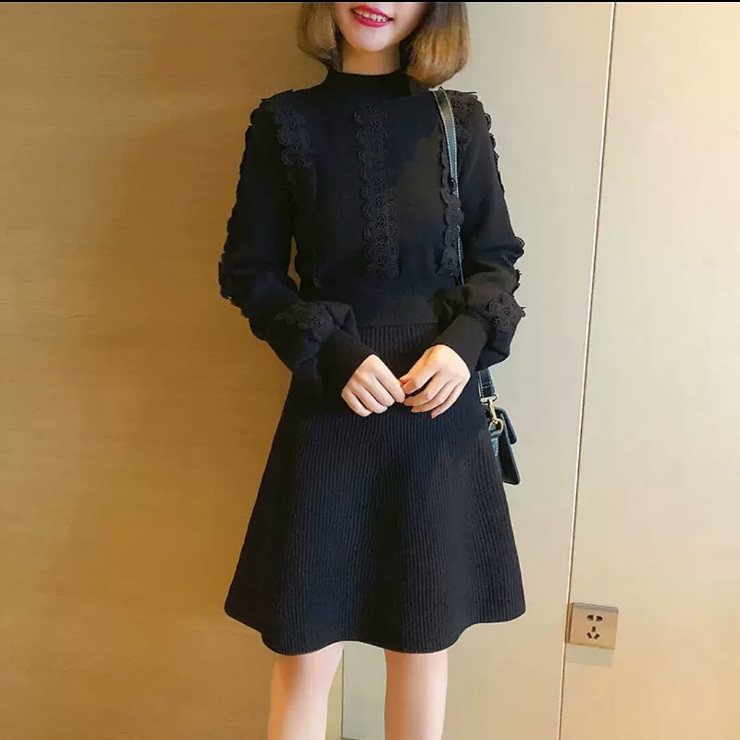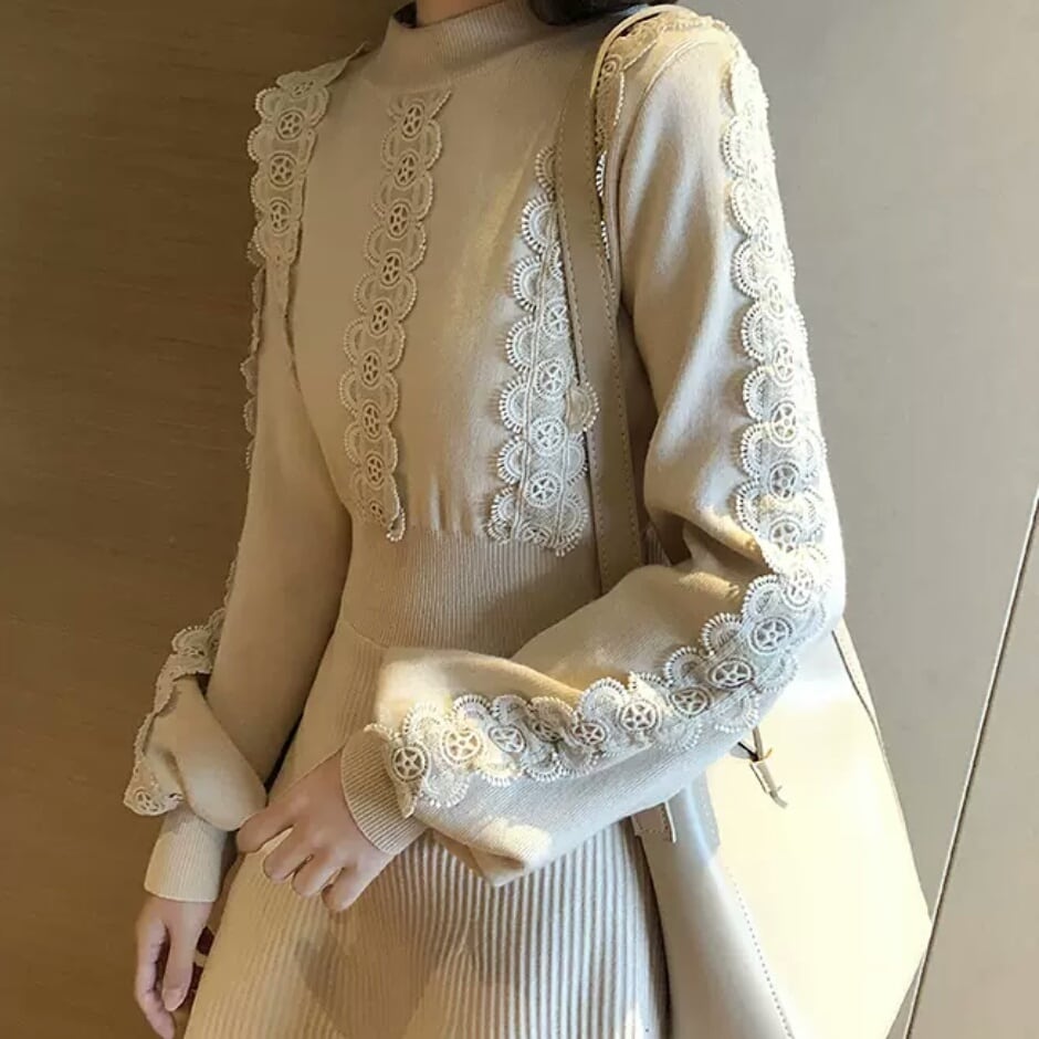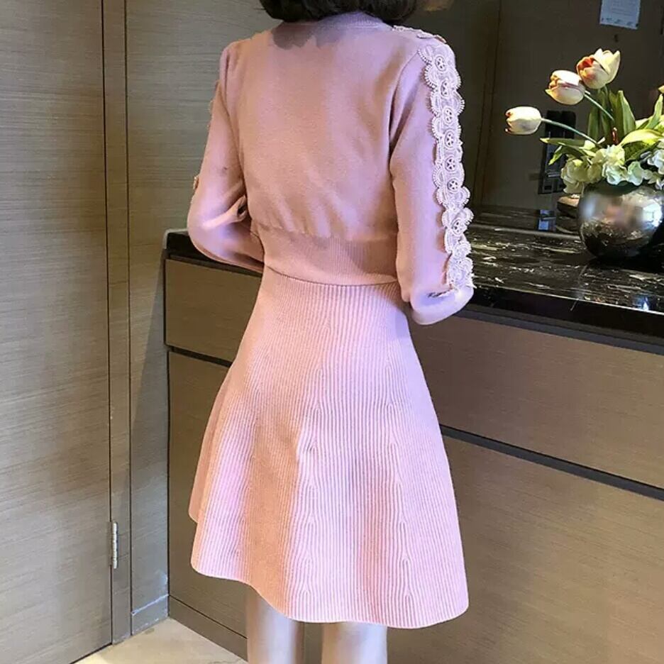 全3色 ショート丈 レース ステッチ 長袖 ニット ワンピース 大人 可愛い エレガント キレイめ 上品 お出かけ お買い物 デート 女子会 秋冬 春 通学 学生 通勤 韓国ファッション