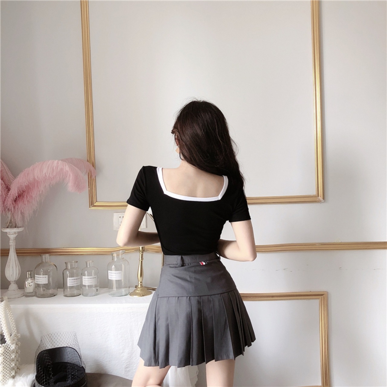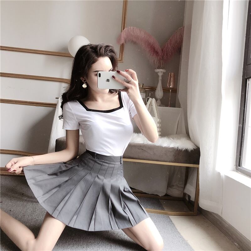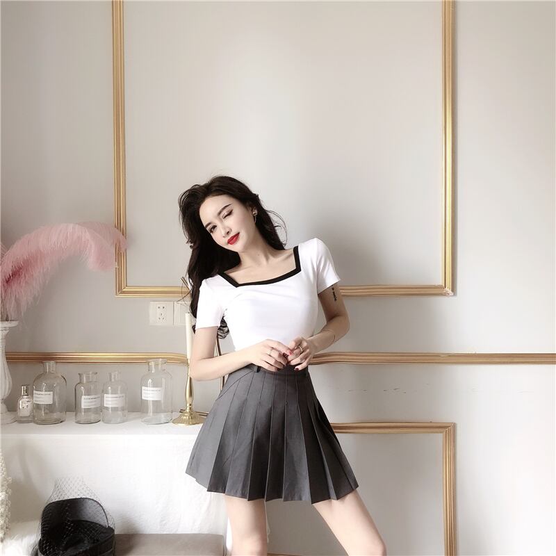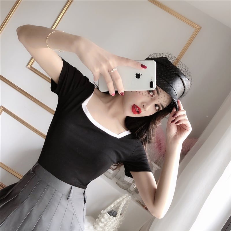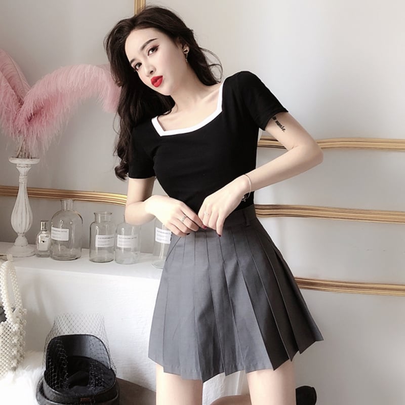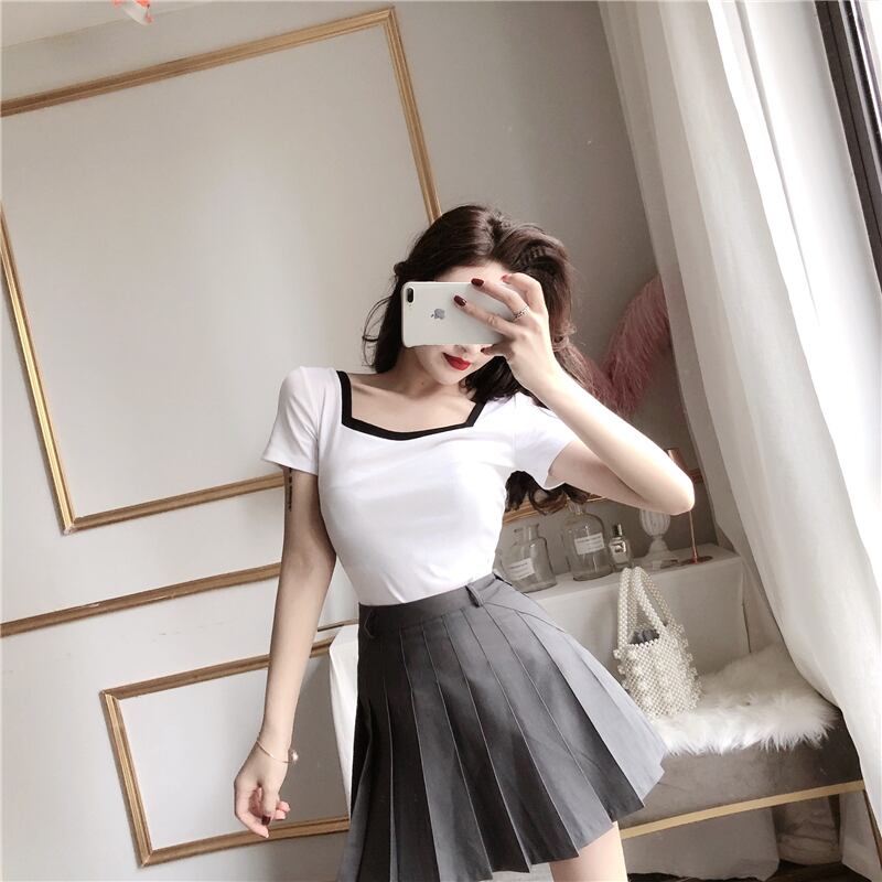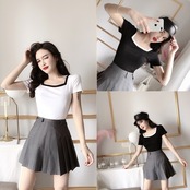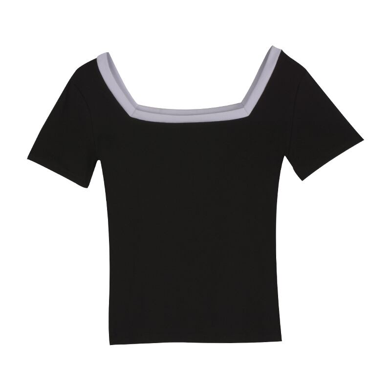 全2色 トップス Tシャツ バイカラー モノトーン 半袖 スクエアネック 無地 シンプル ベーシック カジュアル デイリー 大人 夏