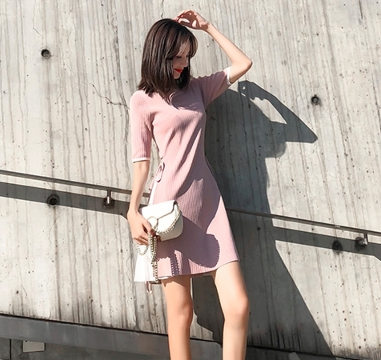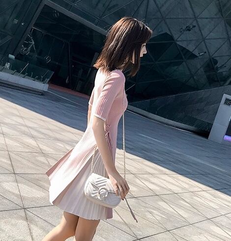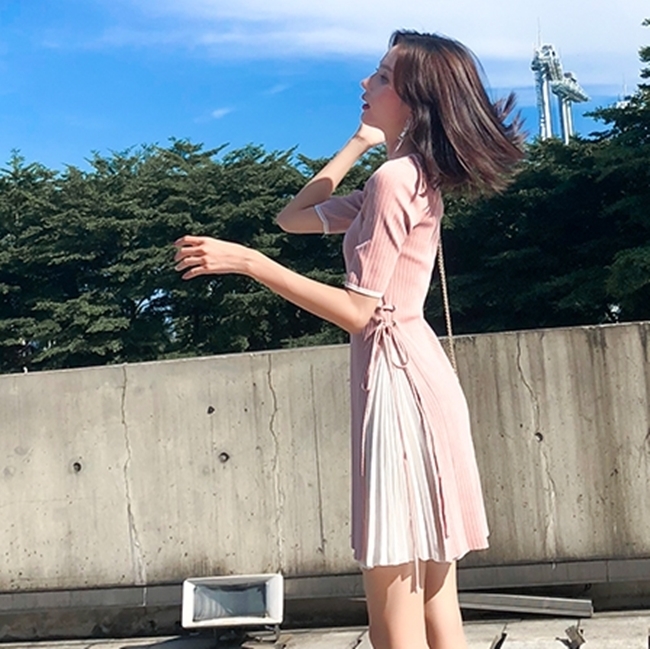 サイドのスリットから見えるプリーツ加工がおしゃれでユニークなデザインのミニ丈ワンピースです。
