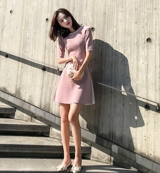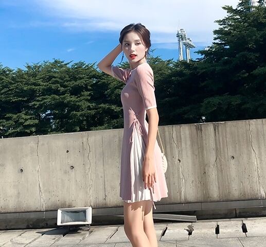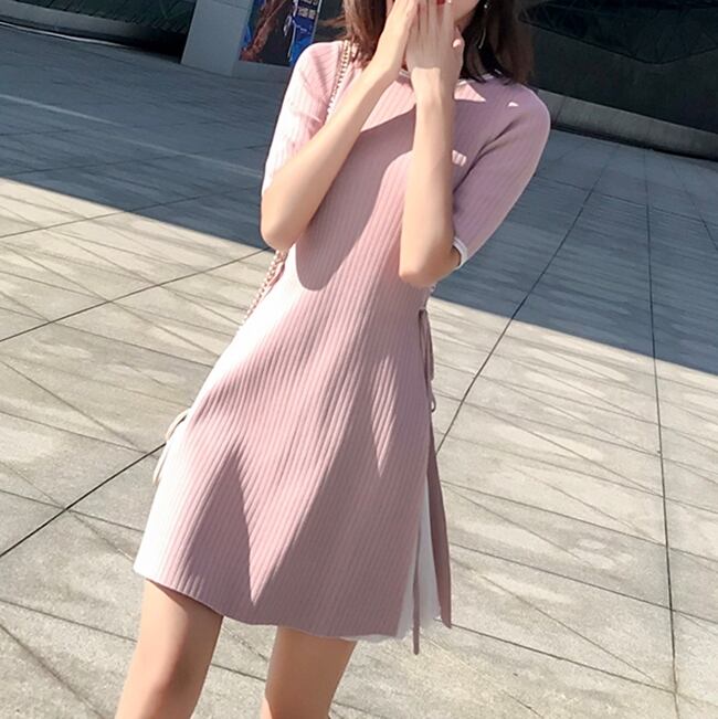 ワンピース スリット ミニ丈 クルーネック フリル 5分袖 スリム フレア 大人可愛い カジュアル きれいめ デート ガーリー 女子会 春 夏