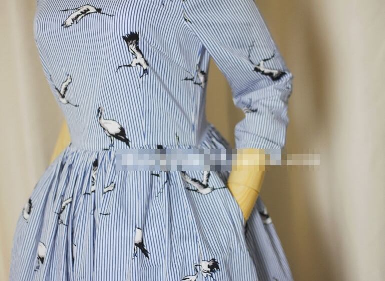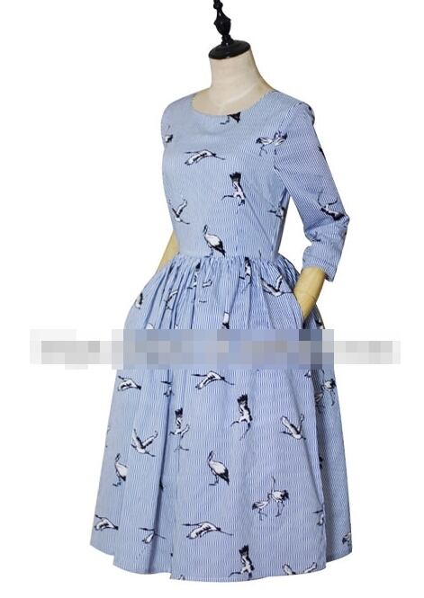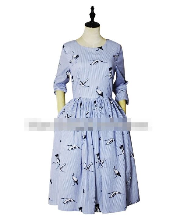 ワンピース ミモレ丈 鶴柄 ラウンドネック フレア 7分袖 Aライン カジュアル きれいめ 大人可愛い 上品 アニマル柄 ストライプ柄レトロ 春 夏