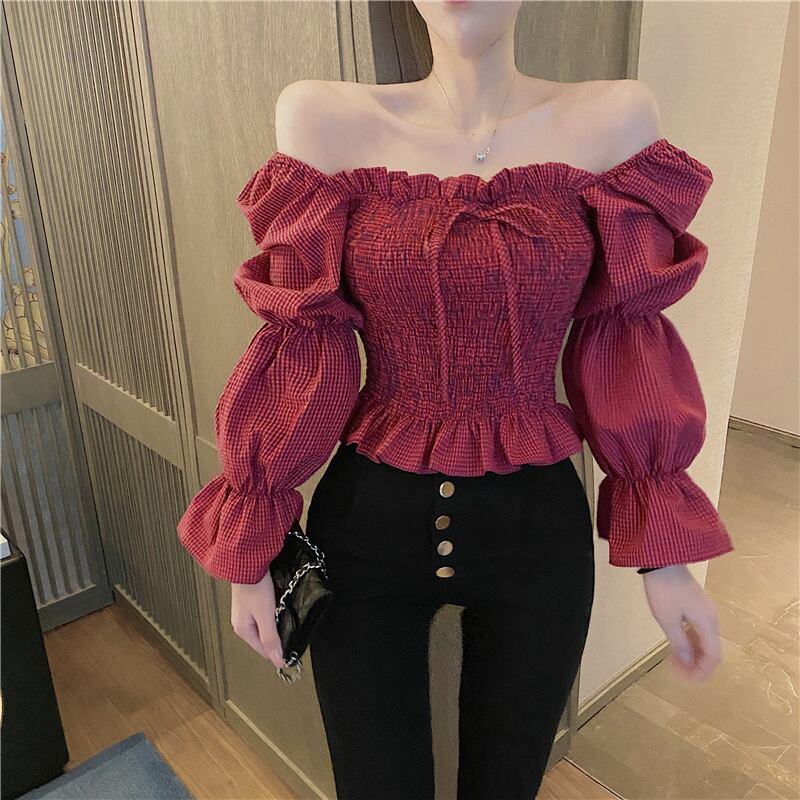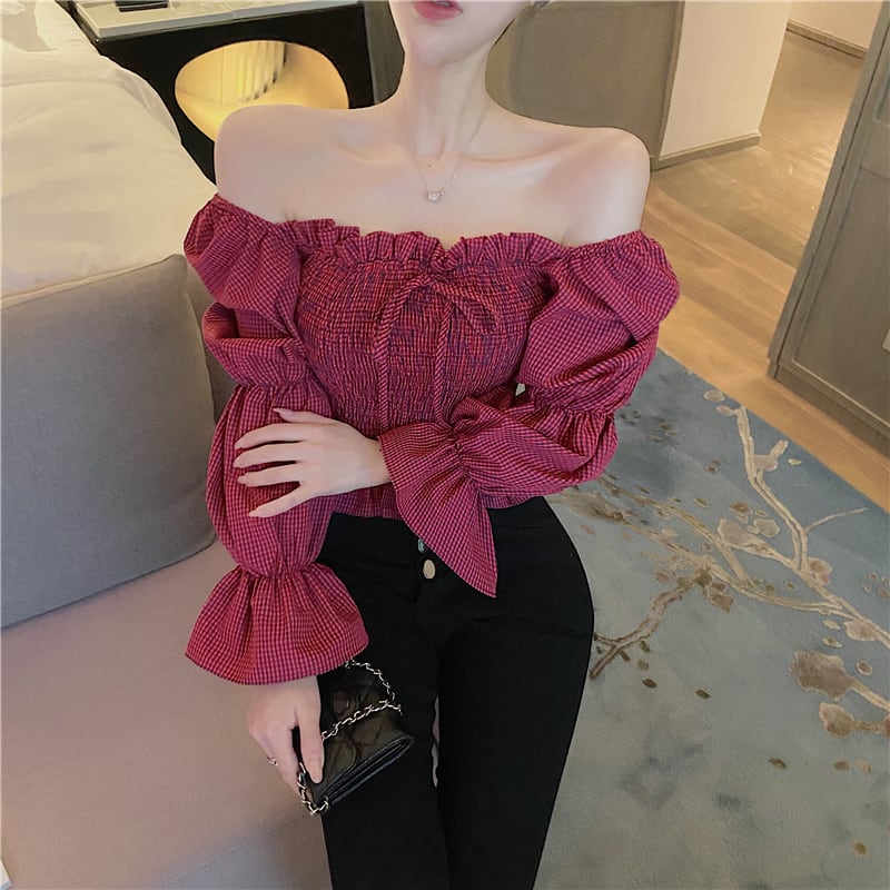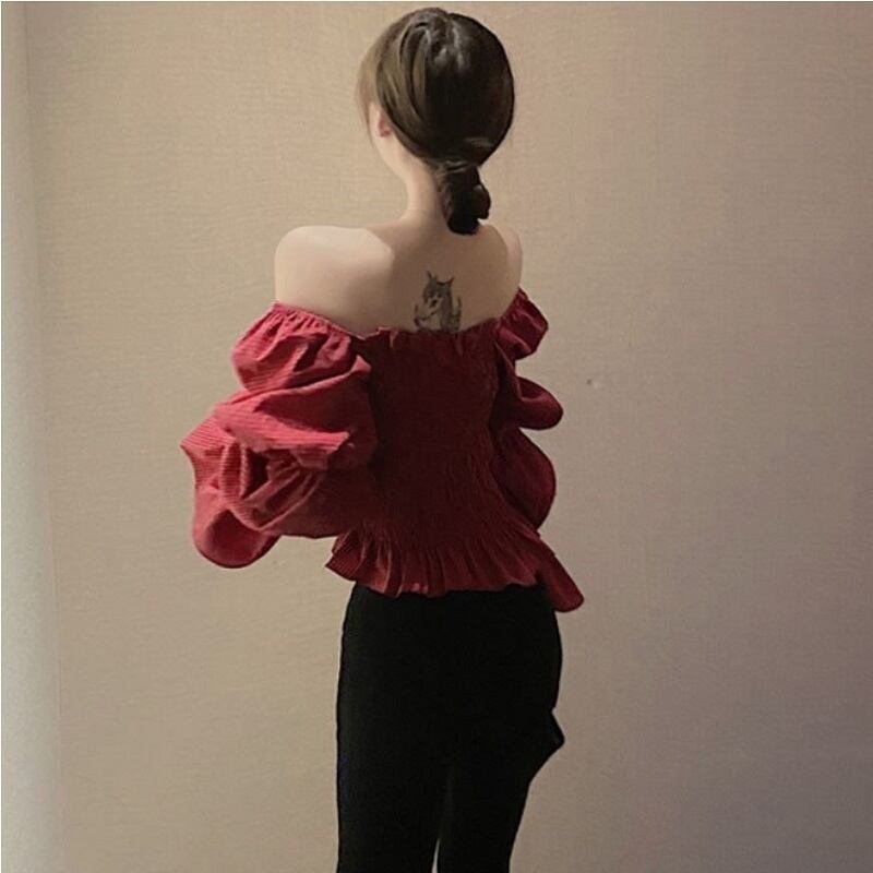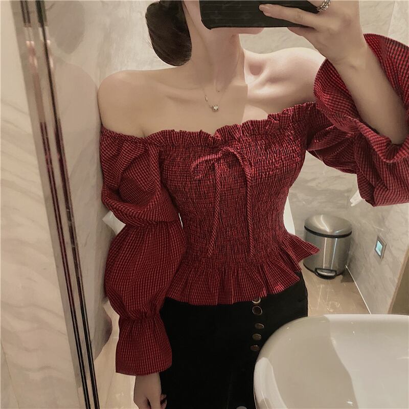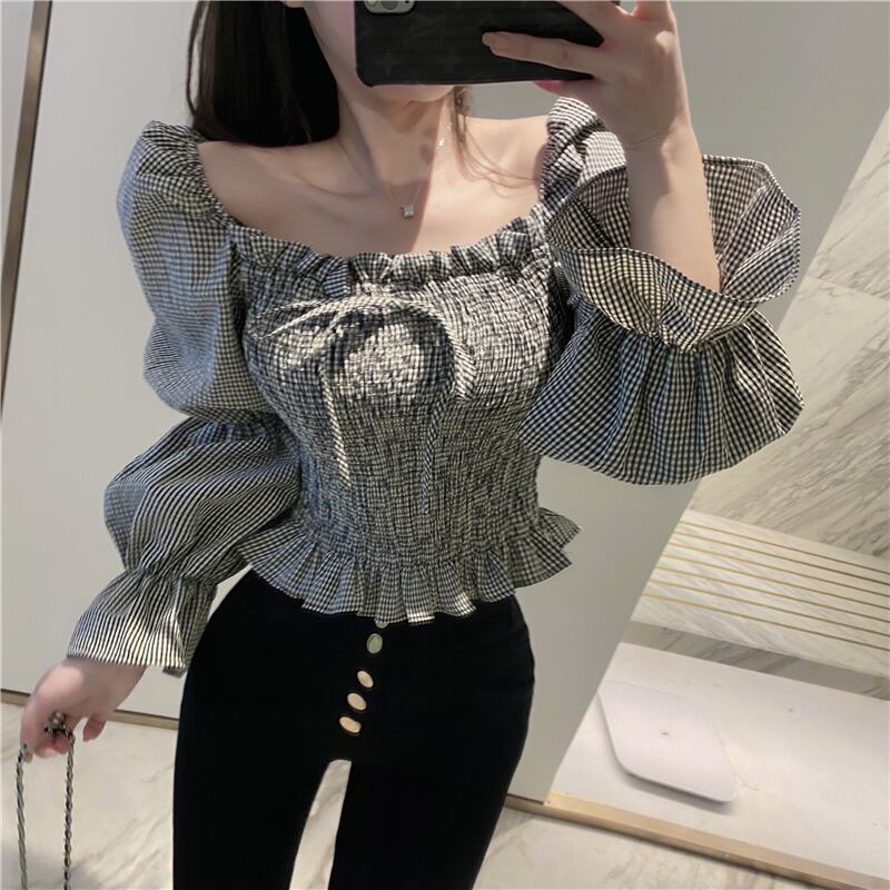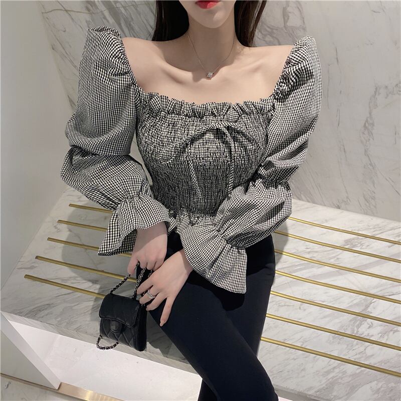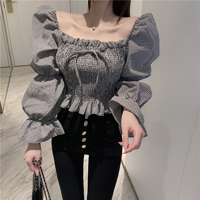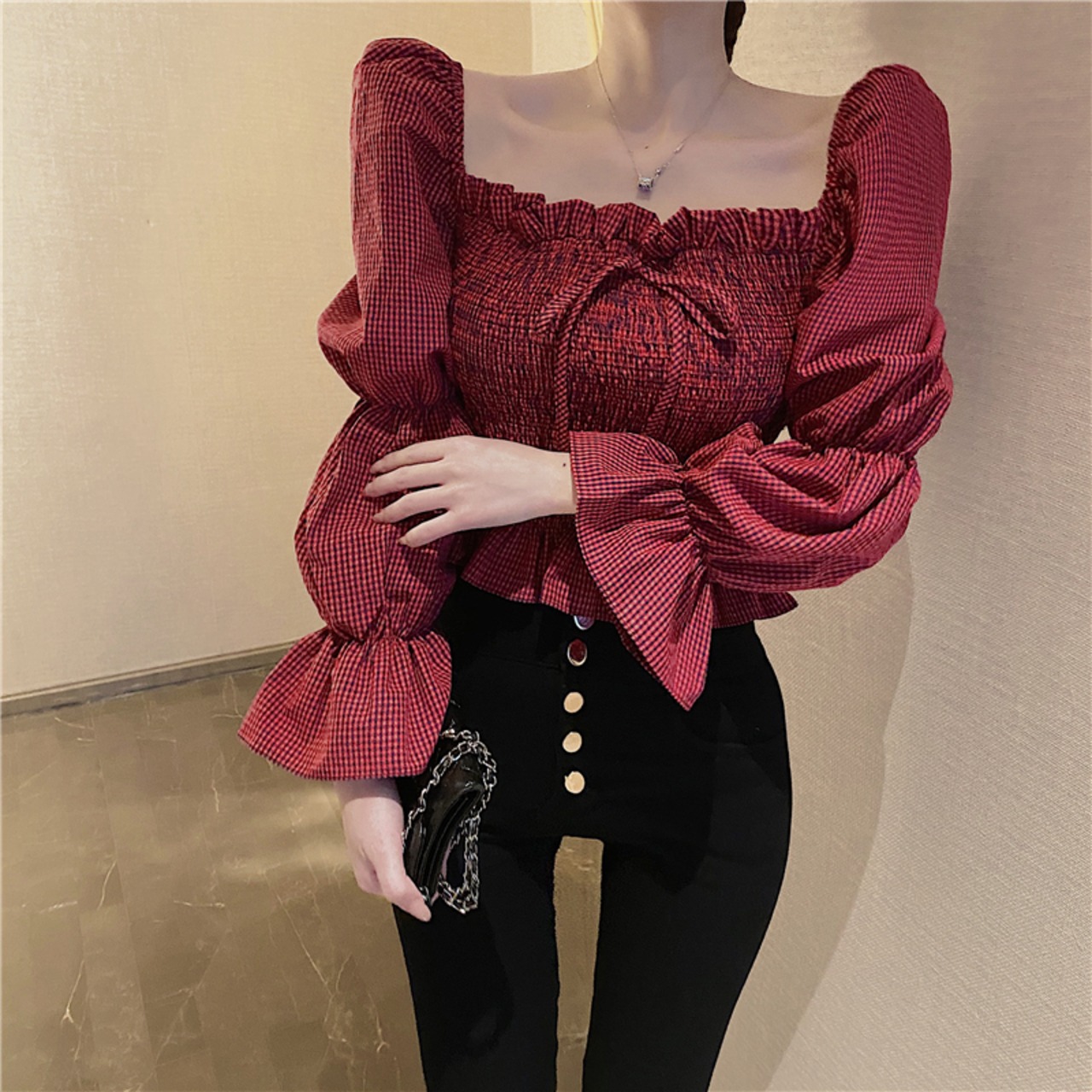 全2色 シャーリングブラウス パフスリーブ オーバーブラウス スクエアネック 長袖 ショート丈 カジュアル きれいめ かわいい お出かけ デート ブラック レッド 夏