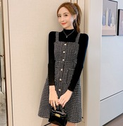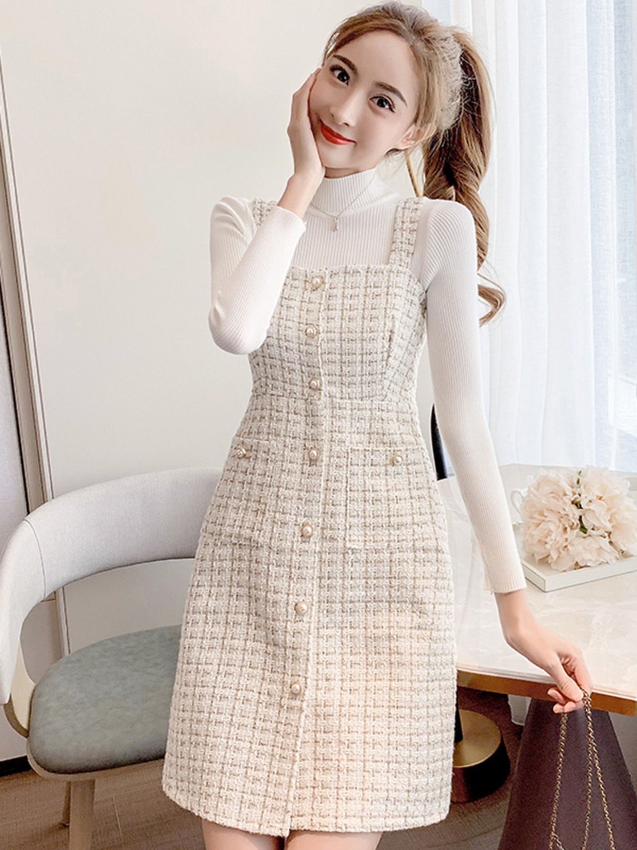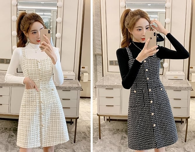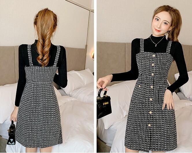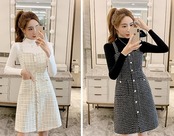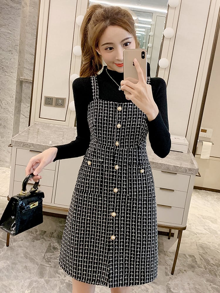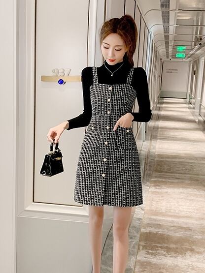 全2色 セットアップ ツーピース セーター ニット ワンピース ジャンパースカート ツイード フロントボタン ハイネック ショート丈 きれいめ カジュアル デート 女子会 上品 秋 冬 春