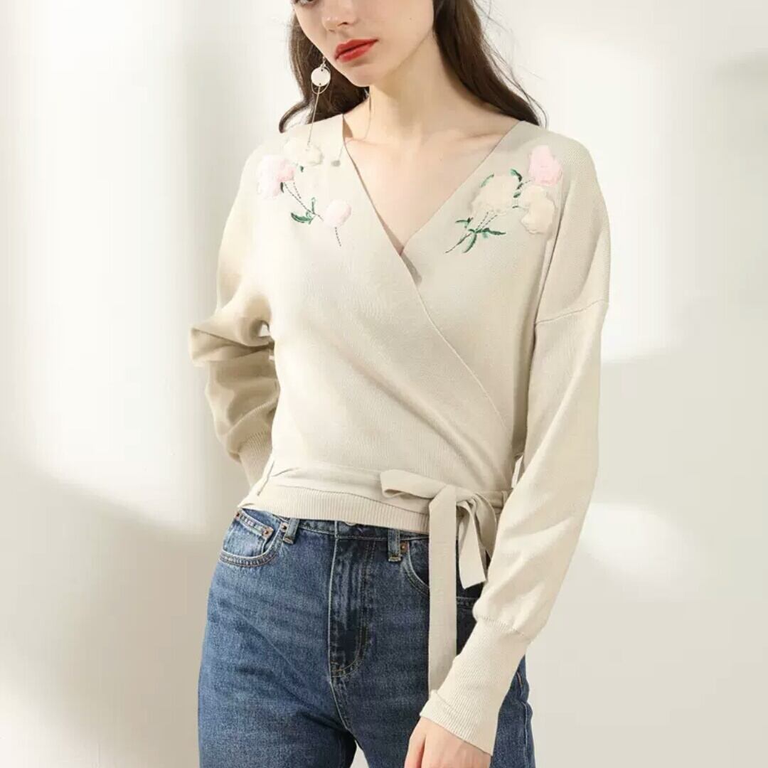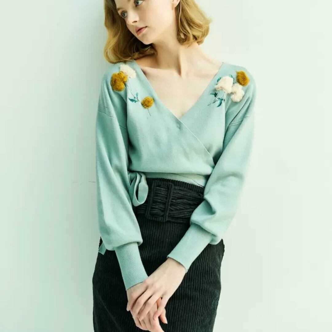 フラワー刺繍のクロスデザインニットトップス♪