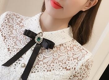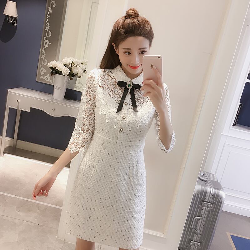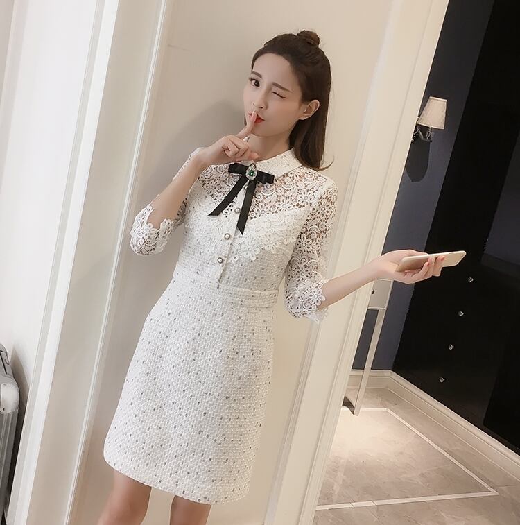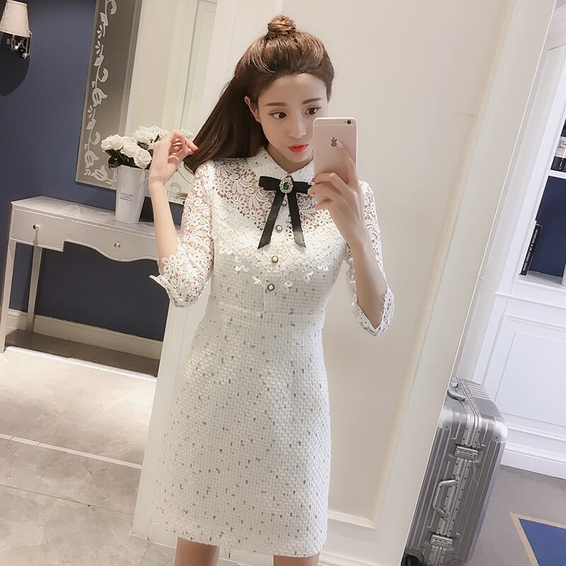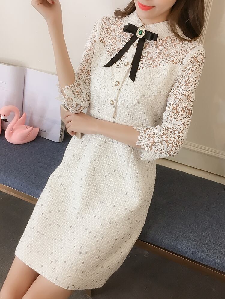 ワンピース ドレス ショート丈 ボウタイネック ボタン ビジュー 花柄 シースルー ウエストマーク 7分袖 レース モノトーン 上品 シック エレガント きれいめ お呼ばれ パーティー 夏 春
