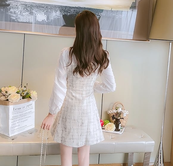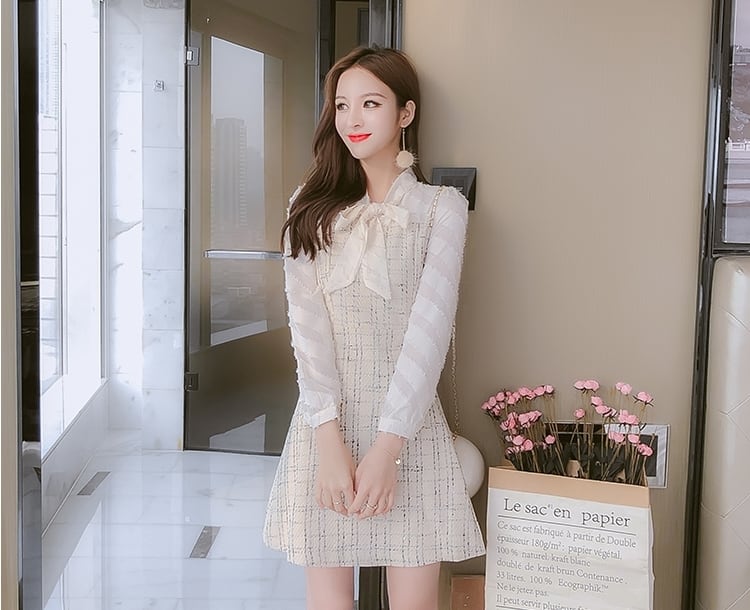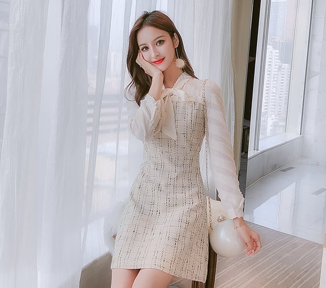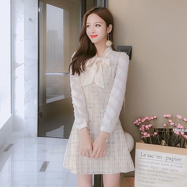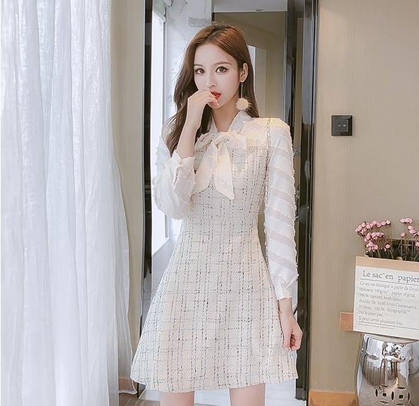 ワンピース ドレス ミニ丈 ボウタイネック ツイード 可愛い ガーリー 長袖 レース 上品 シック エレガント 大人 きれいめ お呼ばれ パーティー 女子会 デート 夏 春