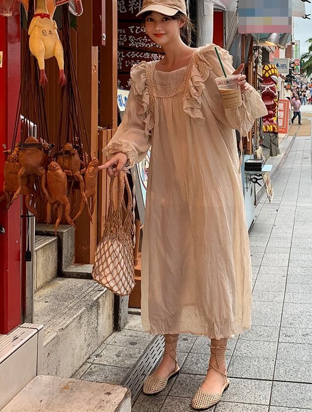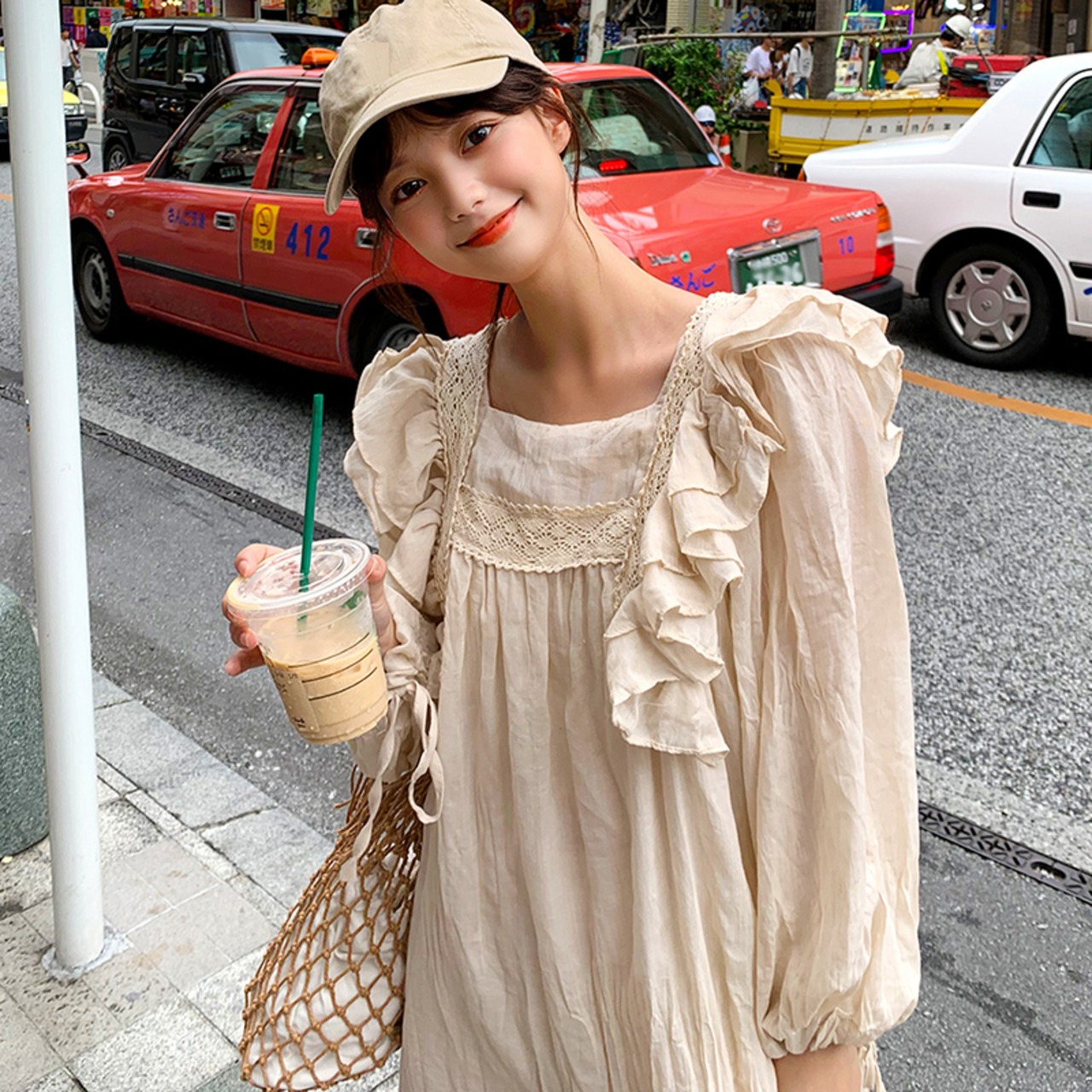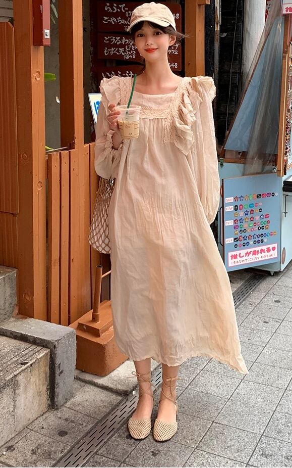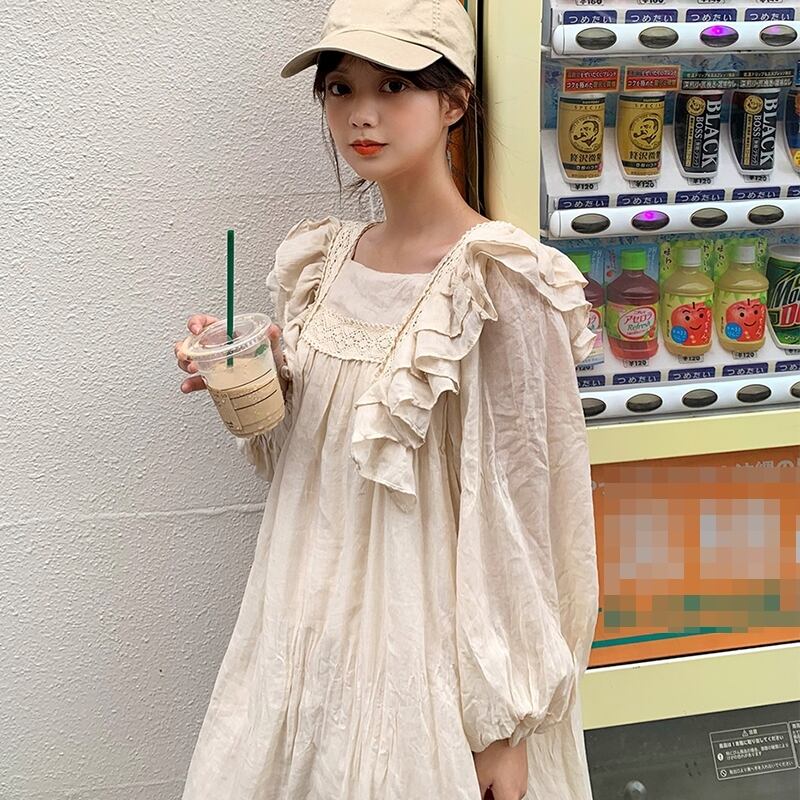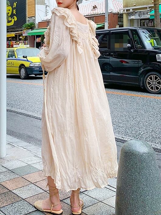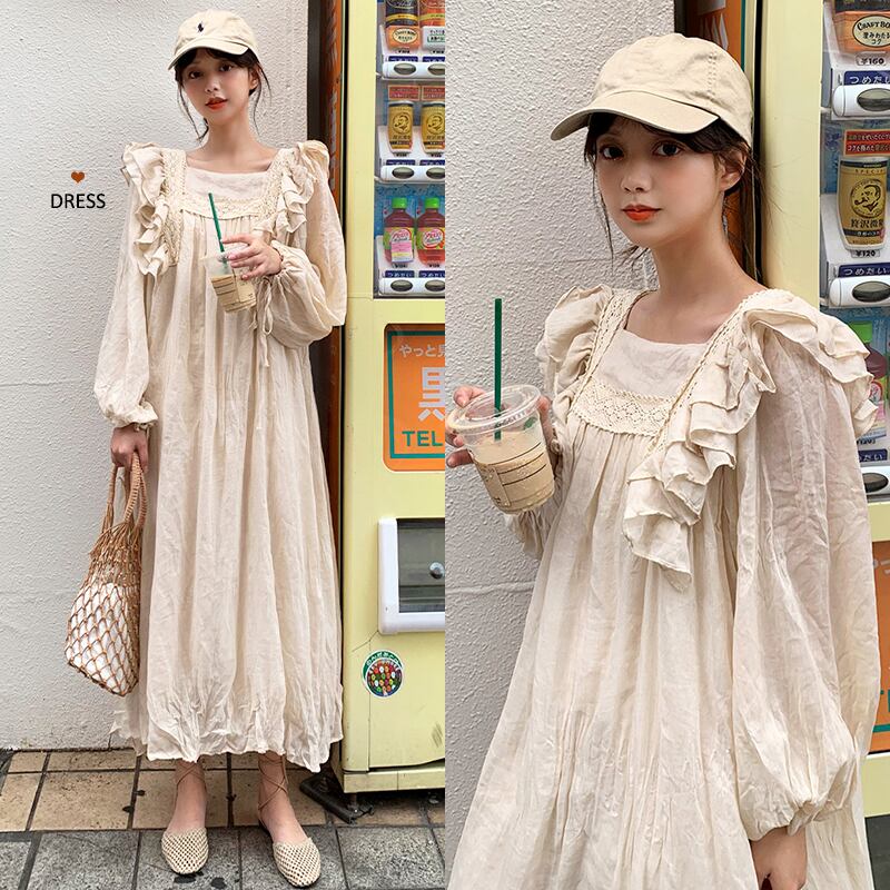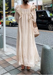ワンピース ロング丈 パフスリーブ 袖コンシャス ゆったり 長袖 ビッグシルエット フリル フレア スクエアネック ナチュラル 森ガール 韓国ファッション 可愛い カジュアル デイリー 夏 春