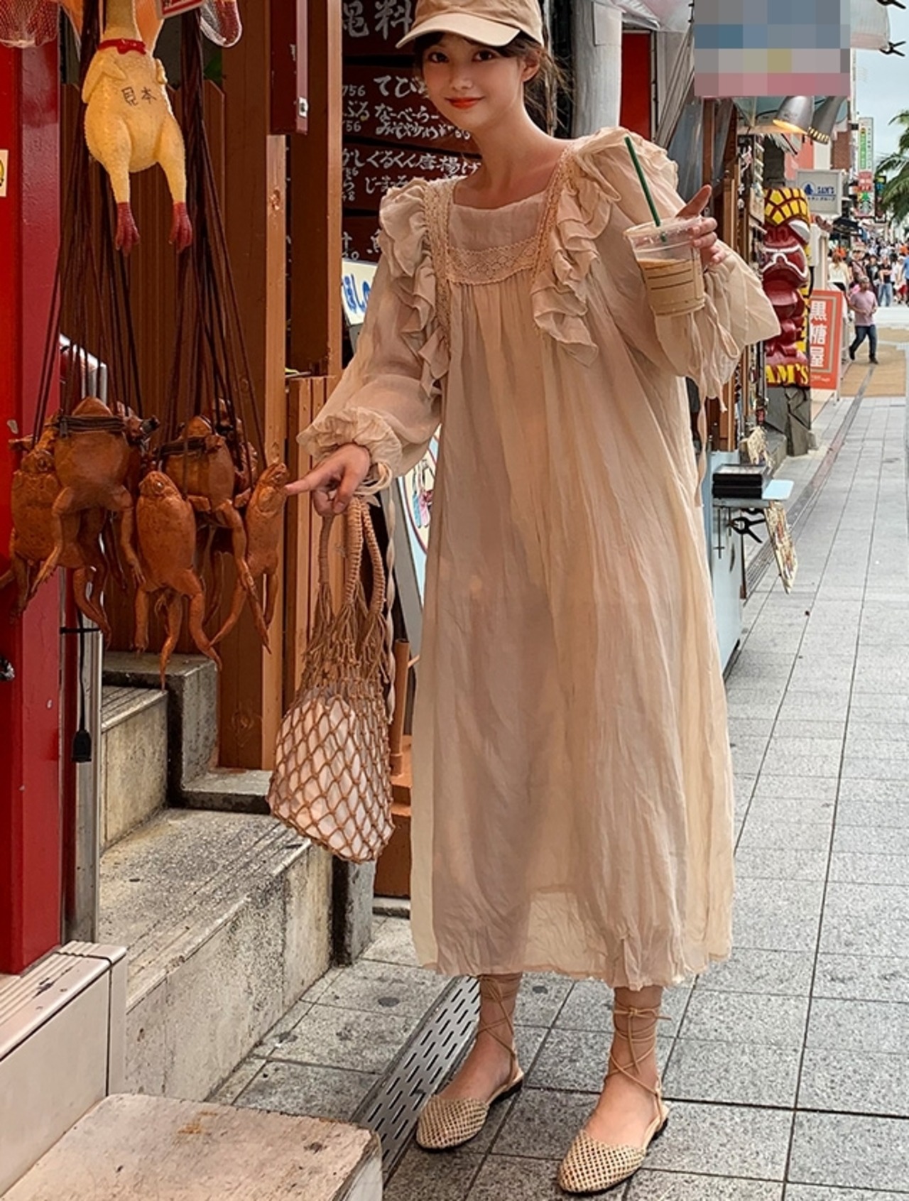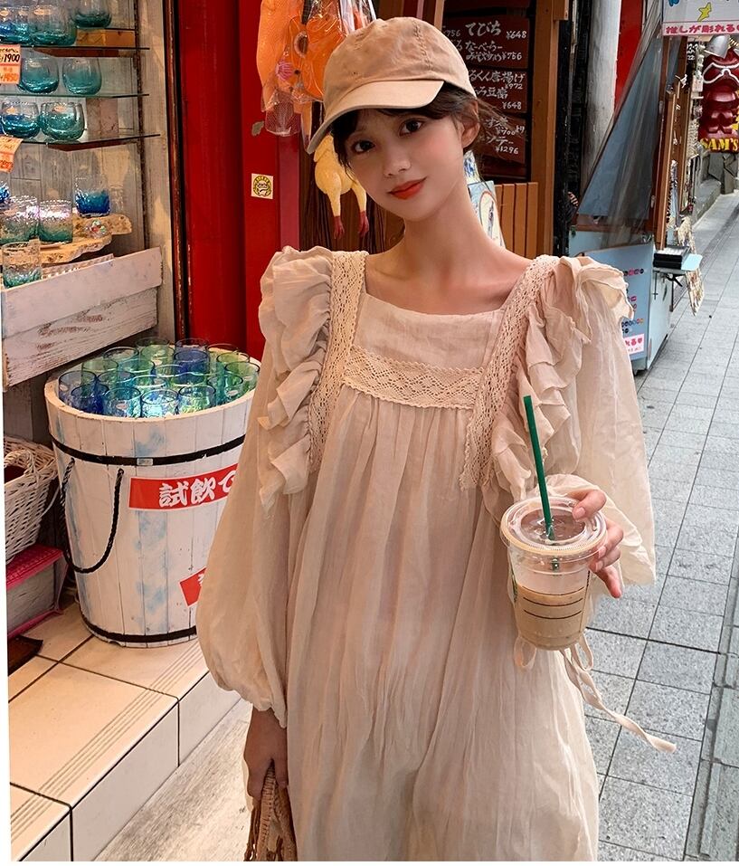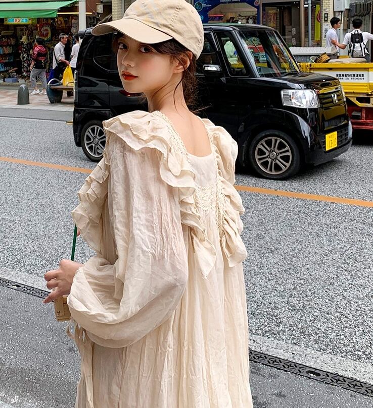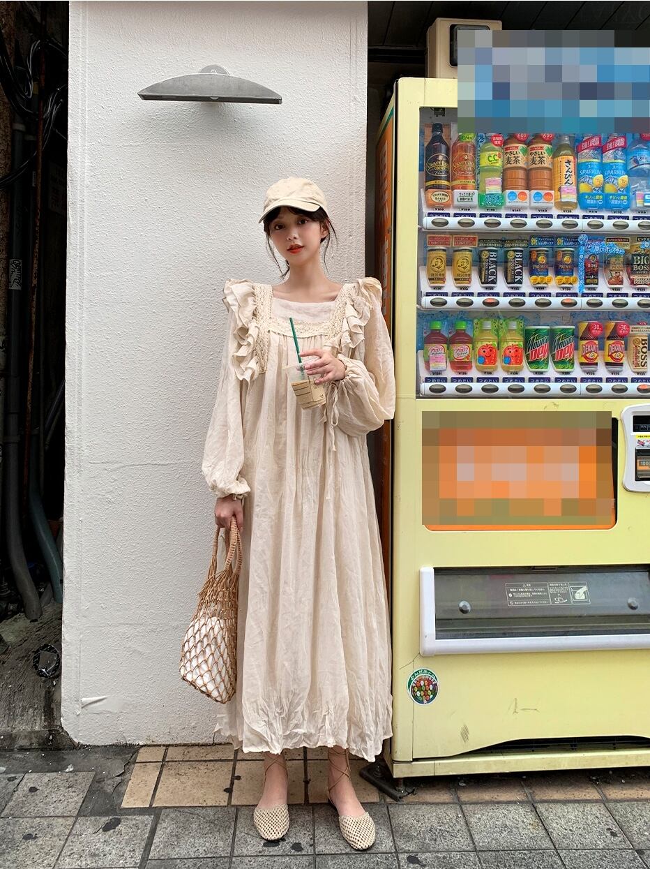 ワンピース ロング丈 パフスリーブ 袖コンシャス ゆったり 長袖 ビッグシルエット フリル フレア スクエアネック ナチュラル 森ガール 韓国ファッション 可愛い カジュアル デイリー 夏 春