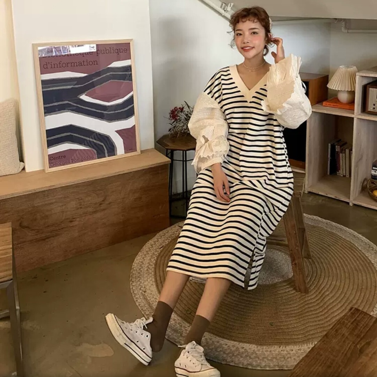 袖フリル Vネック ボーダー ワンピース ロング丈 ゆったり オーバーサイズ お出かけ お買い物 デート 女子会 春 夏 秋 大人 キレイめ 可愛い カジュアル 通学 学生 通勤 韓国ファッション